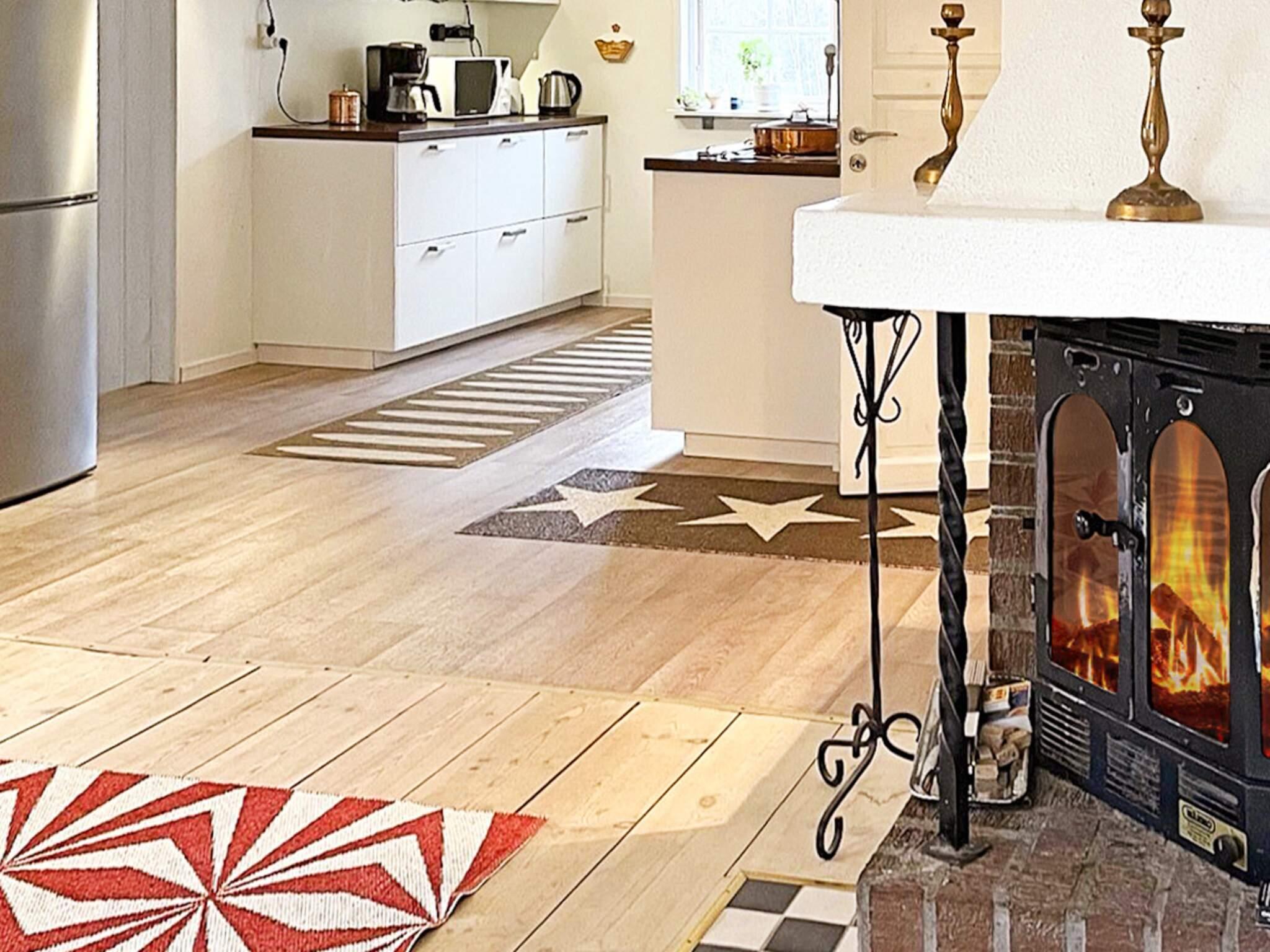 Öppet kök med matplats och ett vardagsrum i vinkel med öppen spis-kamin som man kan elda i, här finns också en bekväm soffa, TV och Wifi. Det finns två sovrum med dubbelsängar. Badrummet har WC, dusch och tvättmaskin.