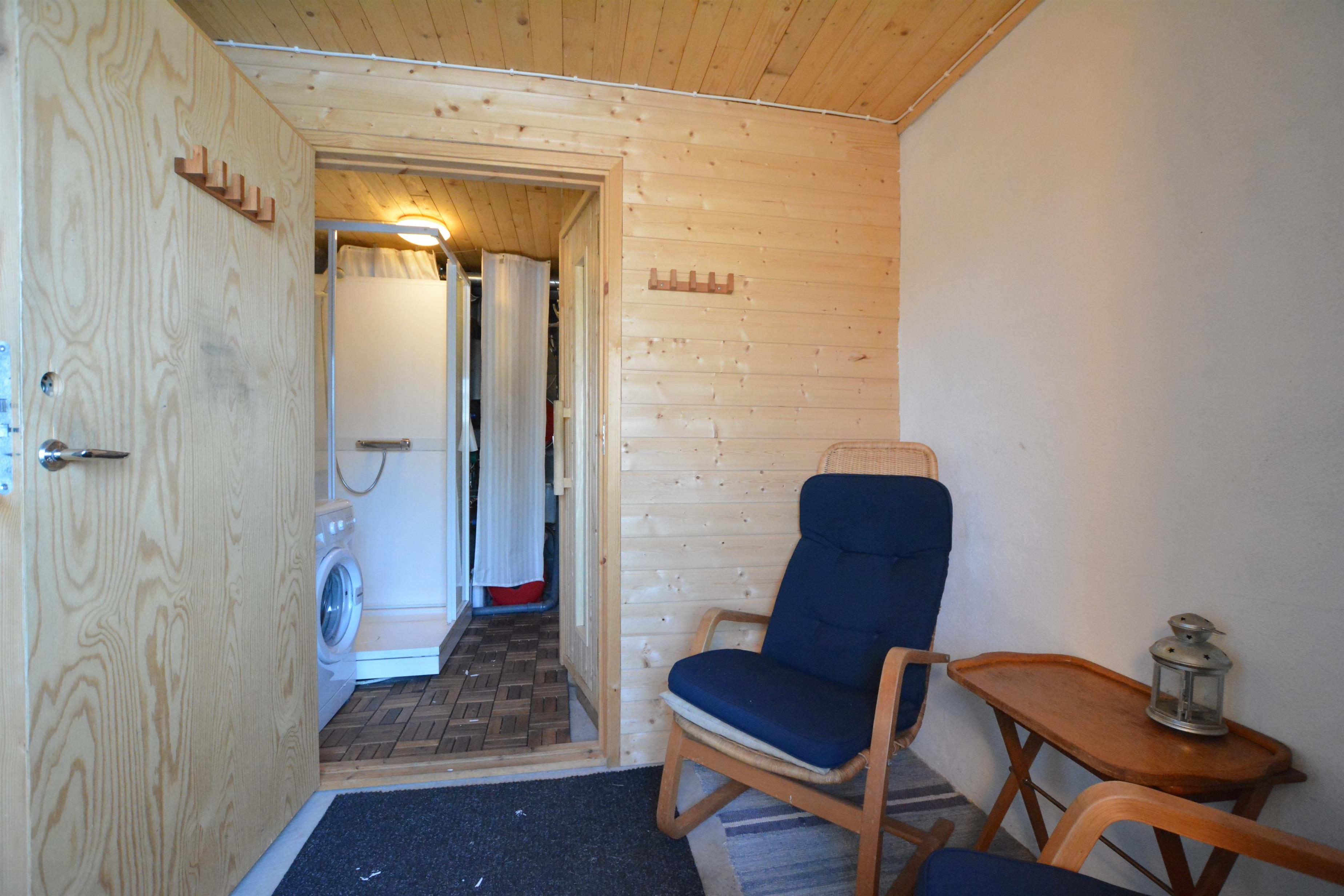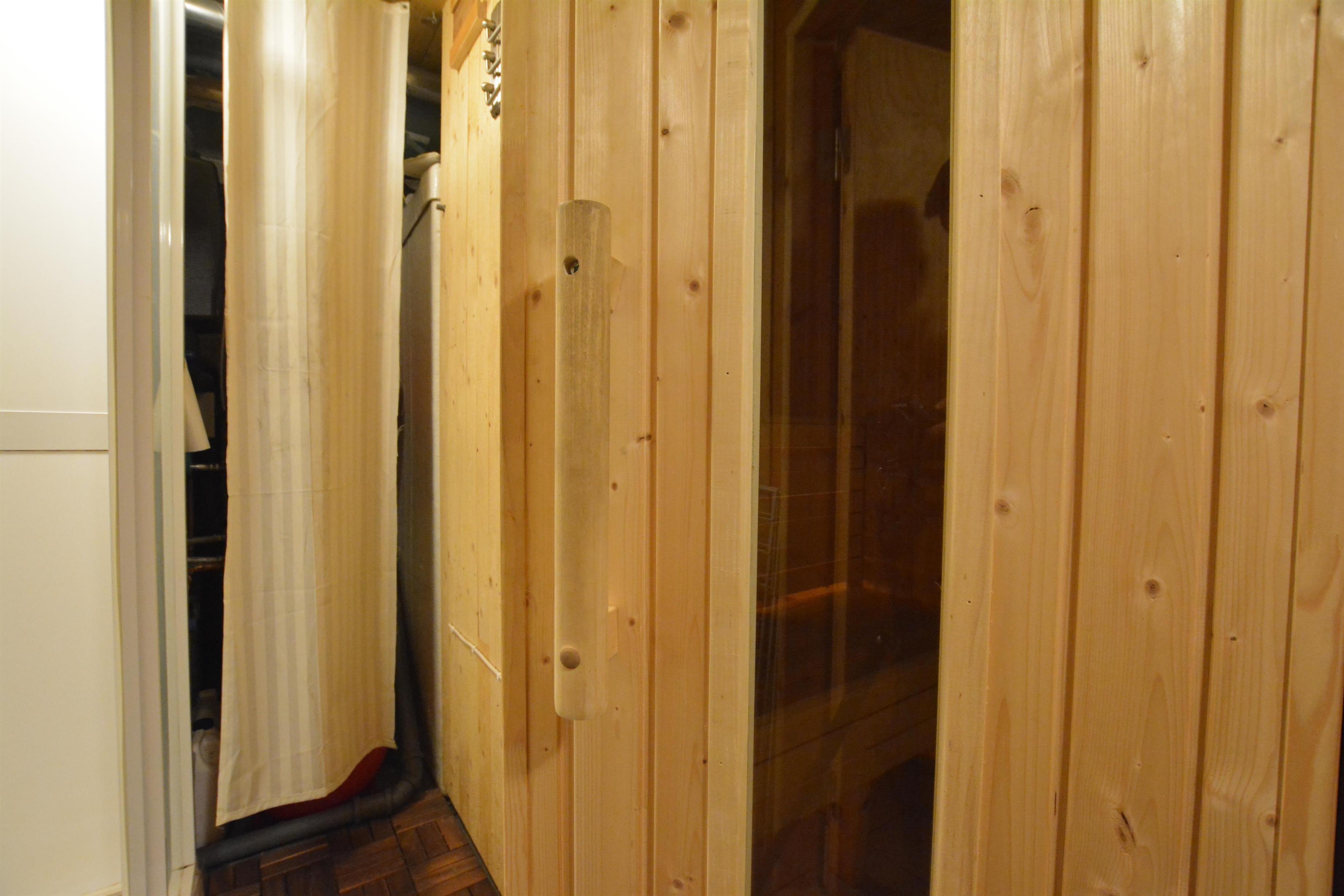 I källaren som tillhör hus 2 finns en stor frys, en liten bastu med dusch, en tvättmaskin samt ett torkskåp.
