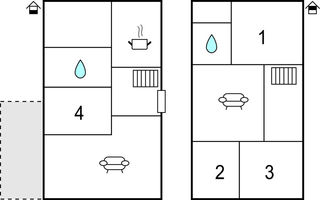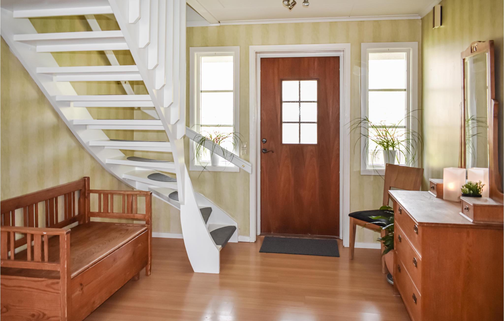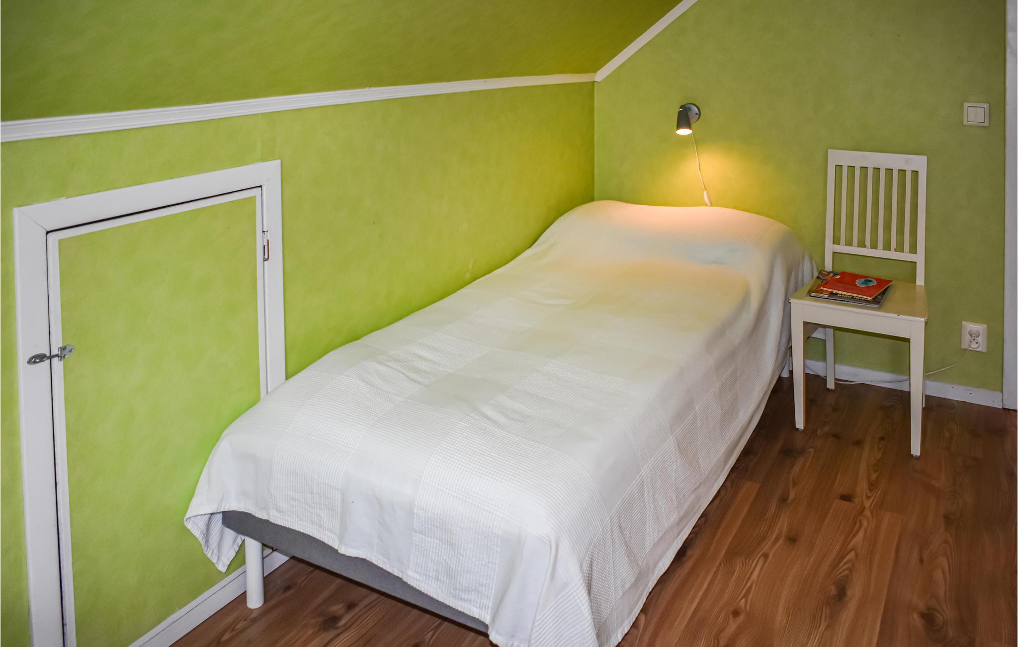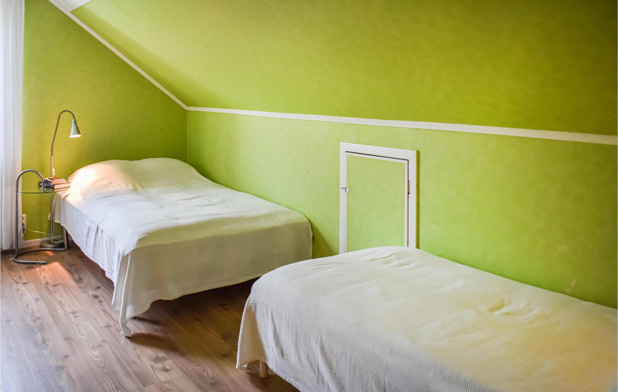 På husets övre våning finns tre sovrum. Ett av sovrummen har en 140 cm bred dubbelsäng. Den andra dubbelsängen är 180 cm bred. De andra två sovrummen har vardera två enkelsängar. Sovrum 4 ligger på bottenvåningen.