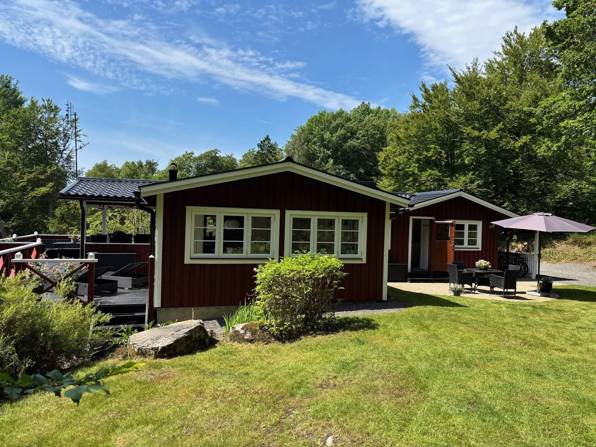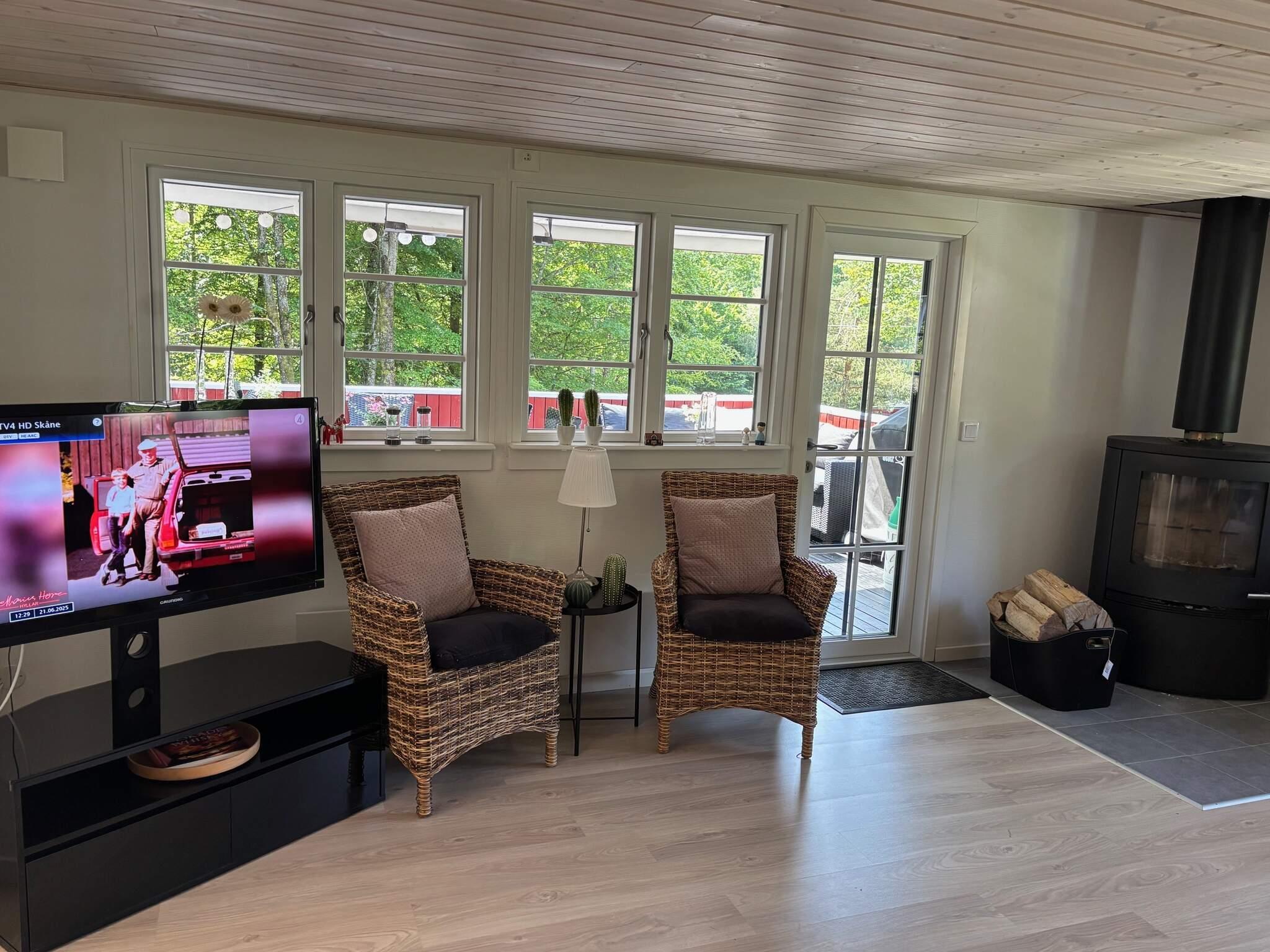 Er stuga är smakfullt inredd och husets hjärta är det stora, ljusa vardagsrummet med matplats och en bäddsoffa för två. Rummet har stora glaspartier och utgång till den härliga altanen som delvis är under tak. Det andra vardagsrummet har en rymlig soffa, TV och flera sittplatser. Huset har gratis wifi.