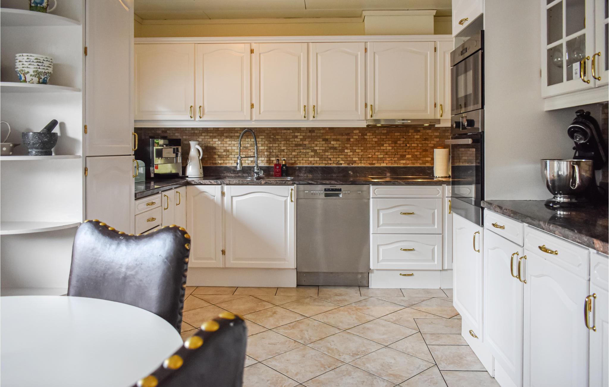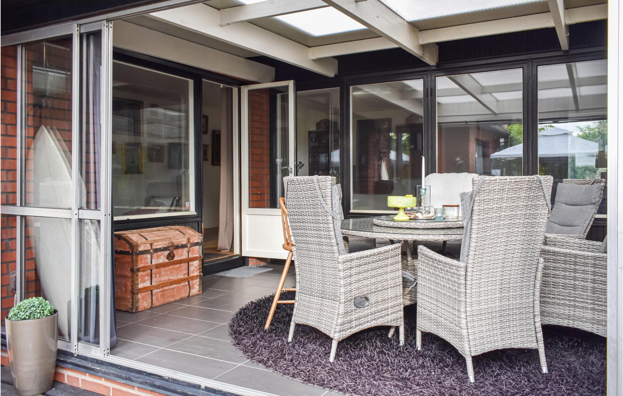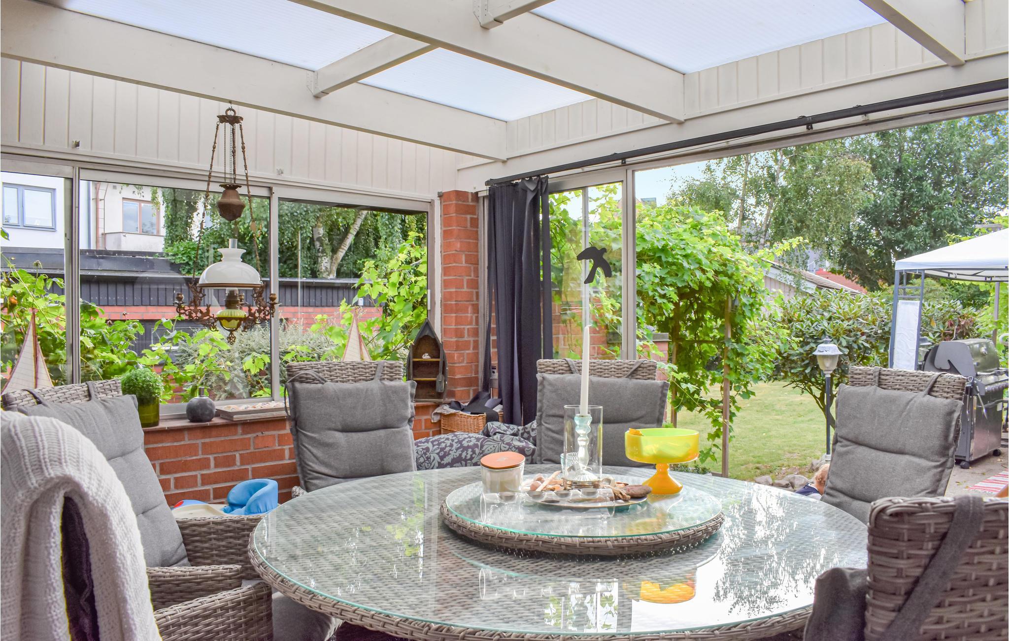 Vackert semesterhus med vinterträdgård och terrass med utekök på inhägnad tomt.