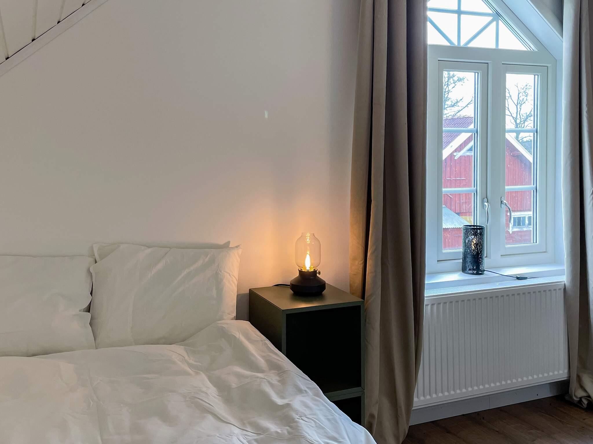 En trappa upp kan ni sova skönt i de vackra sovrummen med bra bäddar. I det ena sovrummet finns en dubbelsäng. I det andra finns en dagbädd som kan bäddas upp till en dubbelsäng samt två enkelsängar som är 120cm breda. Badrummet är fräscht och utrustad med både tvättmaskin och torktumlare.