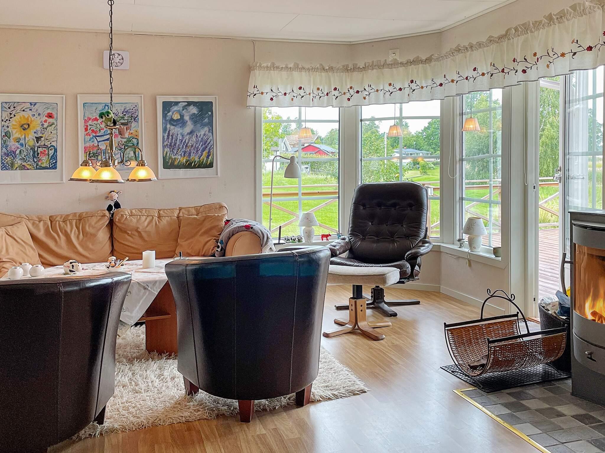 Altanen går runt hela huset där ni kan sitta och sola eller grilla på kvällen. Du välkomnas in i en ljus hall med två mindre sovrum till vänster. Båda sovrummen har varsin våningssäng. Huset är ljust möblerad med hemtrevlig inredning och stil. Köket och vardagsrummet har en öppen planlösning med magnifik utsikt mot sjön. I köket finns en matplats med plats för 4-6 personer, diskmaskin, kyl/frys, spis med ugn. I det stora vardagsrummet står en stor soffa med bord. Intill detta rum ligger ett litet mindre rum med TV-hörna. Soffan är en bäddsoffa på 140cm bred. Bredvid finns en fin utbyggnad som byggdes 2017 med stort ljusinsläpp, spotlight i taket och med sköna fåtöljer.