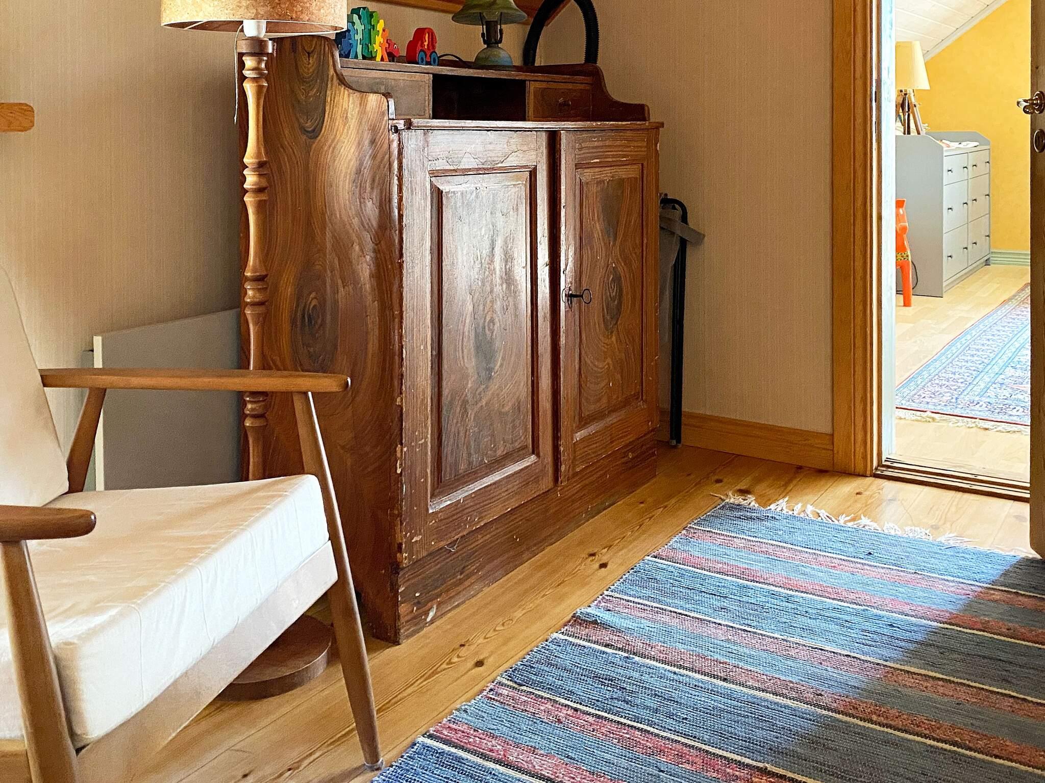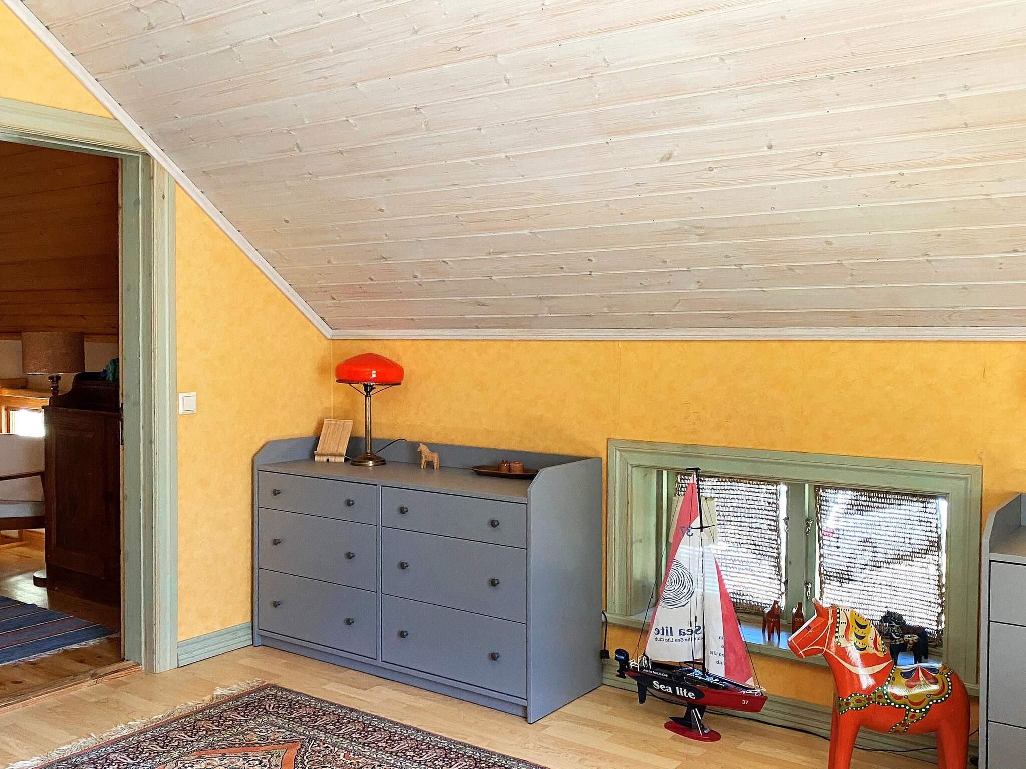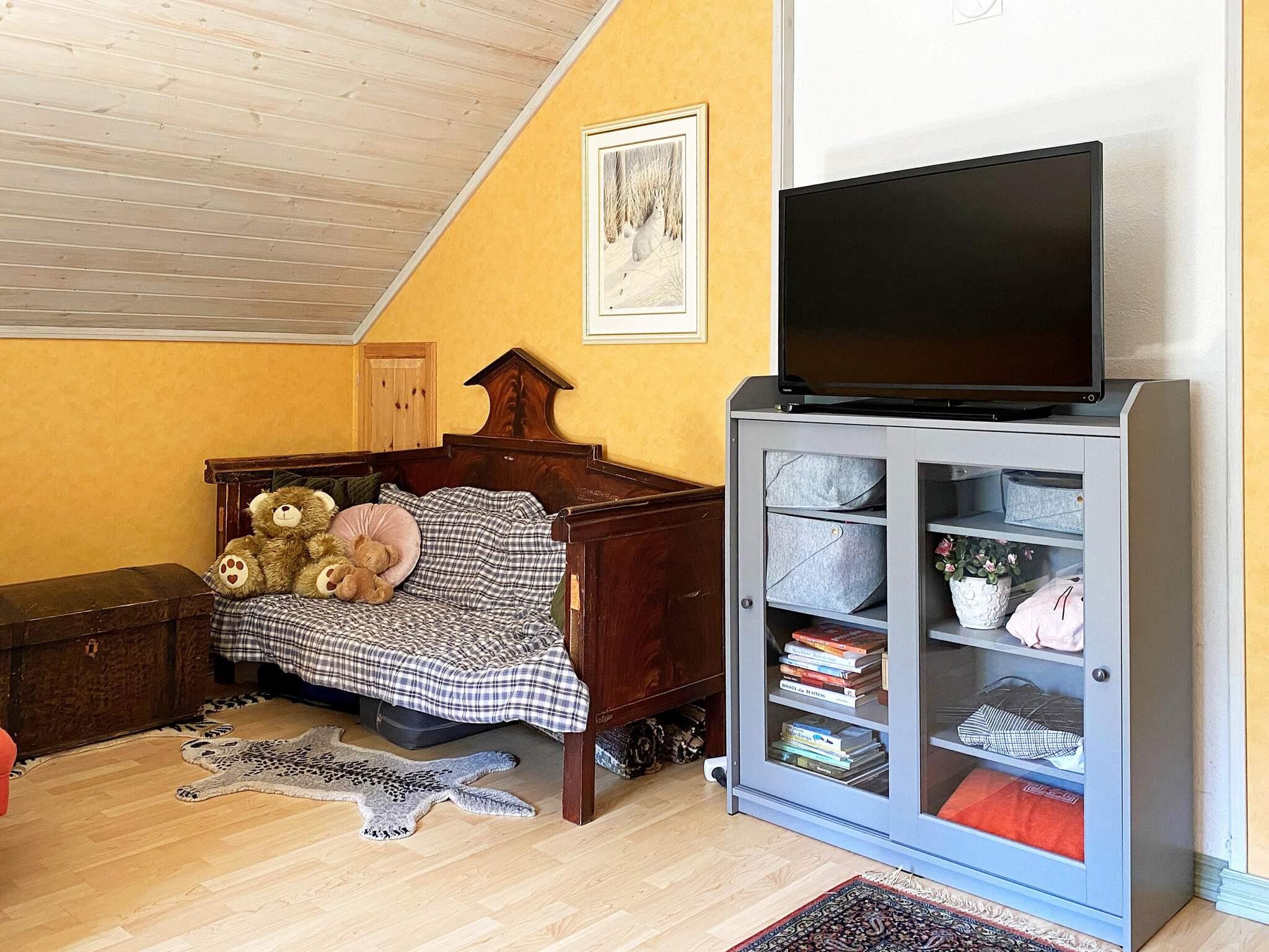 En trappa upp på övervåningen finns en hall samt de två sovrummen. Det första med en dubbelsäng -180cm och TV med chromecast. Det andra sovrummet har två extra breda väggbyggda våningssängar som är -110 cm. Stugan passar utmärkt för 6 personer. Ungdomsgäng under 25 år kan inte boka det här boendet utan målsmans sällskap under hela vistelsen.