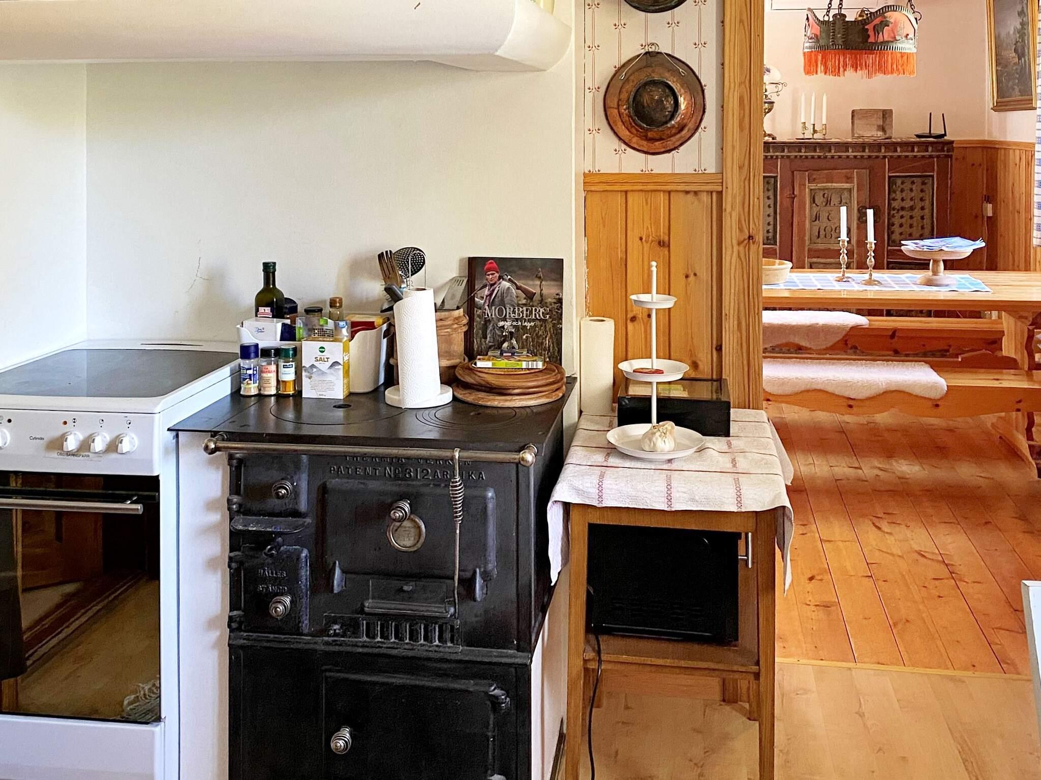 Köket har en typisk värmande vedspis med överbyggd kåpa som är byggd med naturligt utsug av luft på gammaldags vis, och intill vedspisen finns den ordinarie spisen. Här finns matbord med stolar samt kyl & frys. OBS: Diskmaskinen som finns i stugans kök är en liten "bänk-diskmaskin".