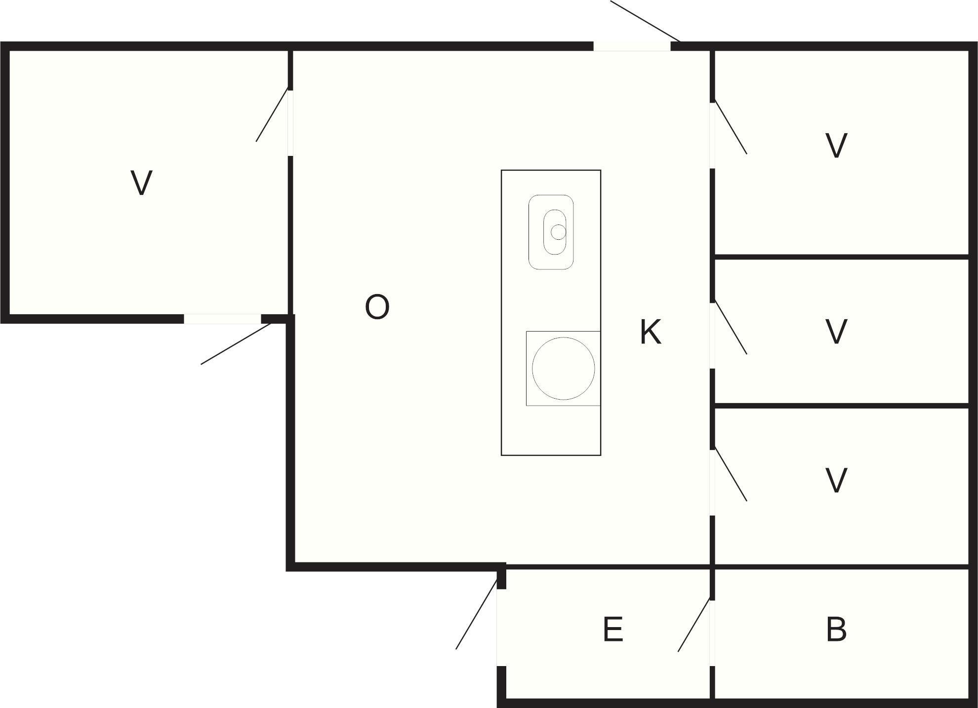 Huset är i ett plan och rymmer modernt kök med matplats och utgång till baksidan, vardagsrum med TV-hörna (Chromecast ej kanaler) samt värmande braskamin. Fyra sovrum varav ett dubbelrum med utgång till altan, ett med enkelsäng och skrivbord, ett med våningssäng samt det fjärde med modern utdragbar dubbelsäng (sk. dagbädd). Badrum med dusch, Wc och tvättmaskin.