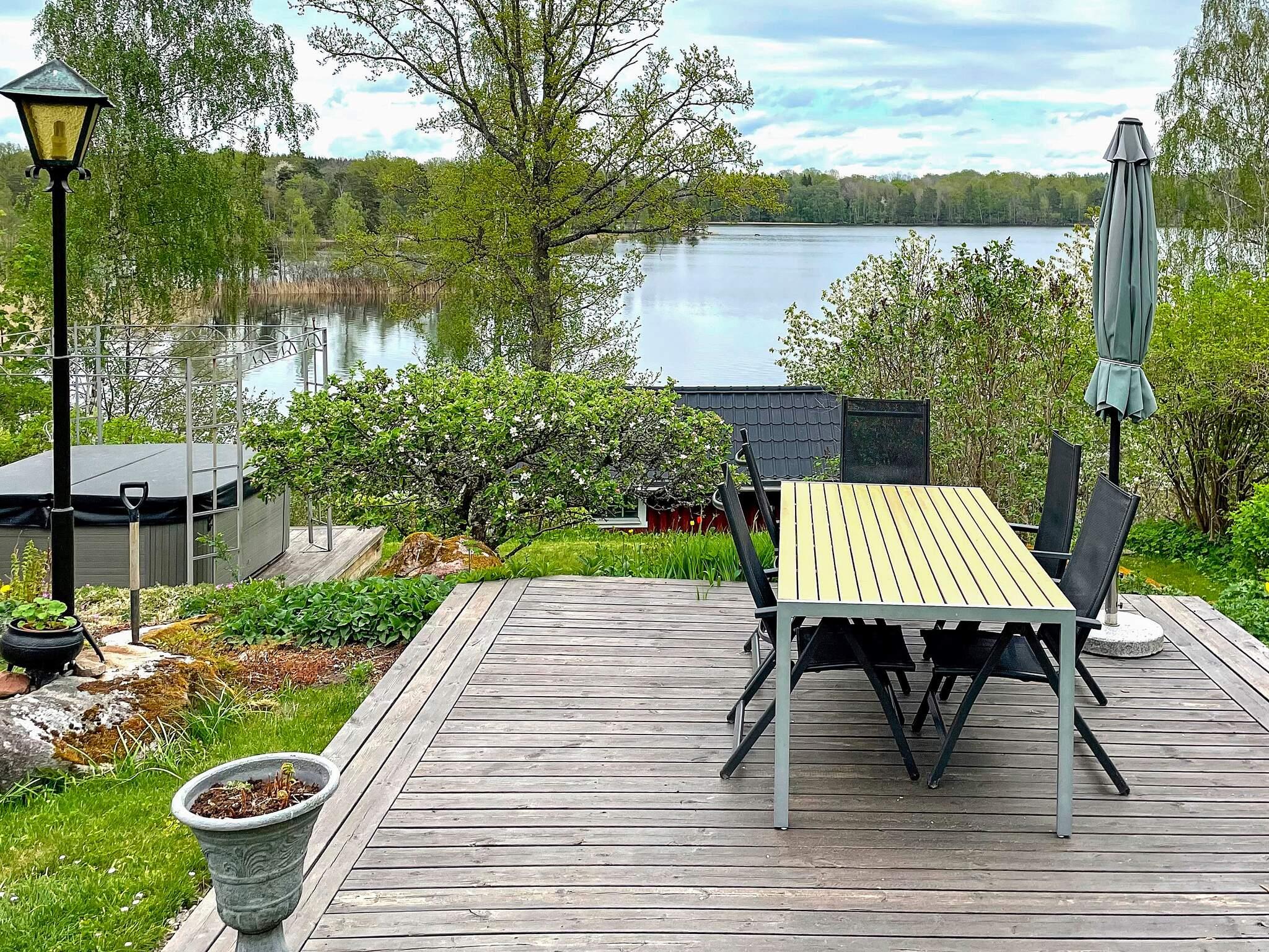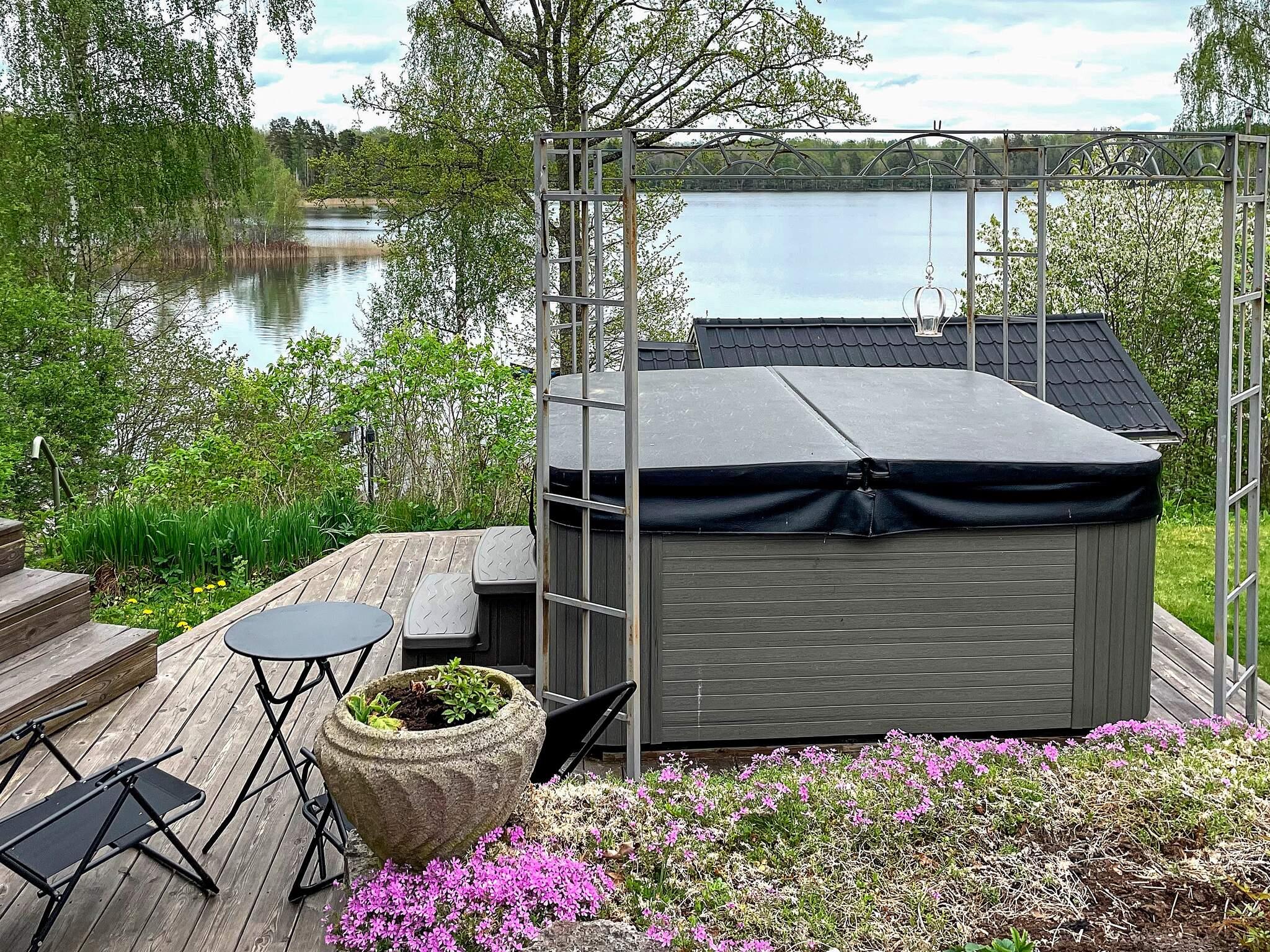 Stuga med fantastisk sjötomt vid sjön Järnlunden i vackra Östergötland, egen strand med brygga och tillgång till roddbåt. På tomten finns flera terrasser en med matplats och en med jacuzzi som har en bedårande utsikt över sjön.