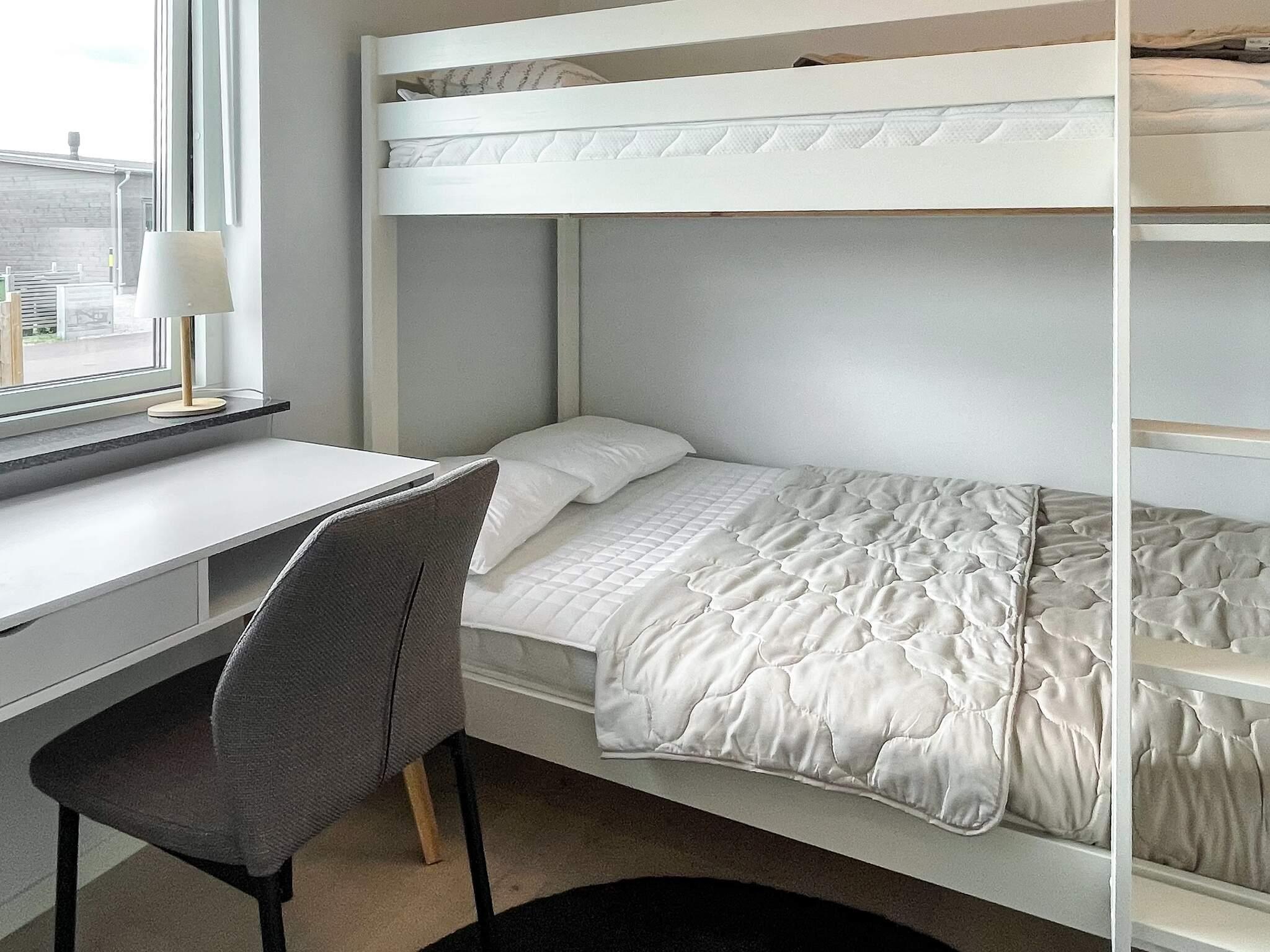 Ni sover i två sovrum. Det ena sovrummet är utrustat med två enkelsängar, det andra med en våningssäng där underslafen är 120 cm bred. Soffan i vardagsrummet bäddas ut till en dubbelsäng.
