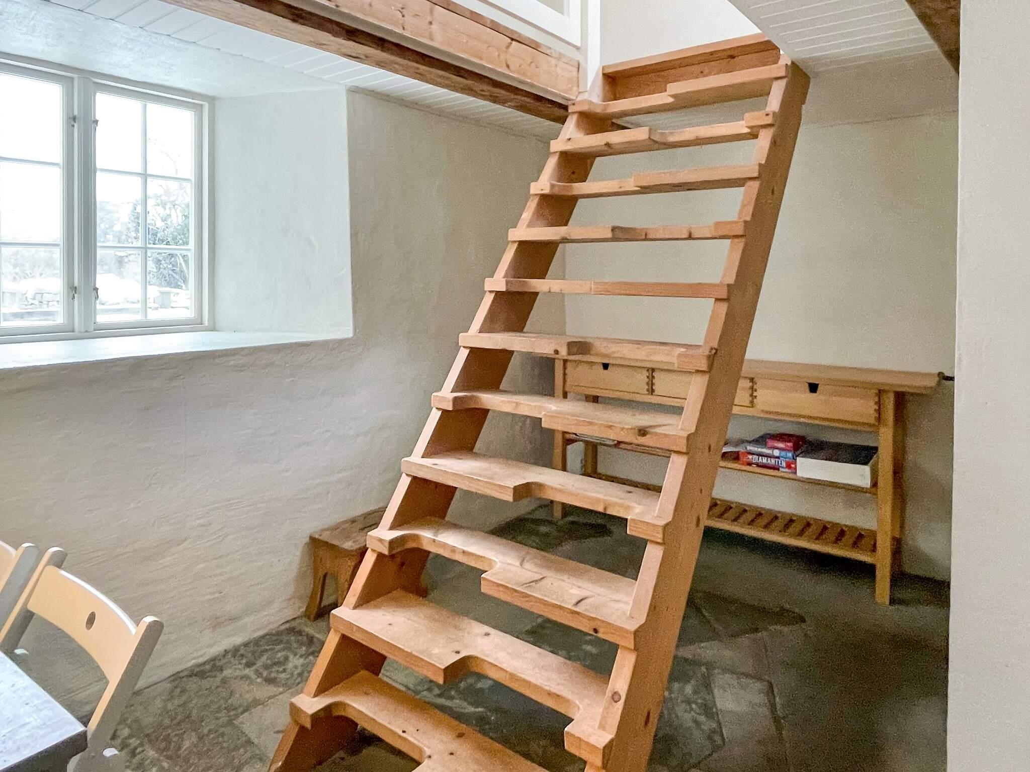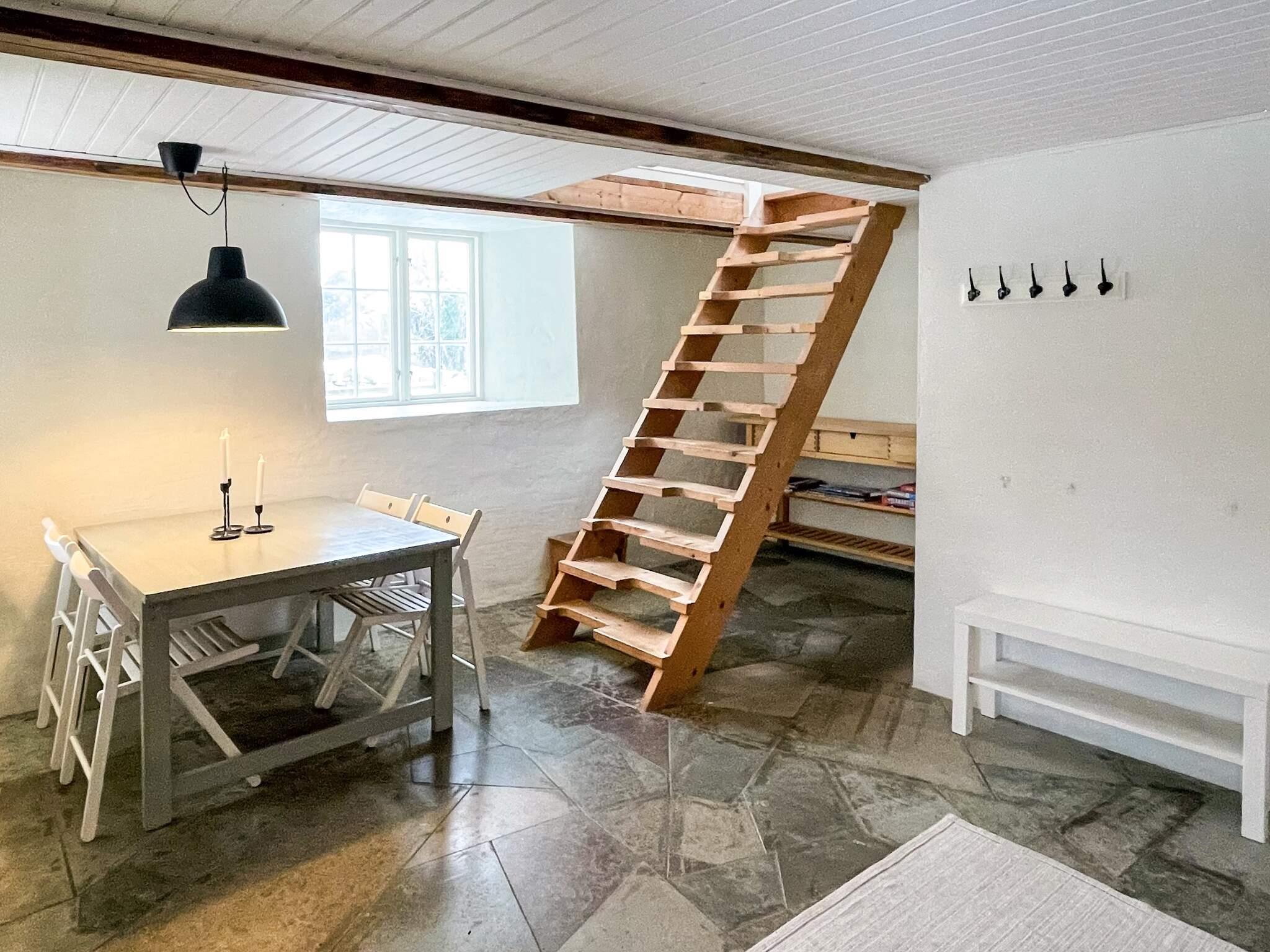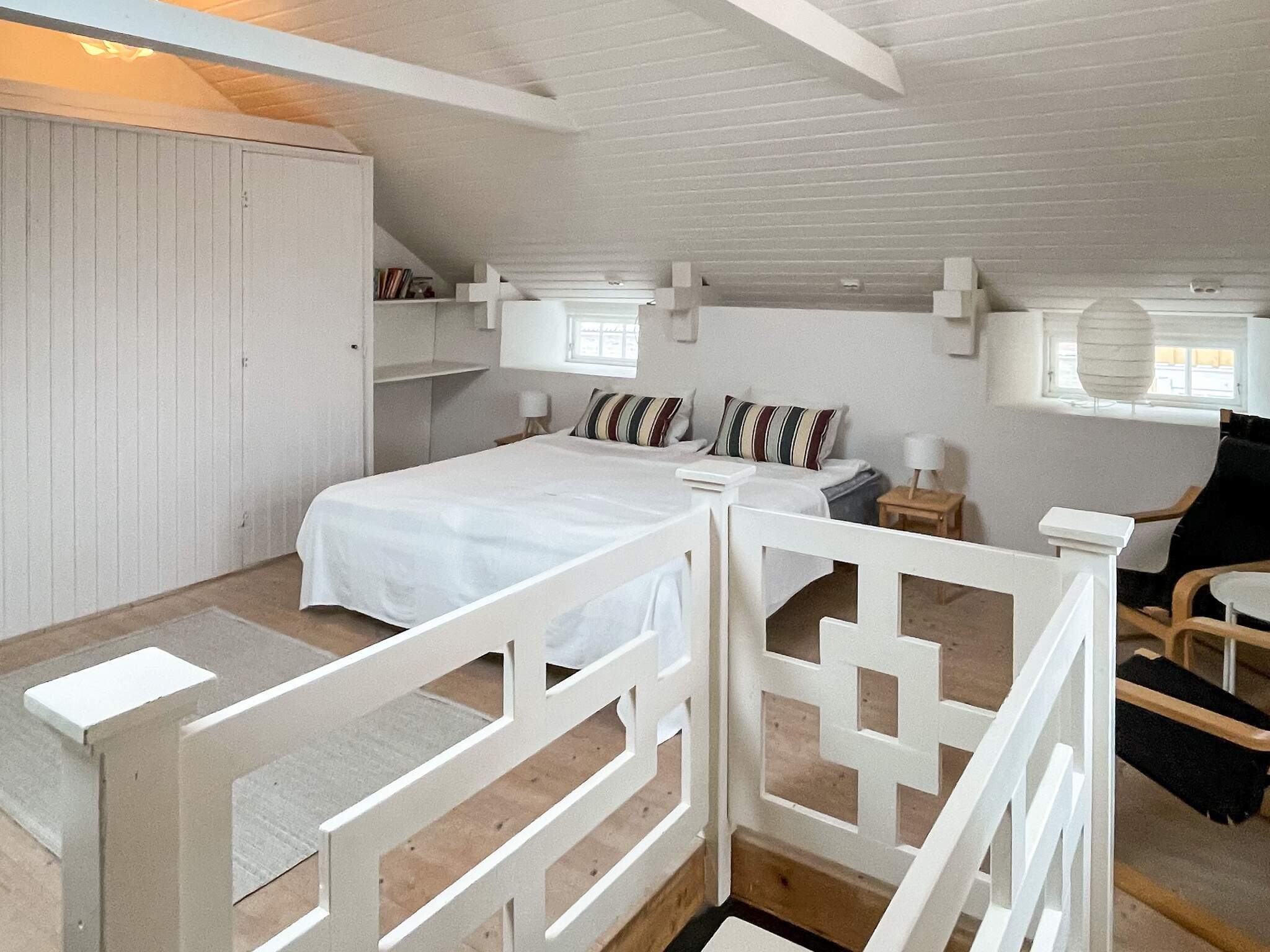 Etagelägenheten har ett modernt kök, matplats och badrum på nedre plan, medan den öppna övervåningen har synliga takbjälkar, takfönster, utsikt över innergården, en dubbelsäng, en vardagsrumsdel med bäddsoffa, skrivbord och garderober.