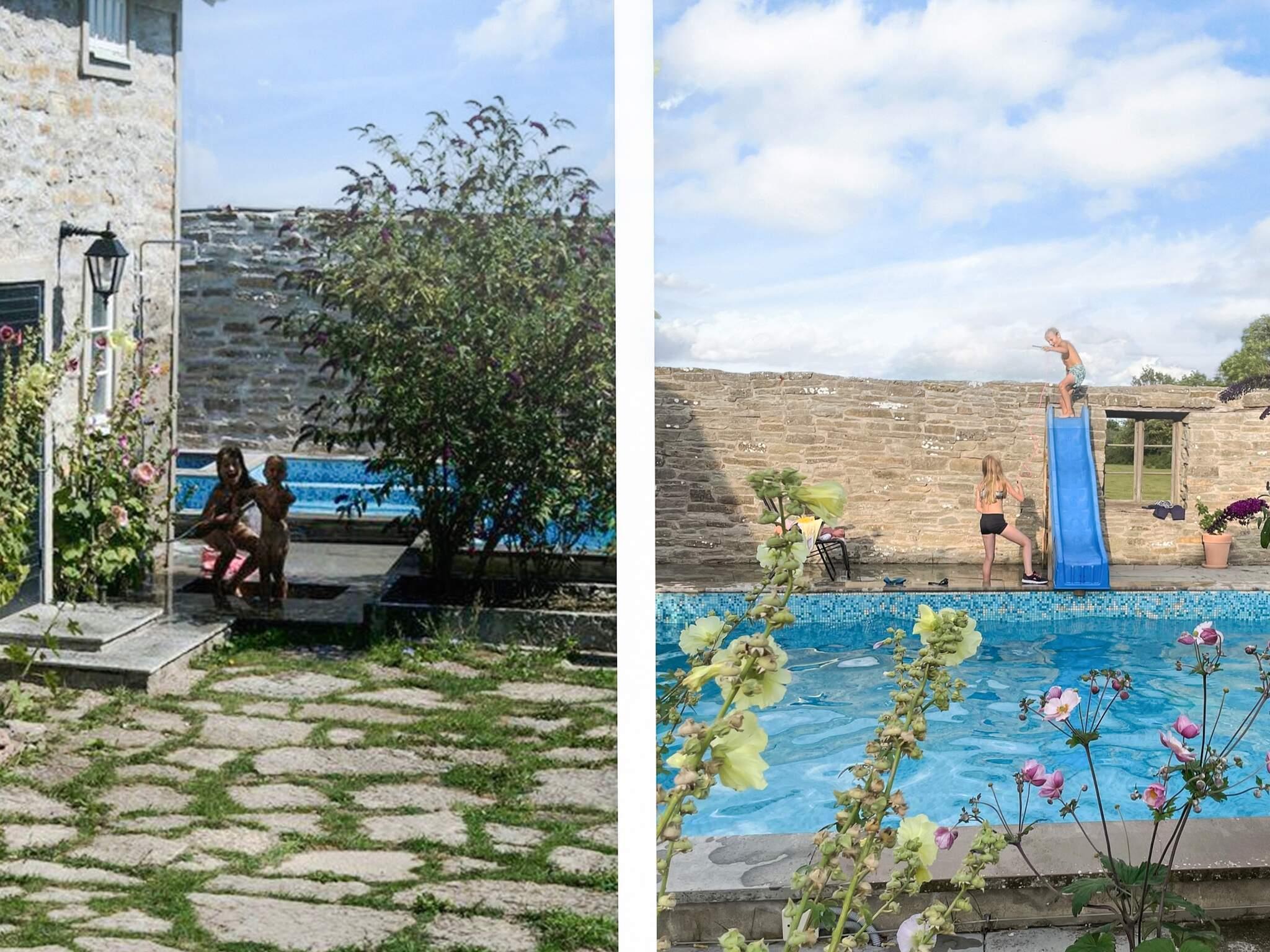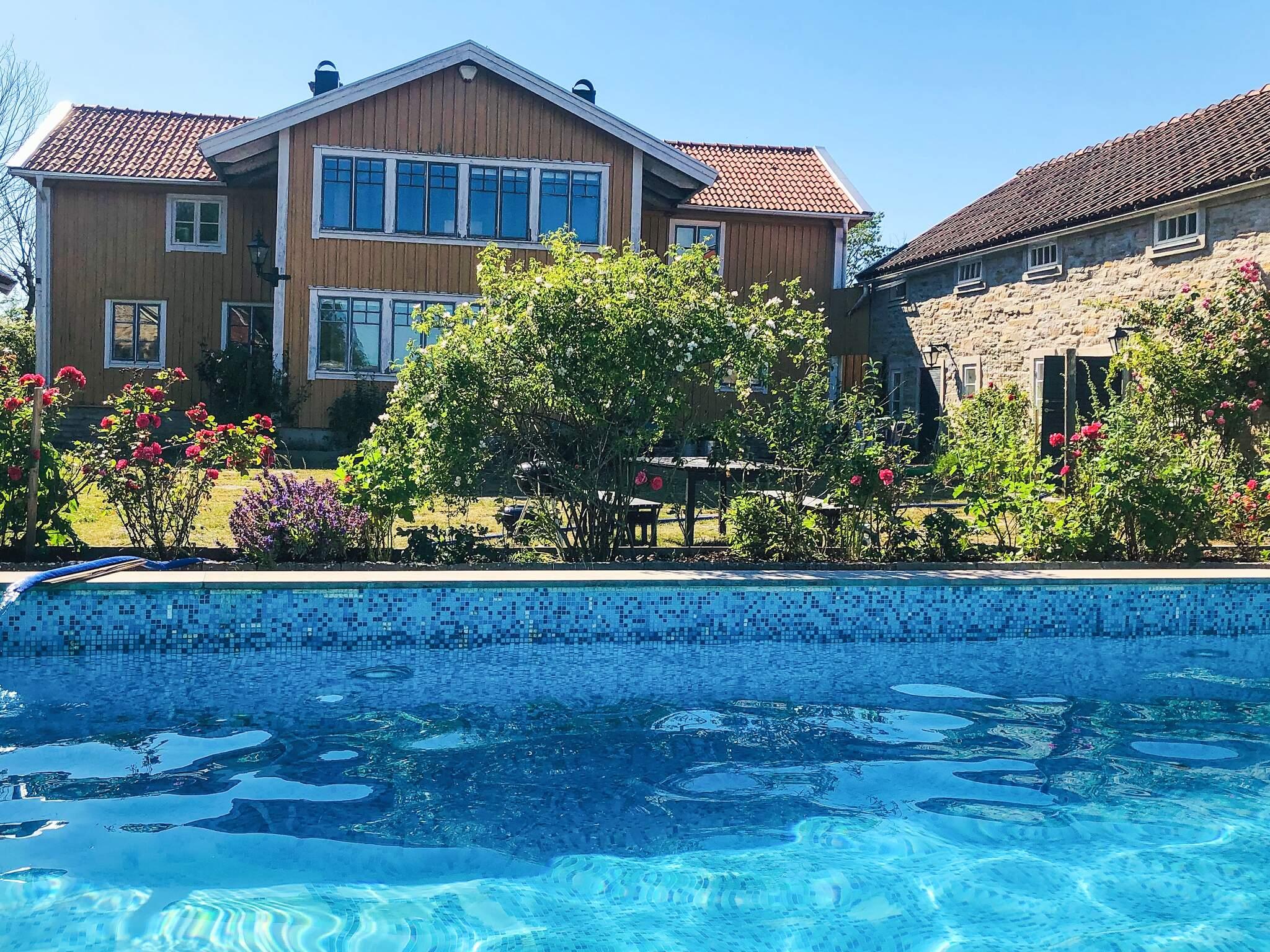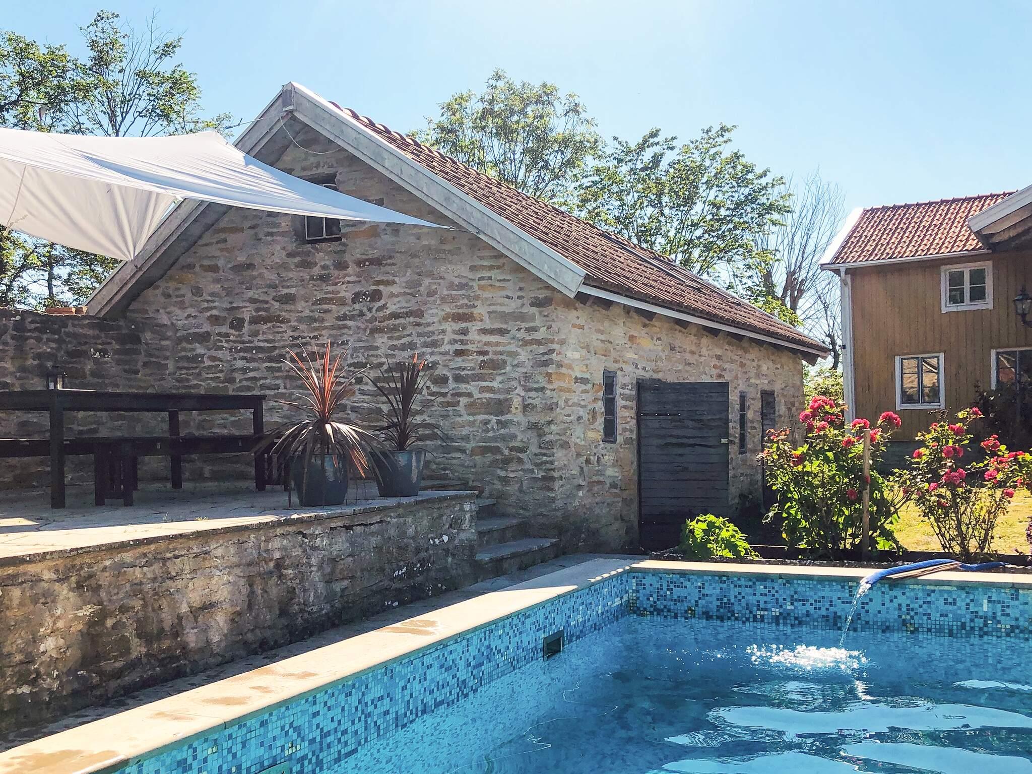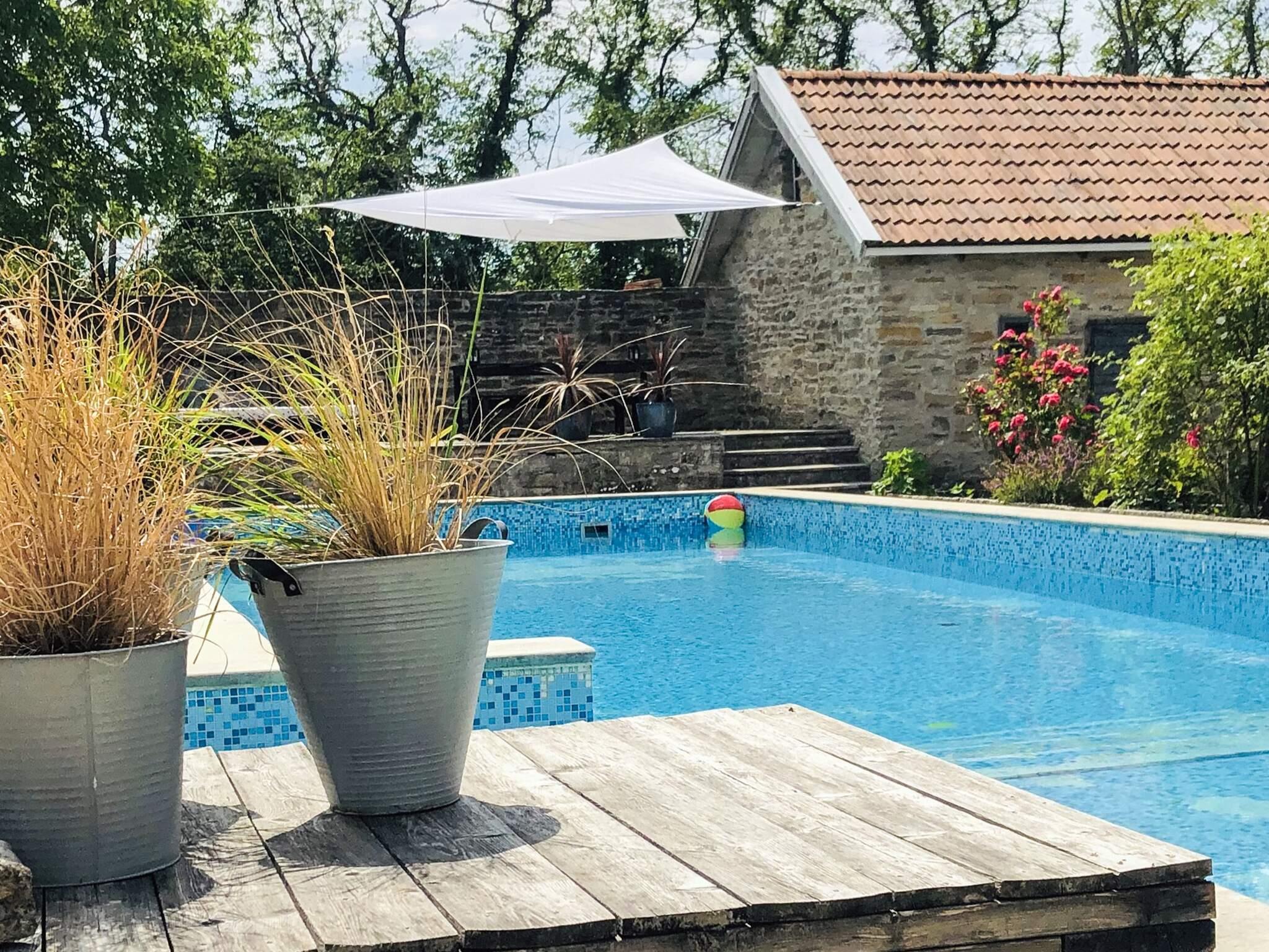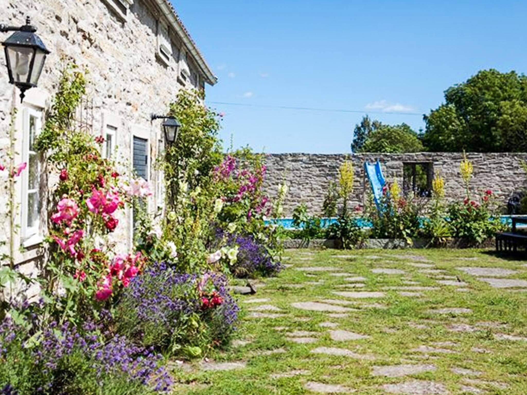 En charmig innergård omgiven av stockrosor, lavendel och ölandsk sten omger en slående blå pool, vilket skapar en avslappnad semesterkänsla.