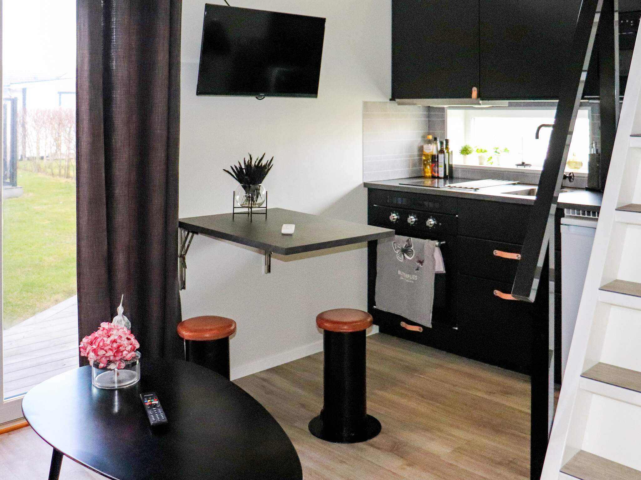 Annexet har ett öppet pentry med en bäddsoffa för två personer och ett fällbart bord. Sovrummet har en våningssäng. Badrummet är helkaklat, rymligt, med dusch och tvättmaskin. En ganska bekväm liten trappa leder upp till ett sovloft med två resårmadrasser på golvet. Här kan de yngre ha roligt. Från pentryt finns en utgång till terrassen, där det finns utemöbler och en grill. Den del av tomten som vetter mot grönområdet är perfekt för familjens utomhusaktiviteter.