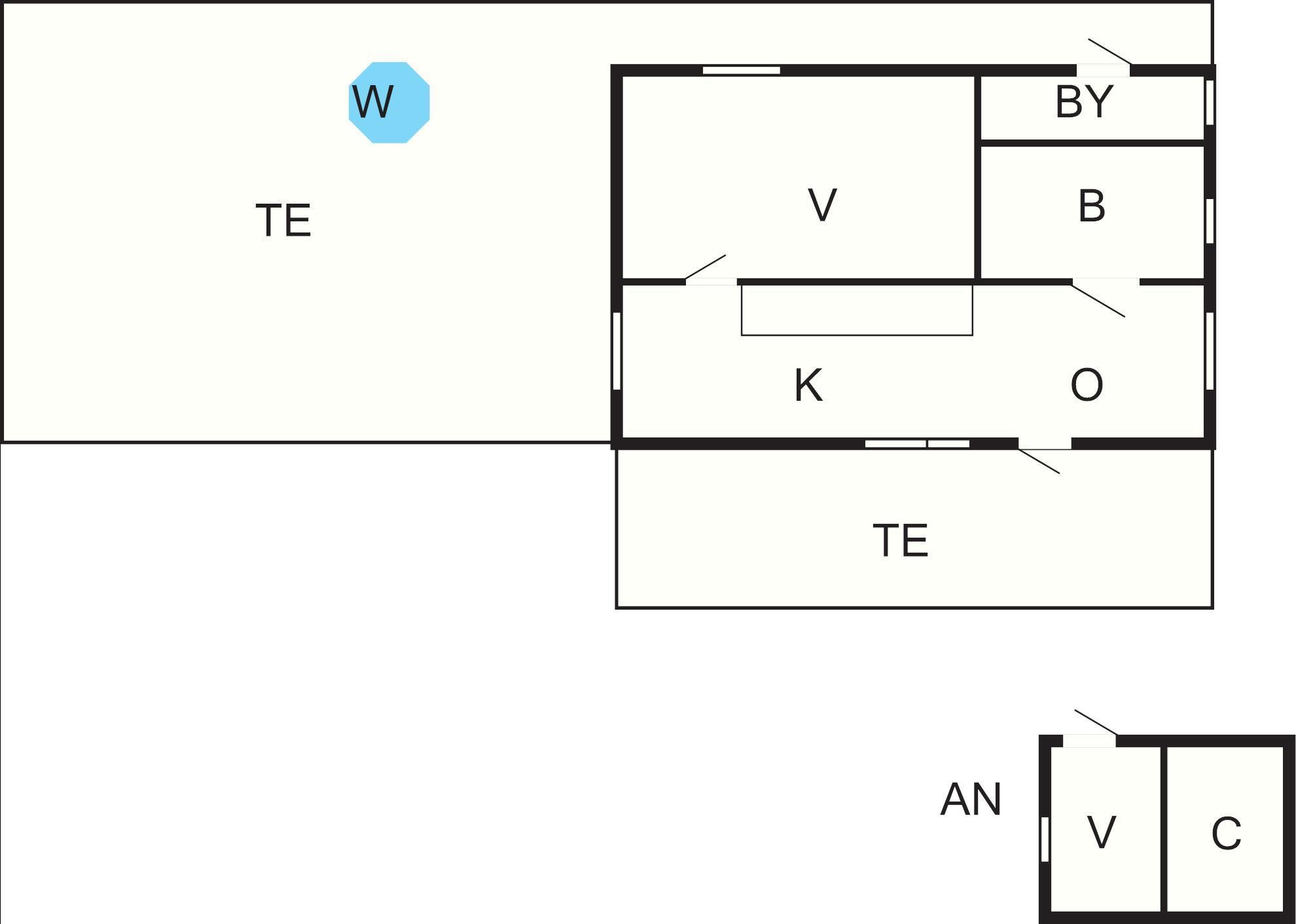 Boendet har ett sovrum med 160 dubbelsäng och en mindre bäddsoffa, köksdelen har köksbord med plats för 4 personer och intill i samma rum finns soffhörnan. Det är kaklat badrum med dusch och runt hörnan finns en tvättstuga. På gården finns ytterligare ett rum med egen entré där finns sommarvatten och en dubbelsäng. Det finns två altaner att tillgå en veranda med plats för 2–3 personer och tillgång till den stora altanen på 100kvm som delas med ägaren. Här finns en Weber grill, vedeldad spabad, matplats under markis och en soffgrupp, en härlig plats för umgänge. Stugan har Wifi och en TV-skärm för den som vill koppla upp sig från mobil eller Chromecast.Husdjur är välkomna och hundvakt går att köpa till enligt överenskommelse med husägaren.