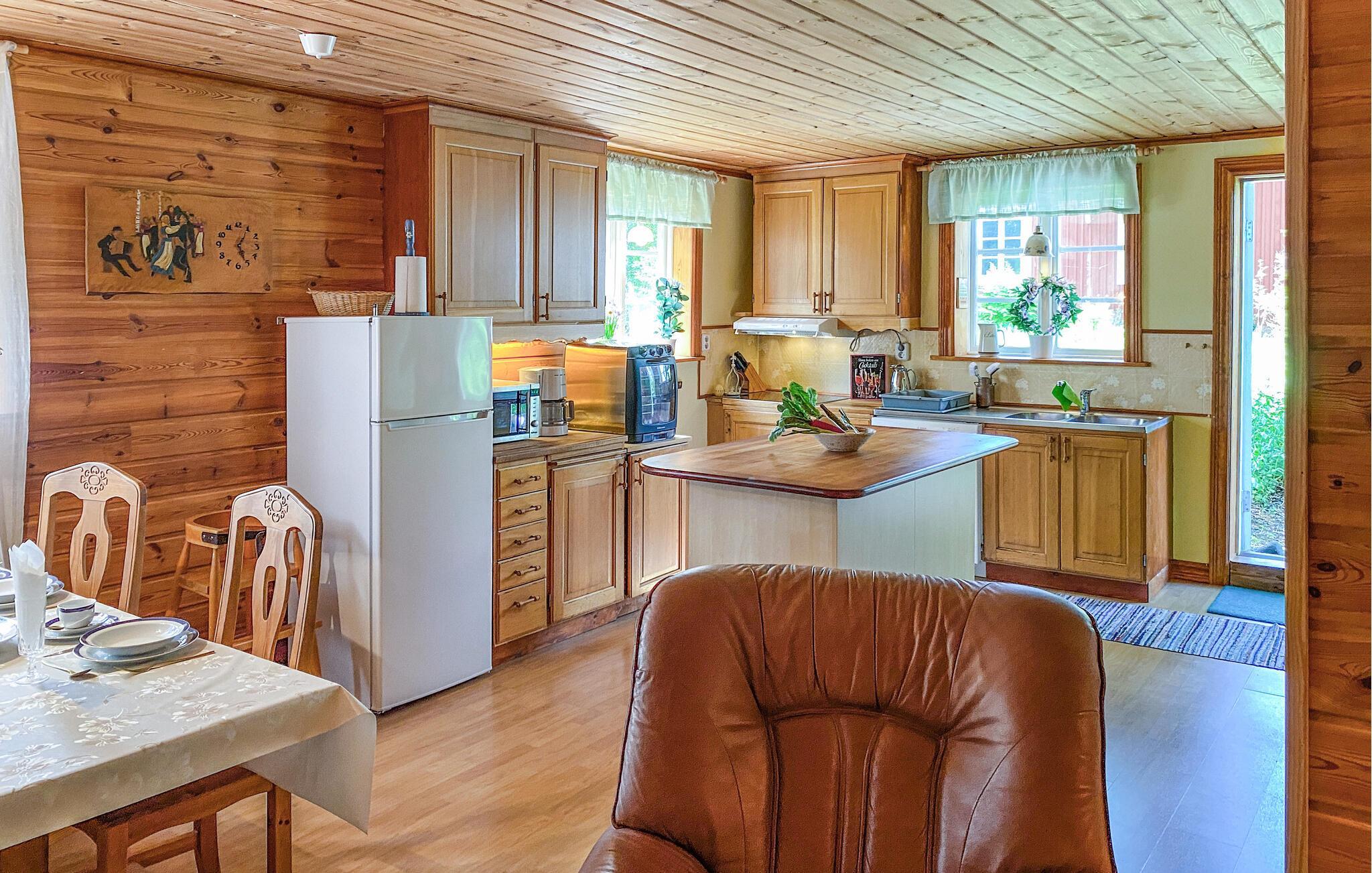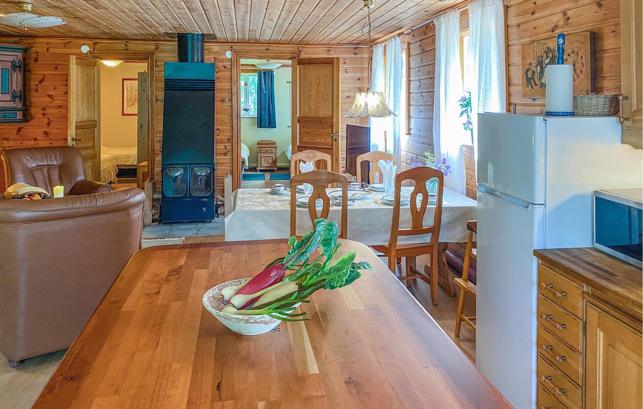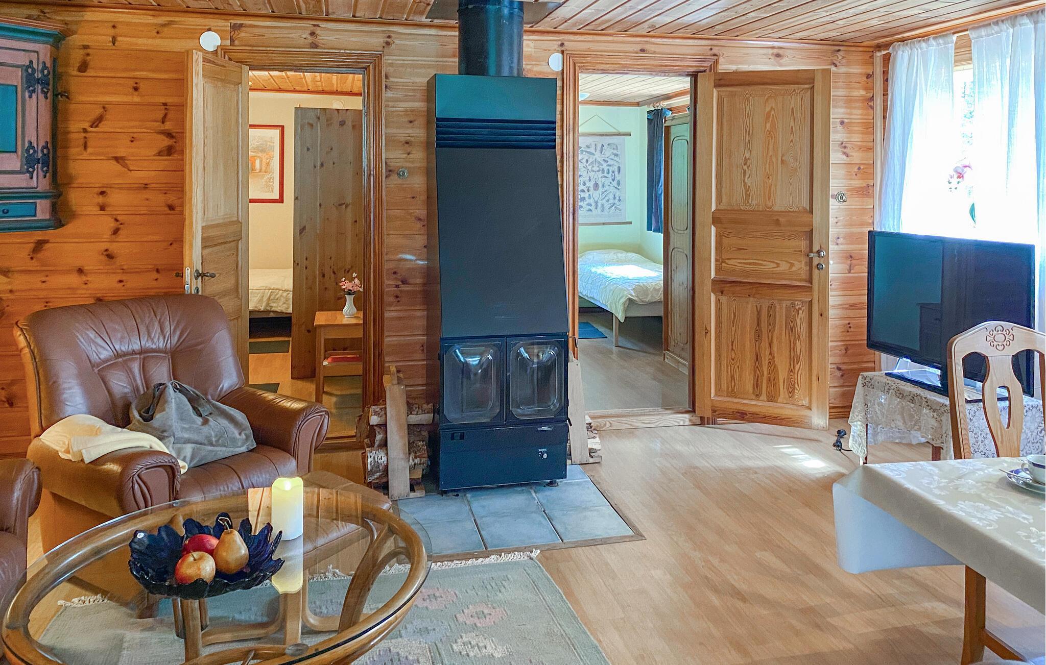 Inuti hittar du en mysig atmosfär med ett kök med öppen planlösning och ett vardagsrum som inbjuder dig att dröja kvar. Gör dig bekväm i soffan och avsluta dagen med att koppla av vid den öppna elden.
