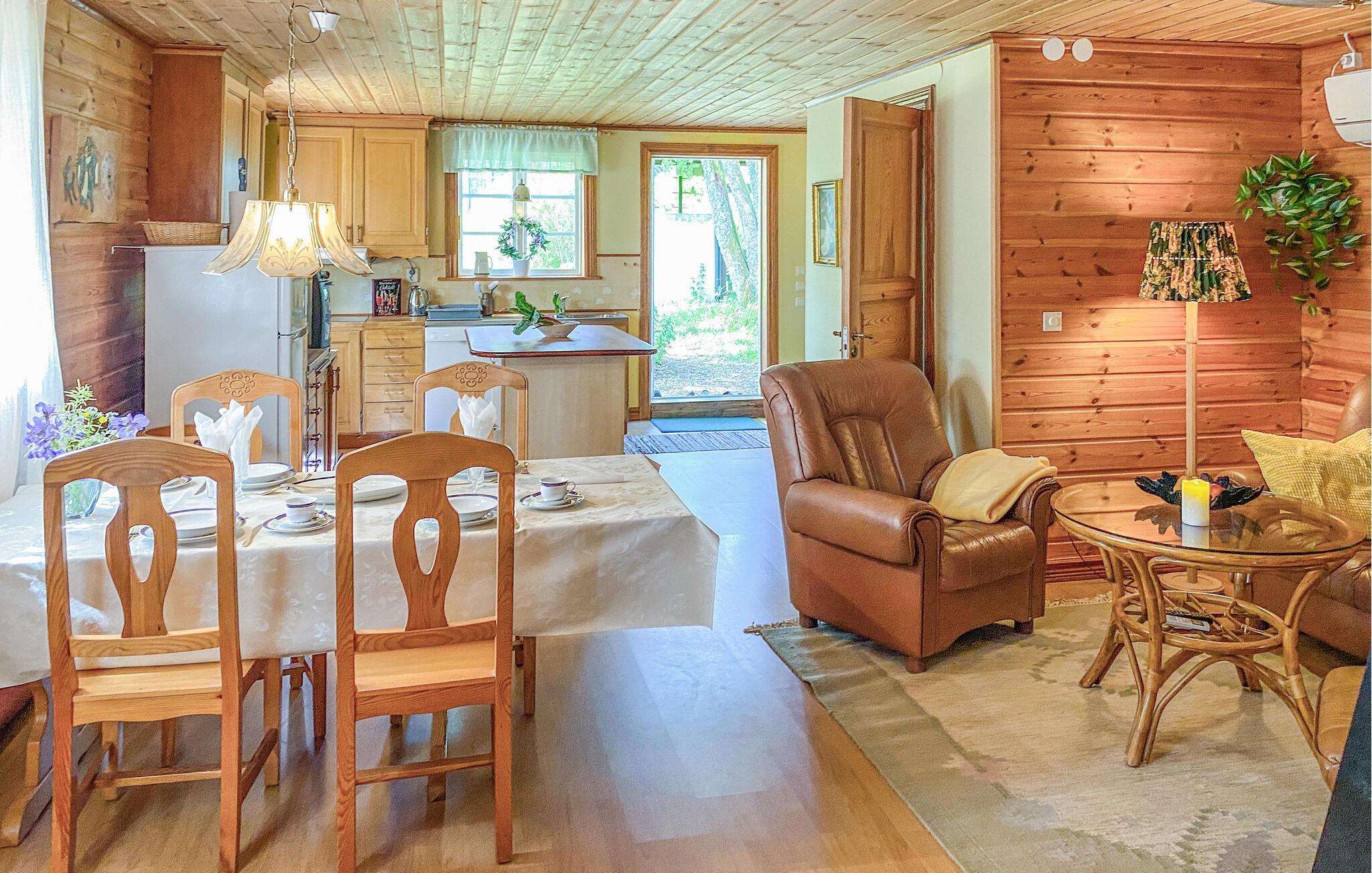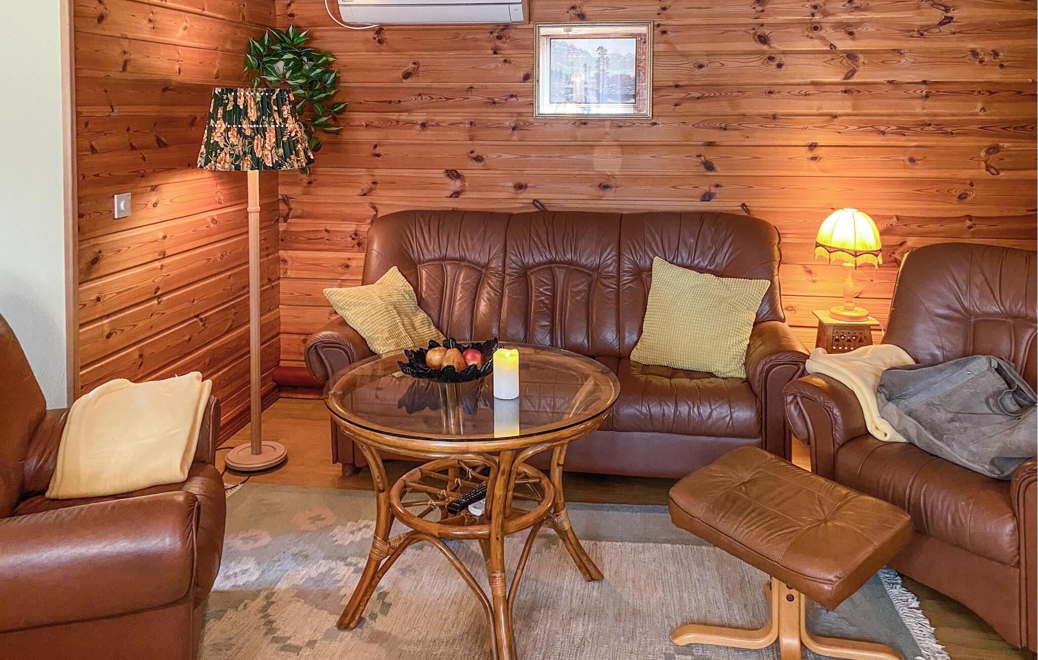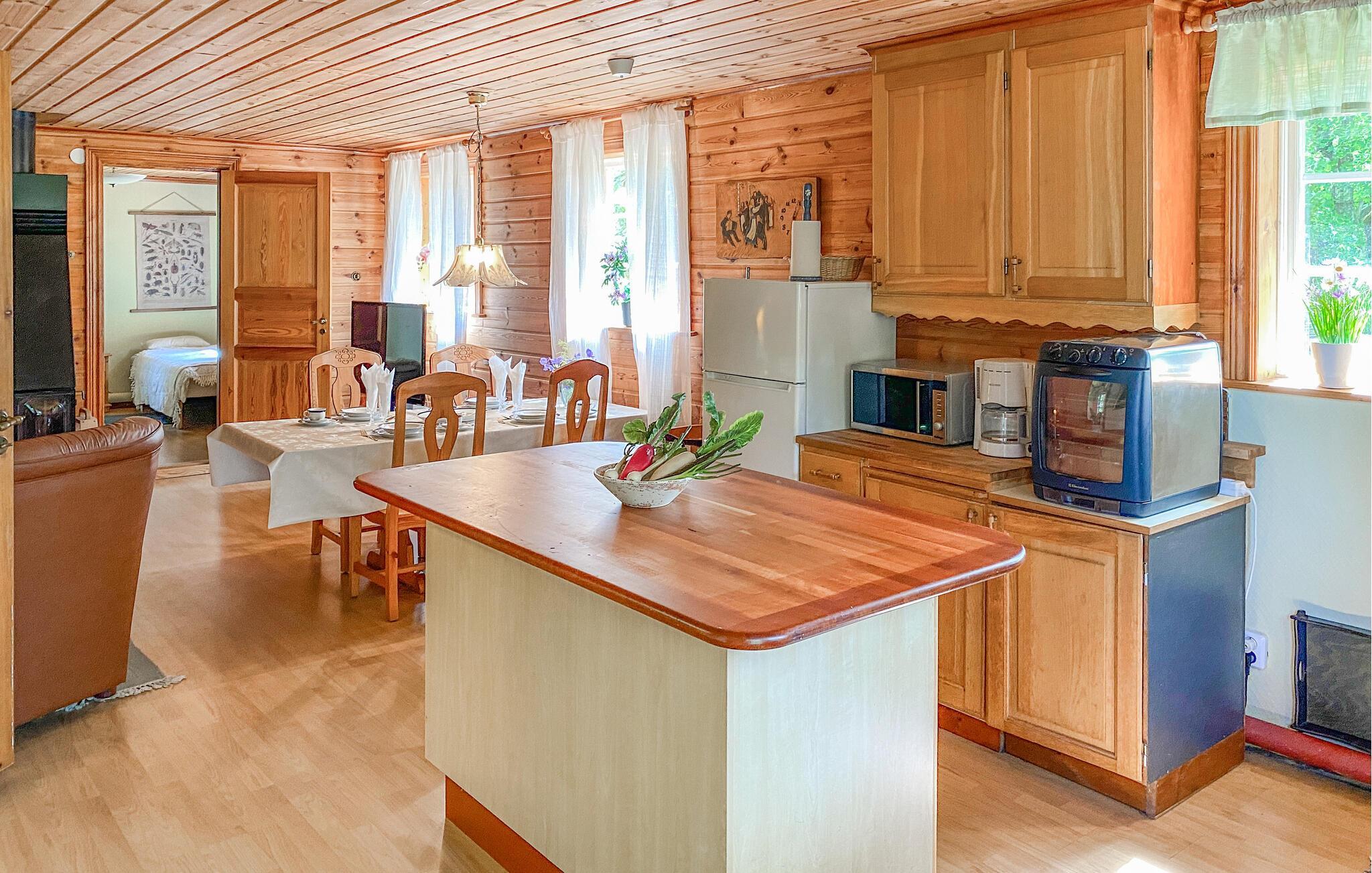 Inuti hittar du en mysig atmosfär med ett kök med öppen planlösning och ett vardagsrum som inbjuder dig att dröja kvar. Gör dig bekväm i soffan och avsluta dagen med att koppla av vid den öppna elden.