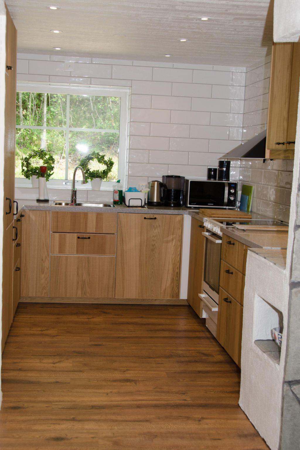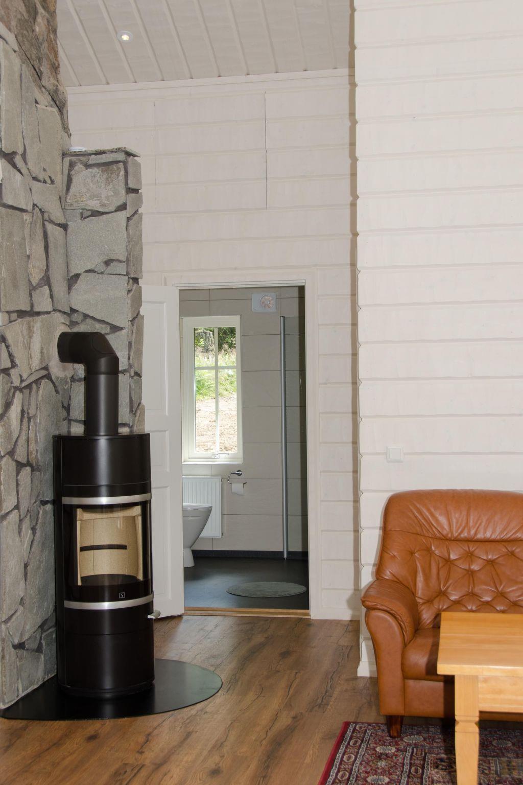 The living space of the house decorated cosily in a Swedish style is around 85m². It comprises a big living room with an integrated kitchen, three bedrooms with double beds, a bathroom with a toilet, and a separate toilet. The bathroom has a washing machine and a dryer. The living room provides an LED TV with satellite channels, a leather corner suite, a coffee table, a dining table and chairs. There is central heating, as well as pleasant heat generated by the fireplace stove if required. The built-in kitchen has a convection oven, a dishwasher, a fridge and freezer, and a microwave.