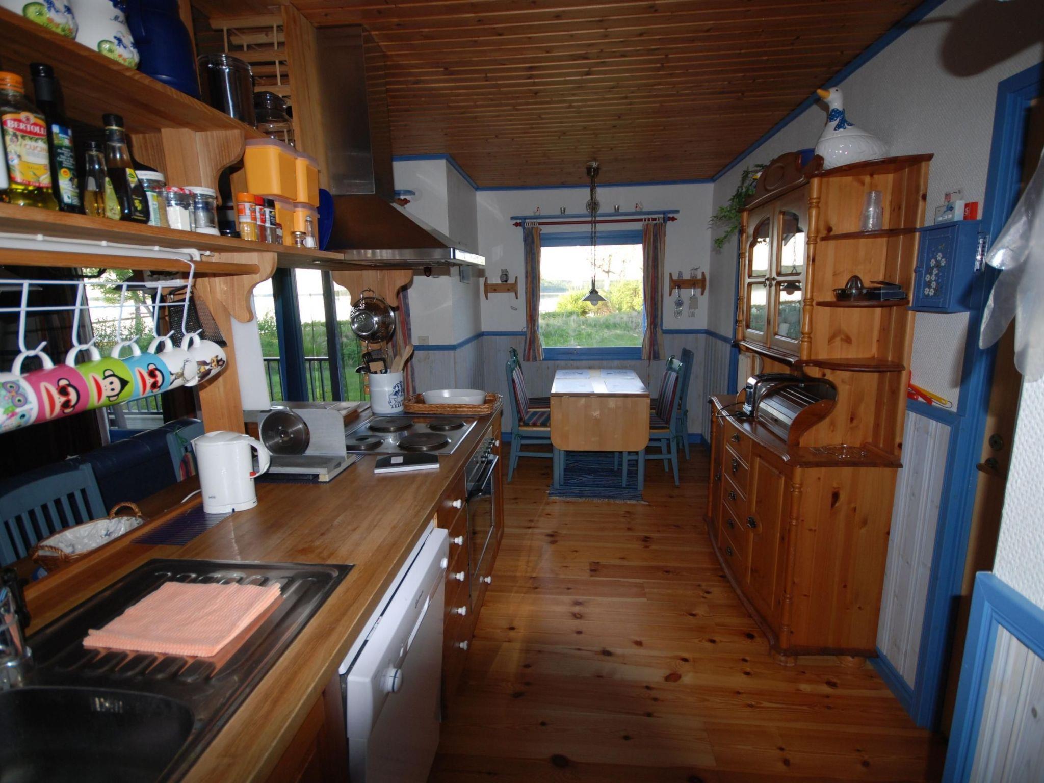 The almost ground-level house of 70m², accessed up a step to the veranda and with a step into the house, as well as a little step in the entrance hallway, is suitable for six people. Two further people can sleep in the guest house right next door. You enter the house into a little entrance hallway. To the right there is a bathroom with a washbasin, WC and shower. Everything is clean and well-maintained. After the little hallway there is a step into the living and dining room and there is a freestanding kitchen unit on the left. You go straight ahead to a little sitting corner for four people, with a direct view of the lake. To the right there are two children’s rooms, each with a bunk bed 890 x 200cm), a cupboard and a table. To the left of the kitchen unit there is the living room with a wood burning stove, a big corner sofa, a coffee table, cupboards and satellite TV. A big window opens up a lovely view of the lake with beautiful sunsets towards the west. Behind the living room there is the parents’ bedroom with a double bed (180 x 200cm), two narrow wardrobes and a terrace door opening onto the terrace facing the lake. The left part of the terrace is glazed, as shelter from the wind. The rest is open and spans the whole width of the living room and the bedroom. The bedroom window has a fly screen. Three radiant heaters provide the necessary warmth on cooler evenings.
