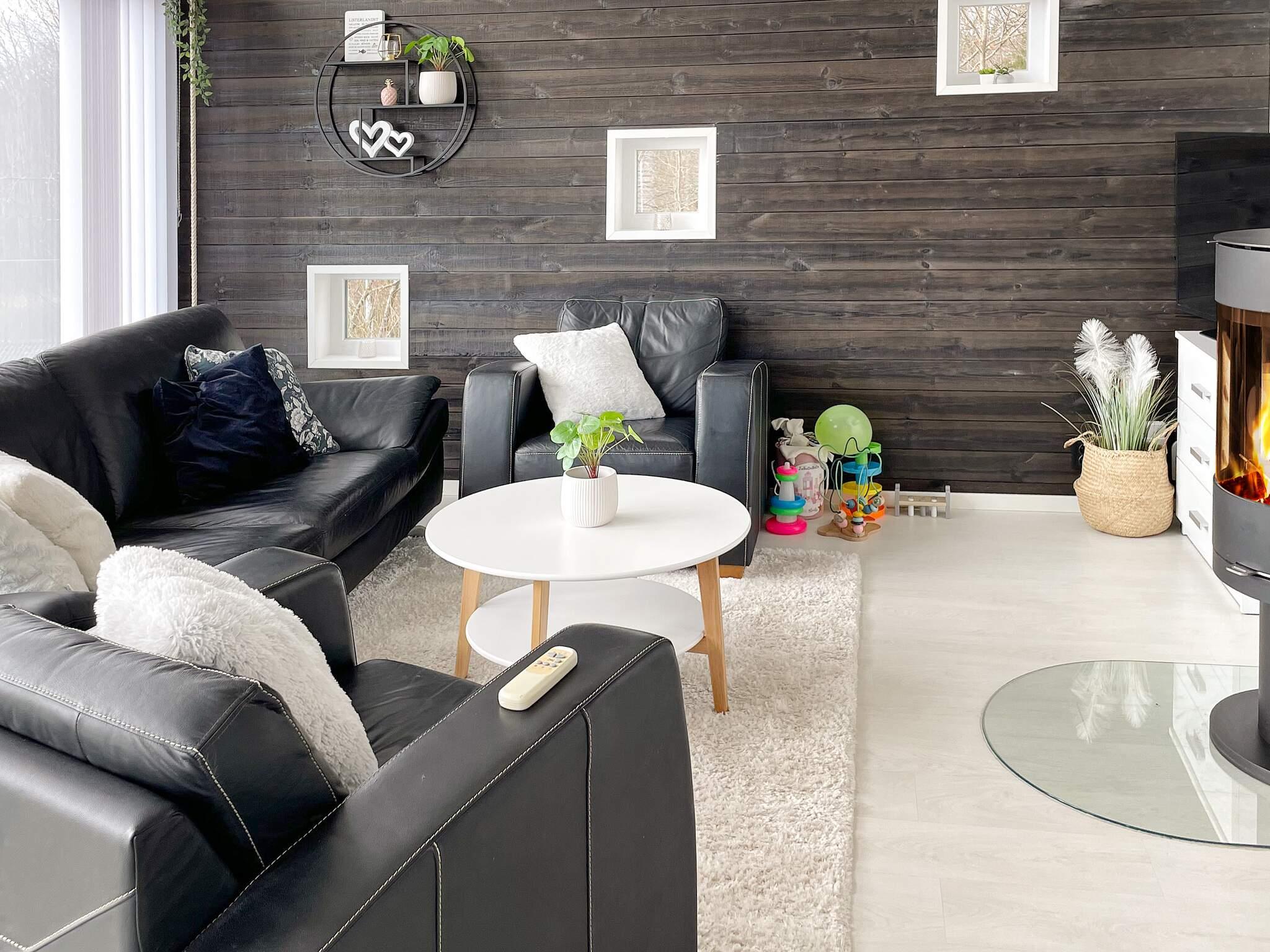 Trappor leder dig från parkeringen upp till huset med vacker vit träfasad. Redan i hallen får man uppleva högt till tak med vacker och modern inredning. Första sovrummet med våningssäng har plats för 3 personer då nedersta bädden är en dubbelsäng och övre är en normal enkelsäng. Nästa sovrum med heltäckningsmatta har dubbelsäng med altandörr ut på innergården. I passagen genom huset ligger det fräscha, rymliga badrummet med tvättmaskin och stora garderober för förvaring innan du möts av utsikten från den glasade gaveln av fönster i vardagsrummet. Rymden i detta rum blir stor med både högt till tak och vackert ljusinsläpp. Här finns kamin att elda i för att förhöja mysfaktorn och tv som du styr med ditt egna tv utbud genom fri tillgång till WIFI. Härifrån en rak och brant trappa utan räcke upp till sov loftet med en låg bubbelbädd på den ljusa heltäckningsmattan. Stor barnvänlig begränsning finns här. Loftet har utsikt mot havet men även mot hallen uppifrån. Barstolar vid köksön i det fullutrustade köket för självhushåll men dessutom matsalsmöbler att samlas kring för måltider i gemenskap. Även här en dörr ut på den stora terrassen med bekväma sittmöbler att spendera lata dagar i solen på.