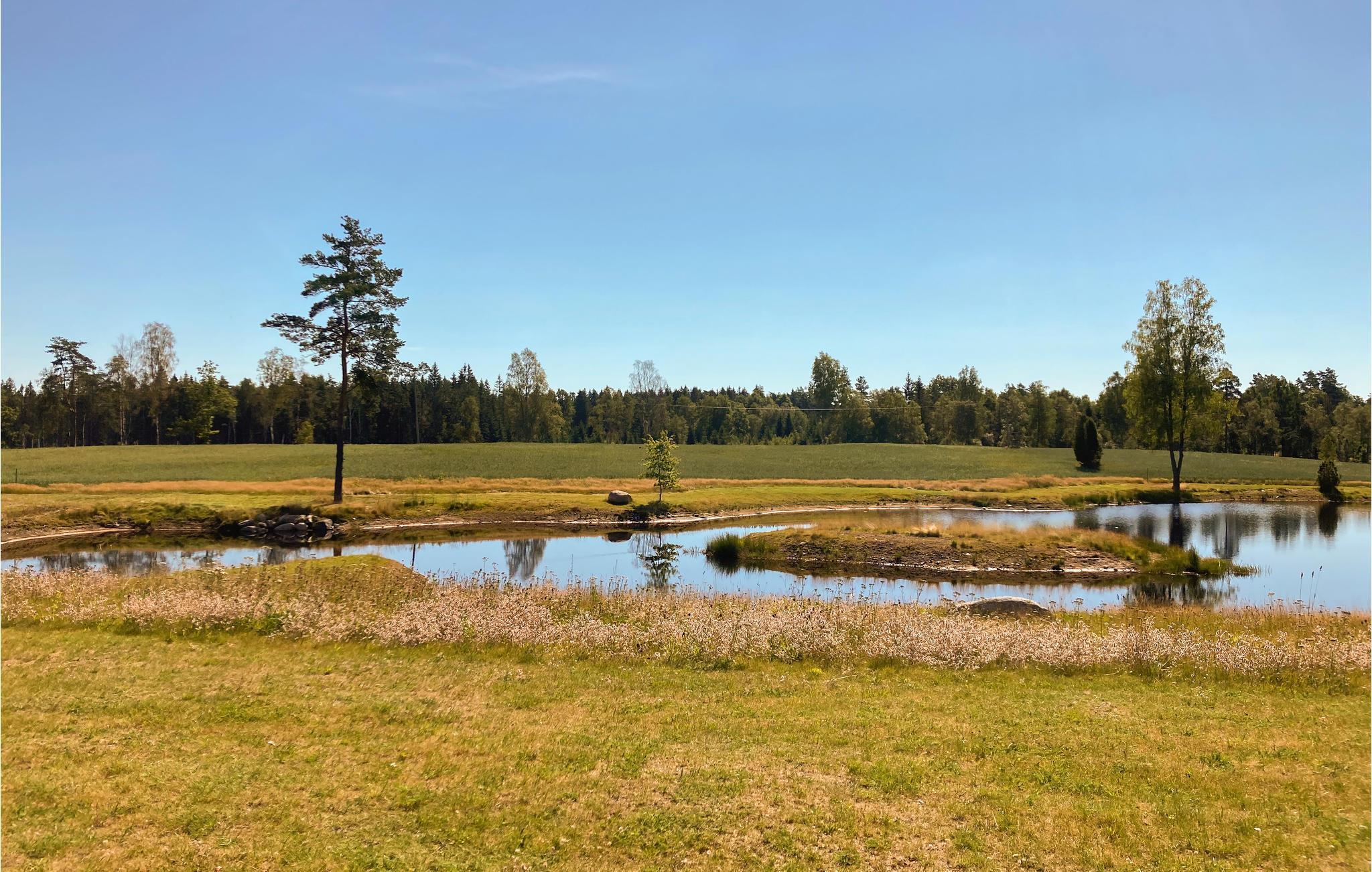 Vackert hus med egen badsjö med strand precis framför dörren.