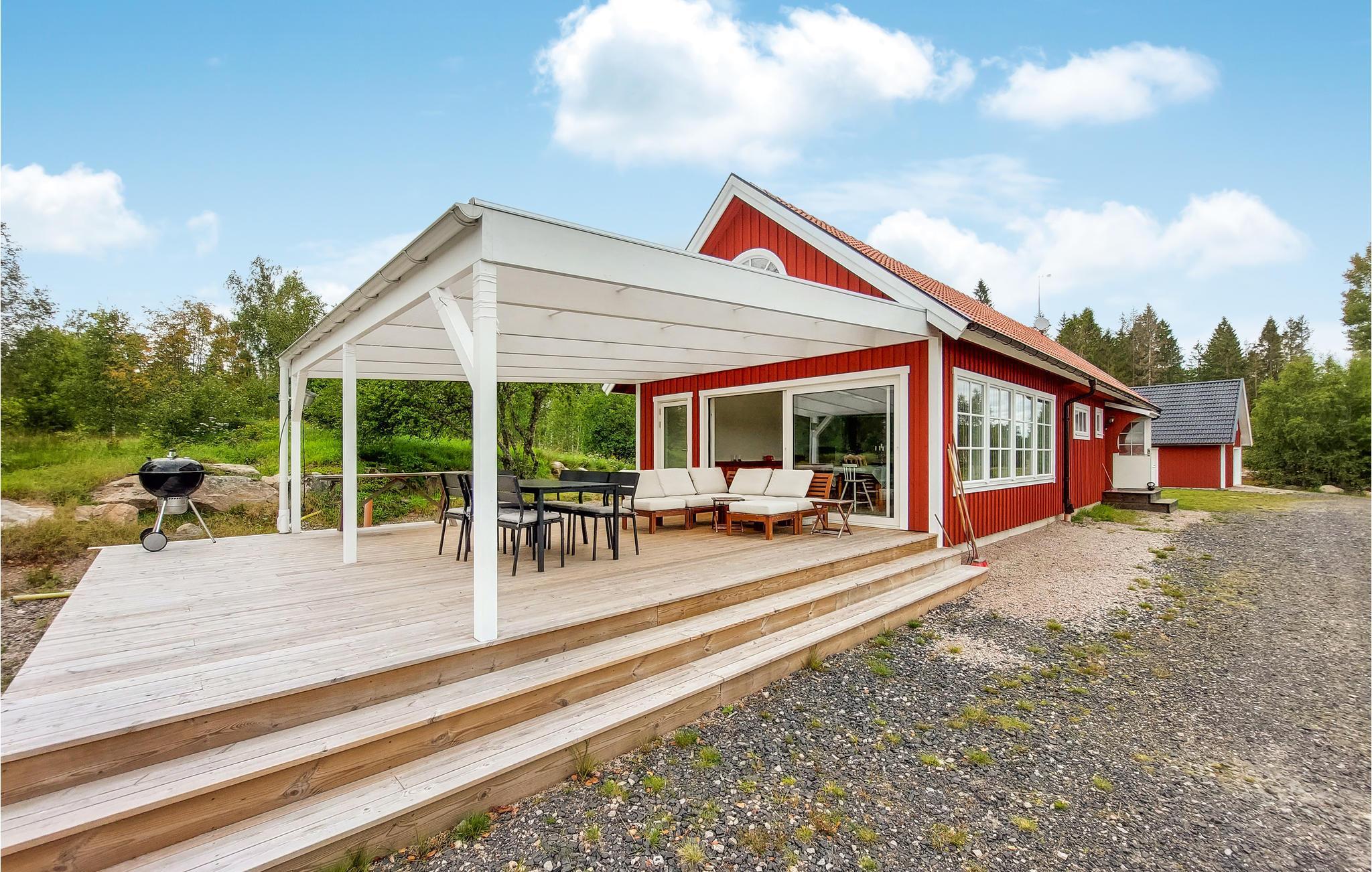 Välkommen till detta trevliga och ljusa hus med ett mycket rymligt vardagsrum med utsikt över din egen badsjö. Här kan du tillsammans med dina nära och kära trivas, koppla av och utnyttja utrymmet för spel och gemensamma måltider. Det stora vardagsrummet gränsar till en lika rymlig och täckt träterrass, som inbjuder dig att tillbringa tid utomhus. Till glädje för stora och små kan ni njuta av sommarvädret på er privata sandstrand och badsjö och tillbringa många timmar med att simma och sola. Kvällarna kan sedan avrundas med grillning och i de högkvalitativa trädgårdsmöblerna.