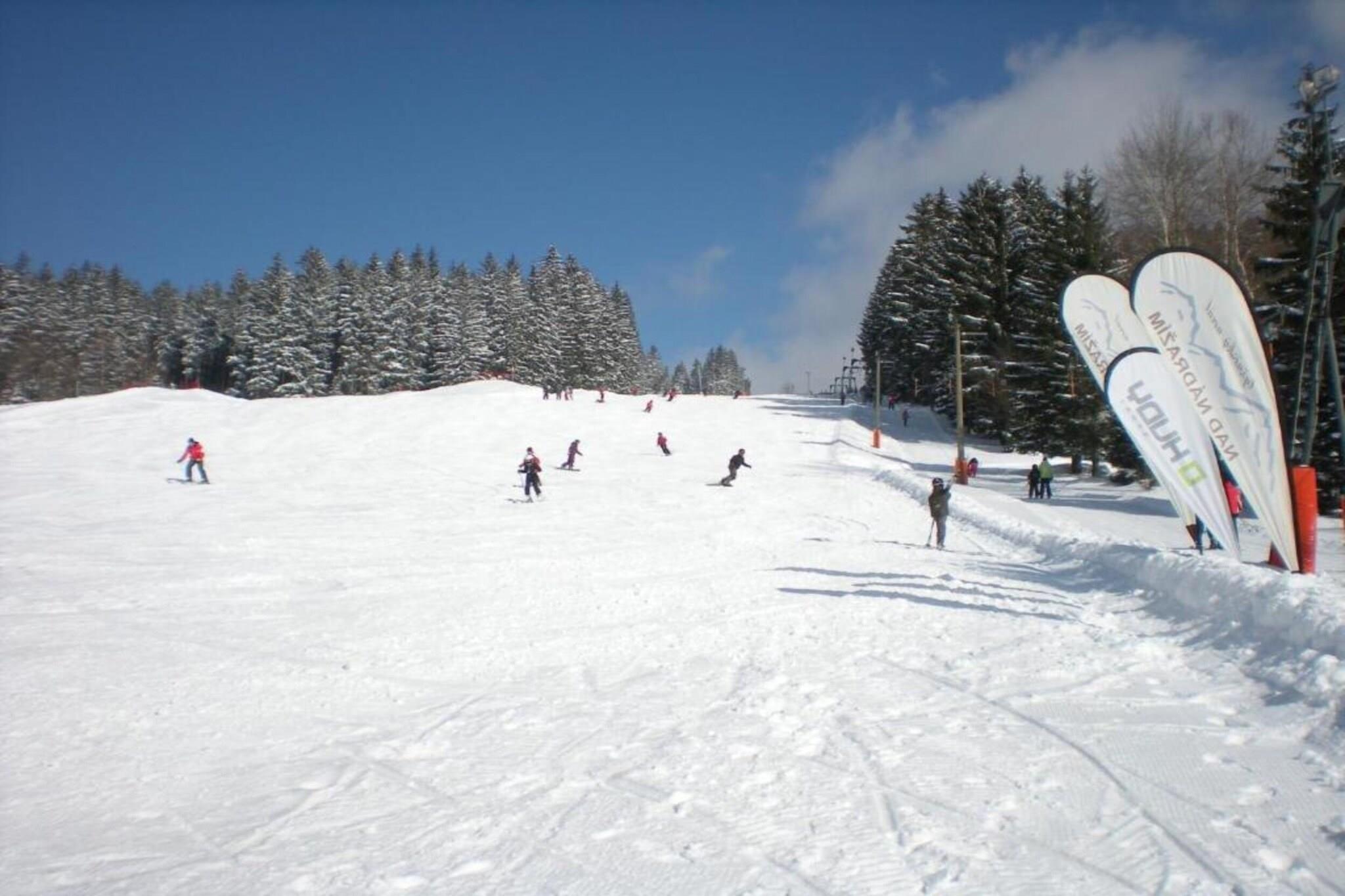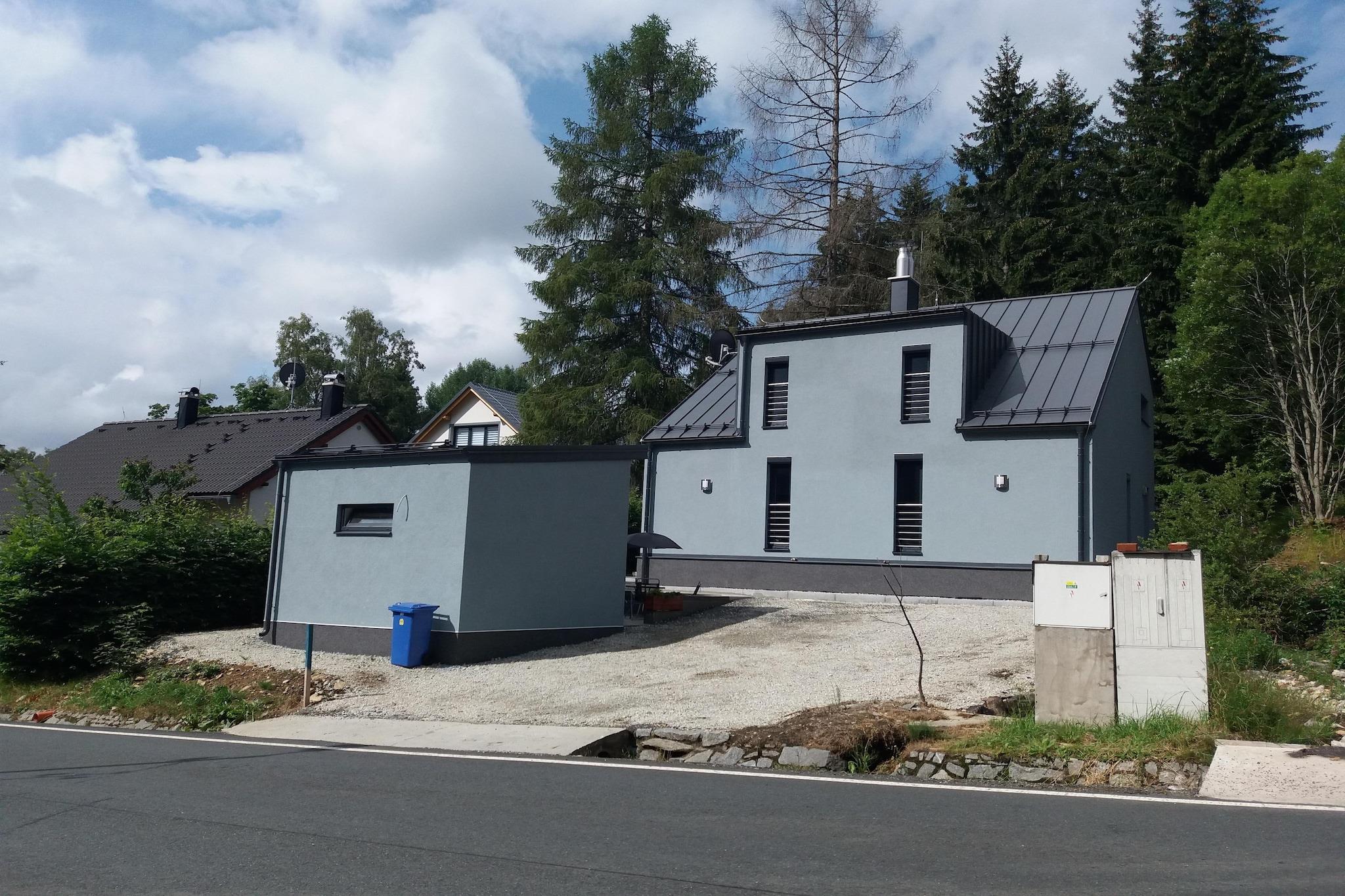 Modern Forest Retreat Detta bekväma semesterhus med två sovrum i Železná Ruda rymmer upp till fem gäster, vilket gör det idealiskt för familjer eller grupper av vänner. Huset ligger i Böhmerskogen och erbjuder ett mysigt vardagsrum, ett fullt utrustat öppet kök och ett badrum. Skid- och cykelförvaring finns på bottenvåningen, medan parkering och centralvärme garanterar en bekväm och avkopplande vistelse. Skid- och sommaräventyr Beläget bara 500 meter från den nedre stationen i linbanan Špicák, kan vinterbesökare njuta av skidåkning, skidskolor och närliggande uthyrningsmöjligheter. På sommaren är området perfekt för cykling, vandringsleder och skogsutforskning. Tågstationen och busshållplatsen ligger 400 meter bort, vilket ger enkel tillgång till omgivande städer. Restauranger ligger bara 80 meter från huset, och allmän mat finns i Železná Ruda, 1,8 km bort. Husdjursvänliga alternativ Husdjur är välkomna under vissa perioder med förvarning, så att du kan ta med dig din lurviga följeslagare. Utforska skogsstigar, cykla tillsammans eller koppla av inomhus efter utomhusäventyr. Med sin kombination av moderna bekvämligheter, närhet till skidbackar och tillgång till naturen, erbjuder detta semesterhus en balanserad och minnesvärd vistelse i Böhmerskogen för både aktiva och fritidsresenärer.