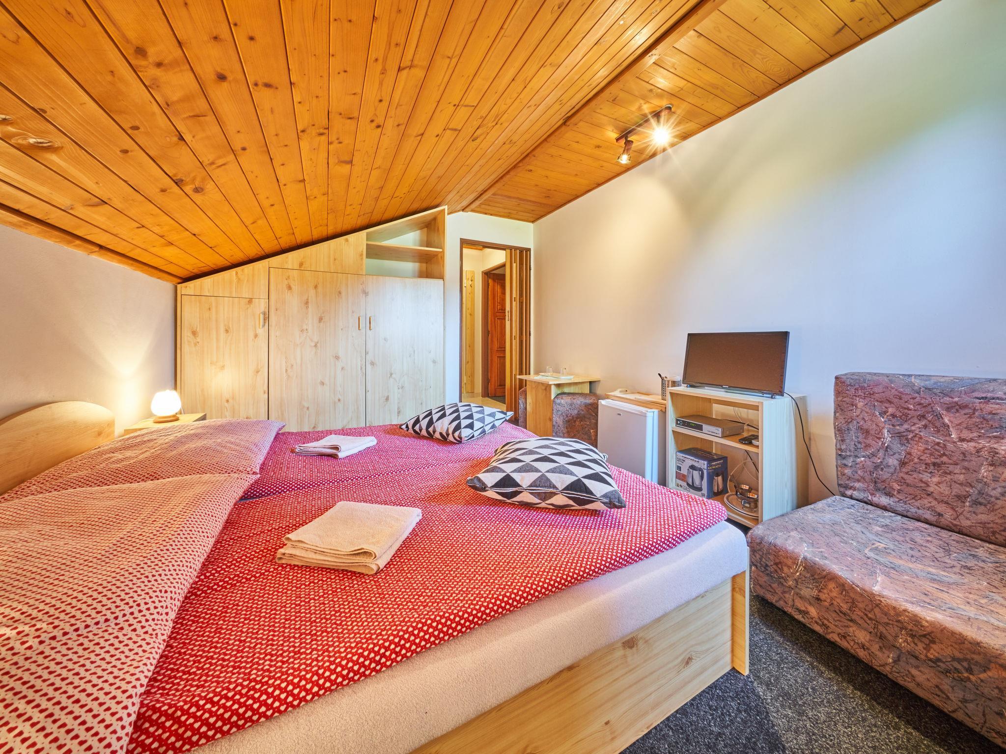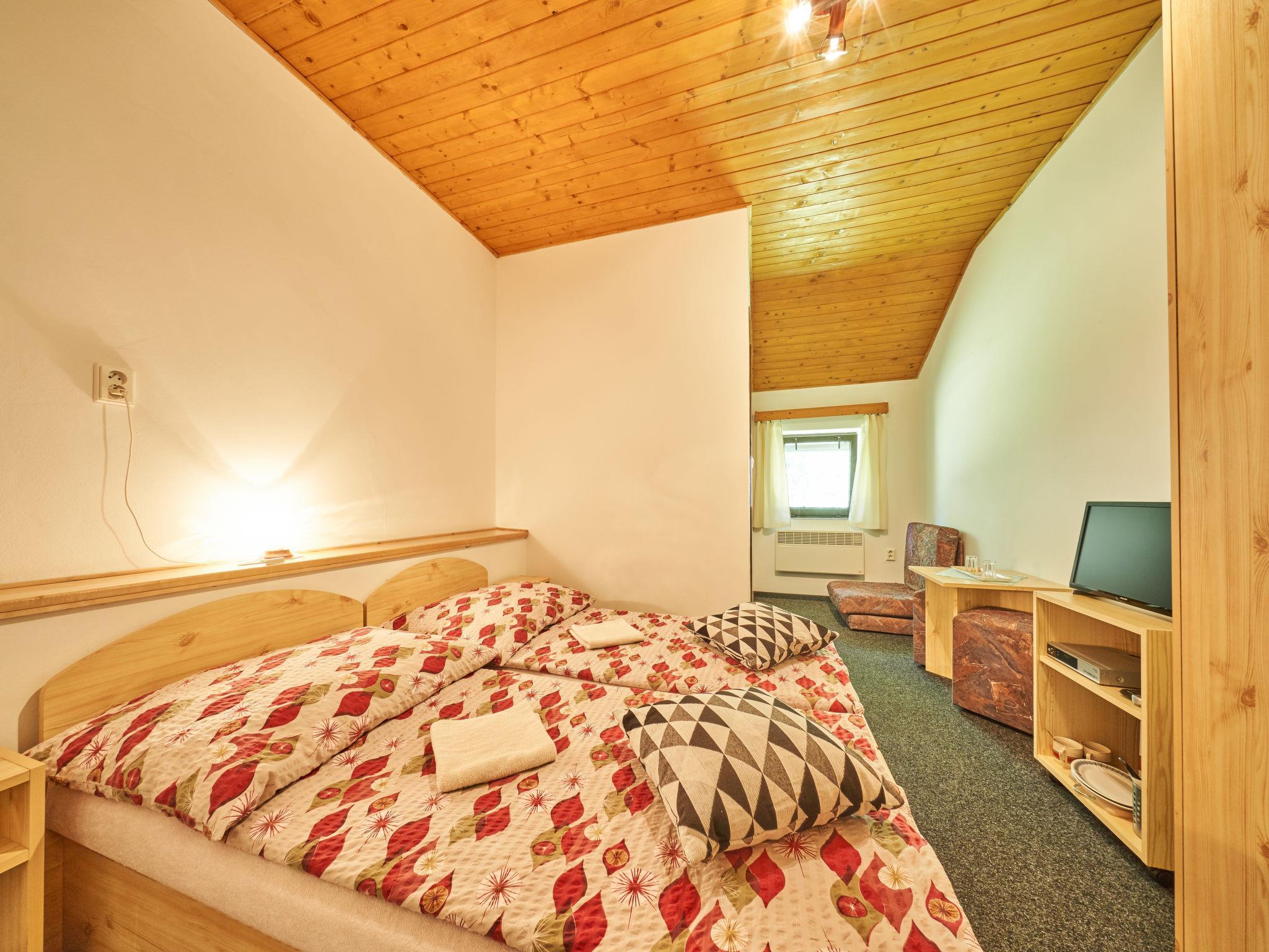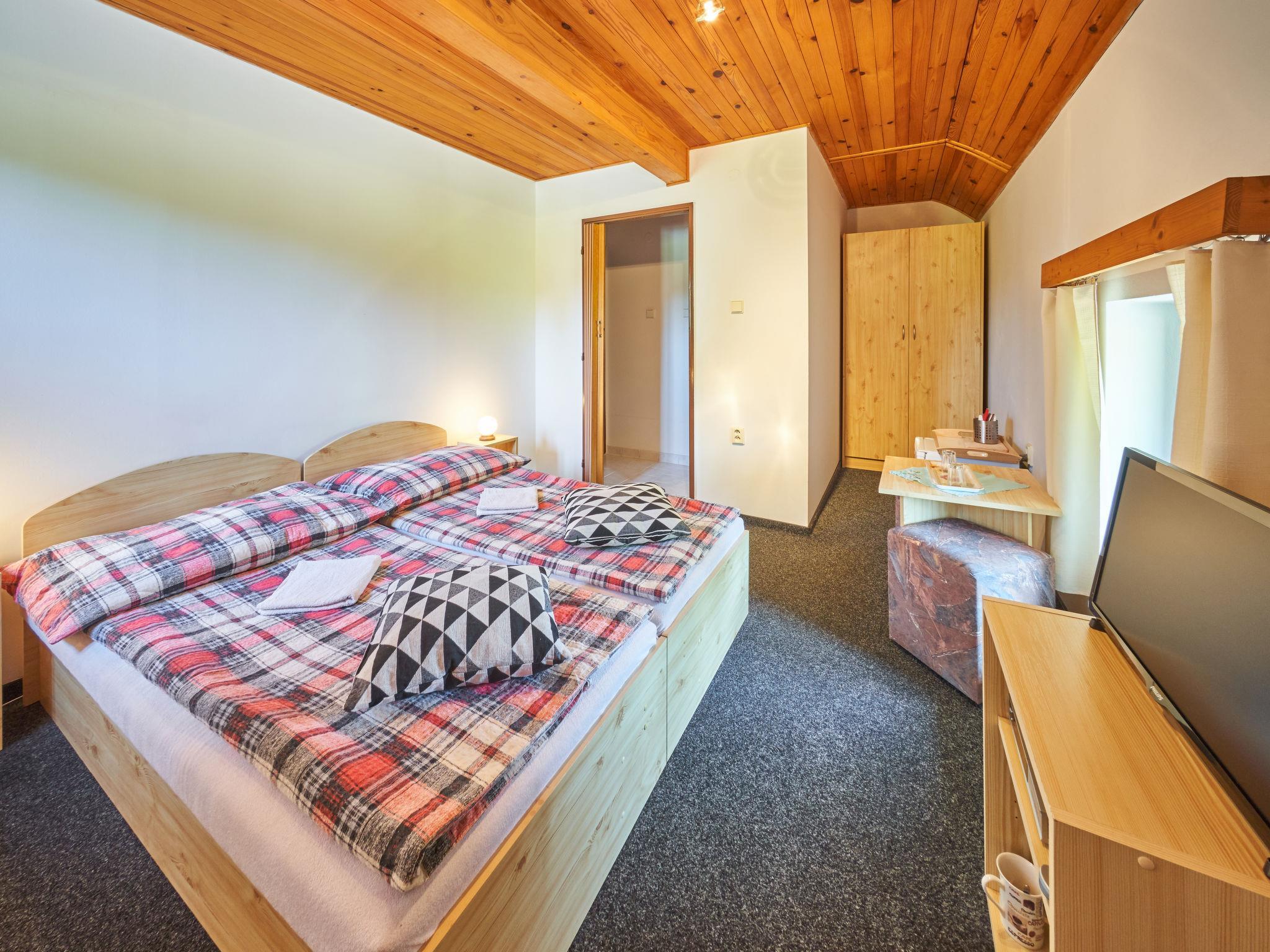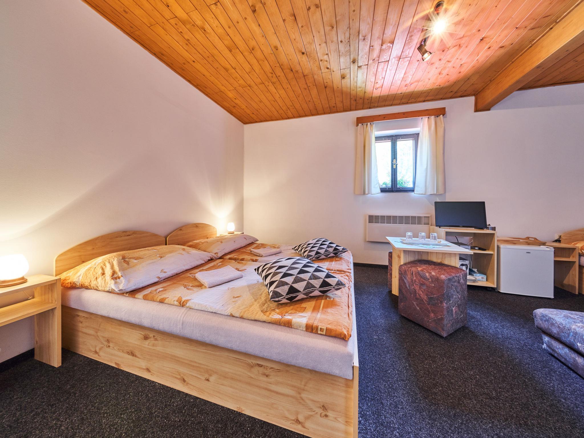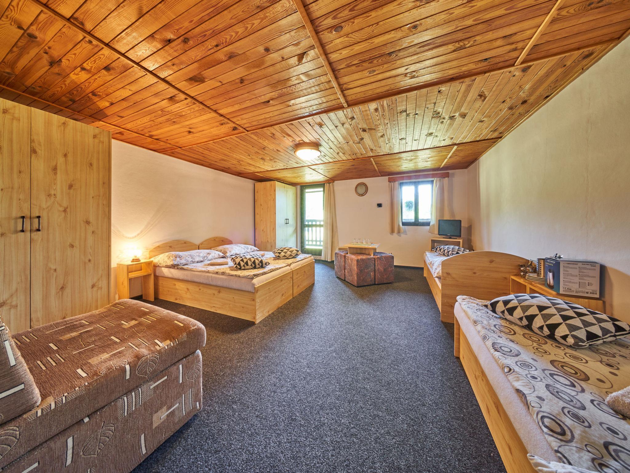 10-room house on 2 levels. Comfortable and cosy furnishings: living/sleeping room with 2 beds and TV (flat screen). 1 double bedroom. Large living/dining room with kitchen corner, bar and TV (flat screen). Kitchen (4 hot plates, oven, microwave) with dining table. Bathroom, bidet, sep. WC. Heating. Upper floor: 3 double bedrooms, each room with shower/WC and TV. 1 room with 3 beds, shower/WC and TV. 2 rooms, each room with 4 beds, shower/WC and TV. Playroom. Beautiful view of the garden and the forest. Facilities: washing machine, children's high chair. Internet (WiFi, free). Suitable for families.