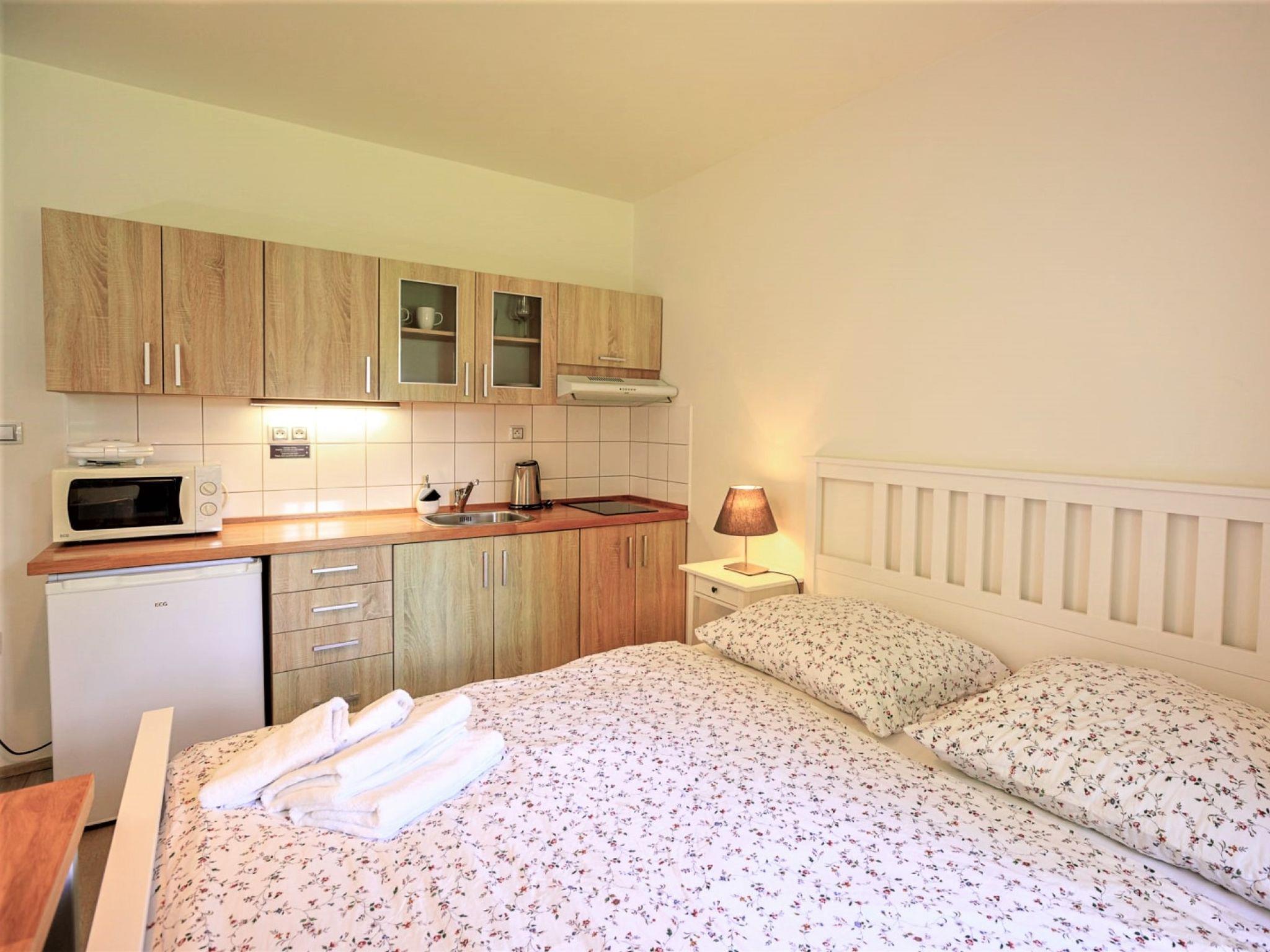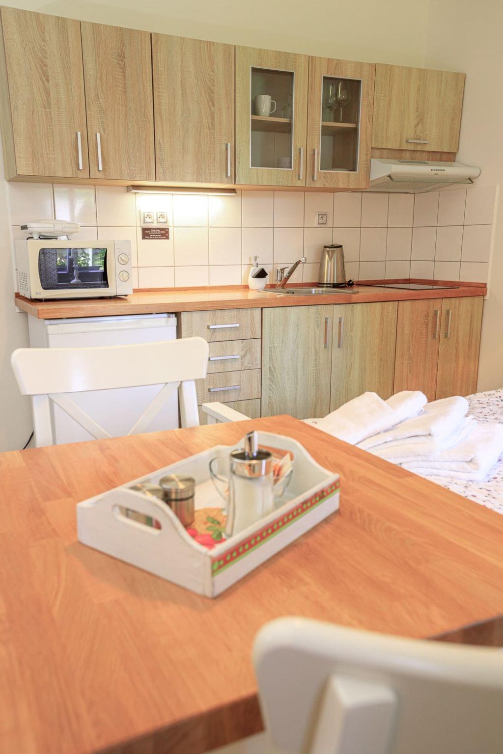 "Arnoltice 3", 1-room apartment on the ground floor. Entrance hall. Living/sleeping room with 1 double bed and satellite TV. Kitchenette (2 ceramic glass hob hotplates, toaster, kettle, microwave) with dining table. Shower/WC. View of the garden. Facilities: Internet (WiFi, free). Please note: suitable for families. Non-smokers only.