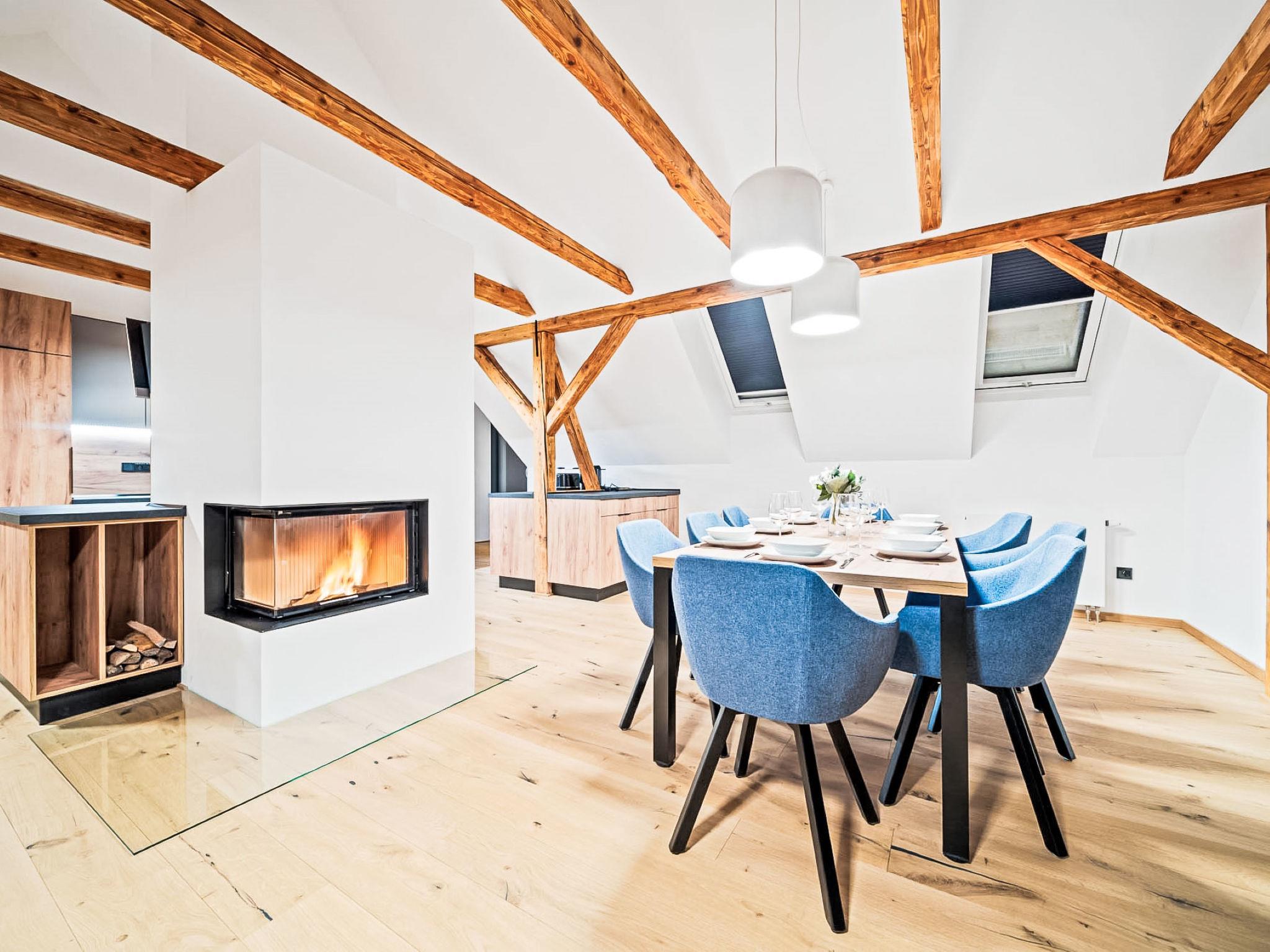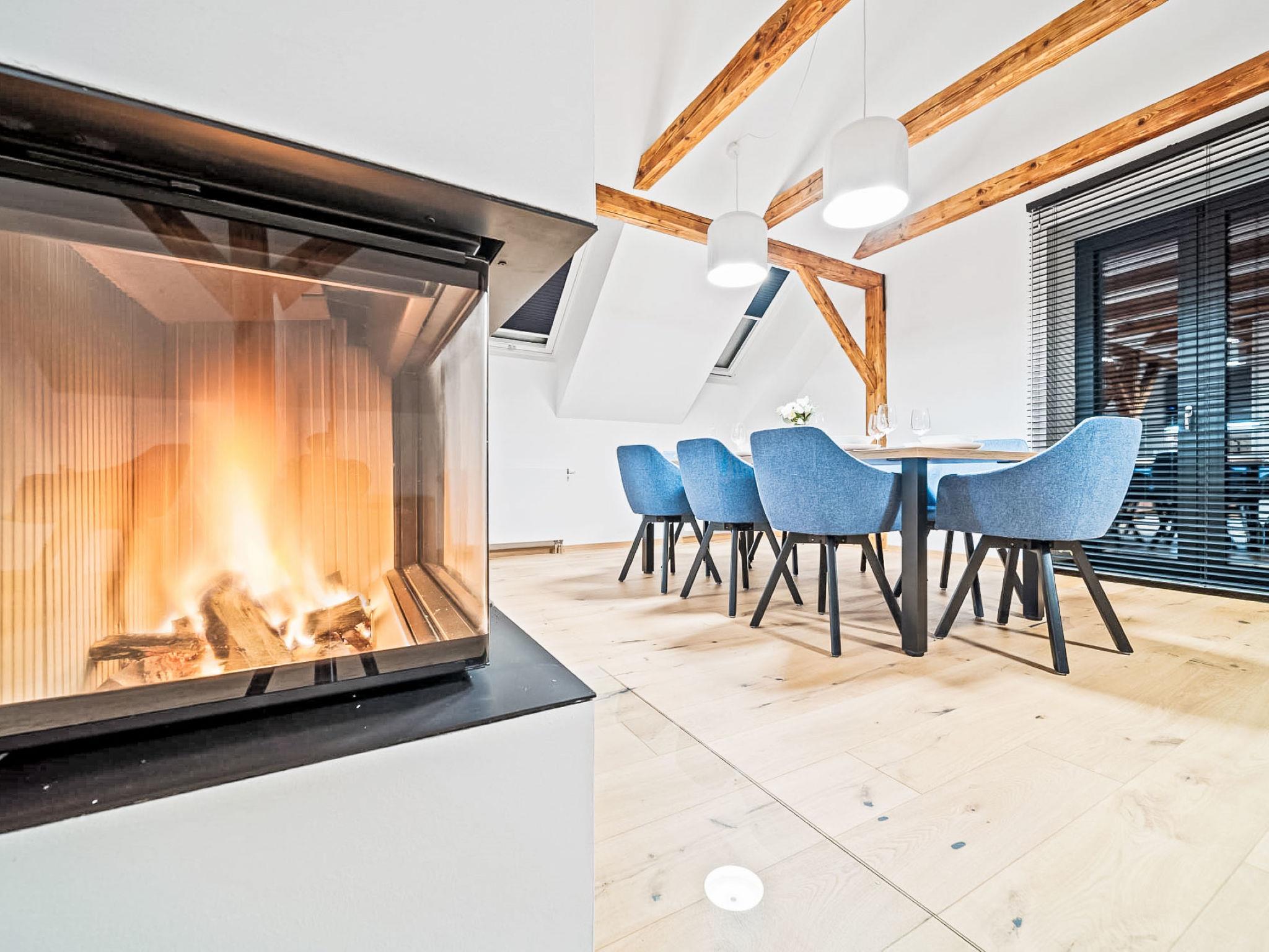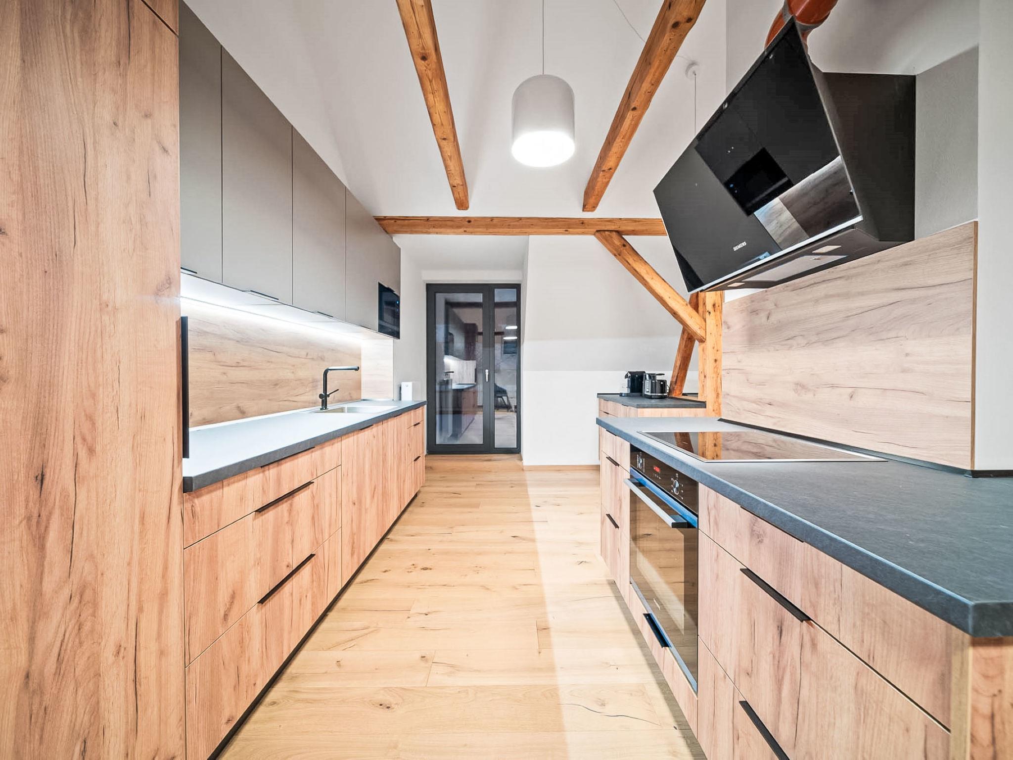 7-room house on 2 levels. Comfortable and modern furnishings: living room with Scandinavian wood stove and TV. 3 rooms, each room with 1 bed and 1 double bed. Kitchenette (oven, 4 ceramic glass hob hotplates, kettle, microwave) with dining table. 3 showers/WC. Upper floor: 2 rooms, each room with 1 double bed. 1 room with 1 bed and 1 x 2 bunk beds. Kitchenette (oven, 4 ceramic glass hob hotplates, kettle, microwave, electric coffee machine). Shower/WC, sep. WC. Gas heating, wood heating, floor heating. Terrace. Terrace furniture. Facilities: Internet (WiFi, free). Suitable for families. Maximum 2 pets/ dogs allowed.