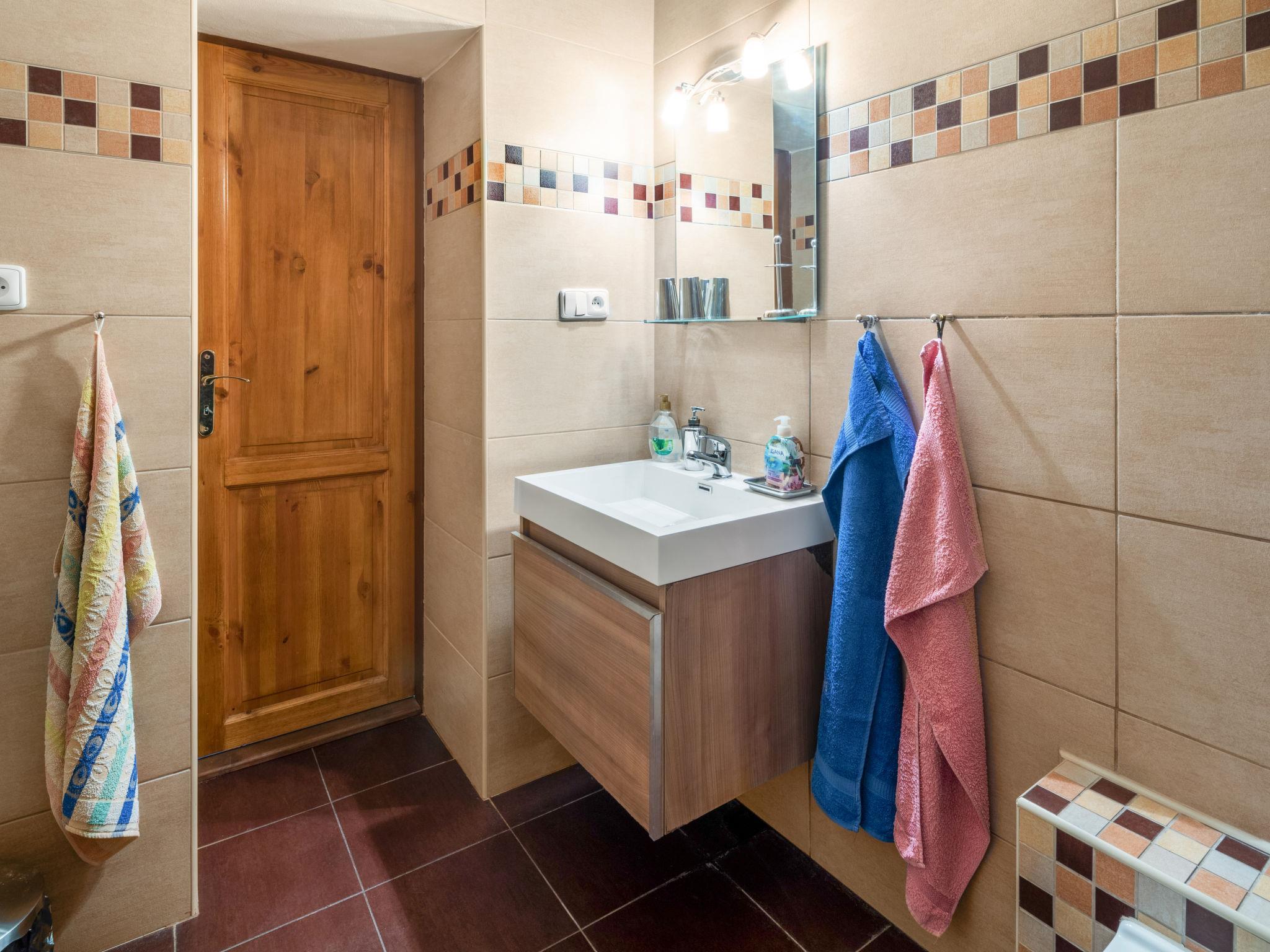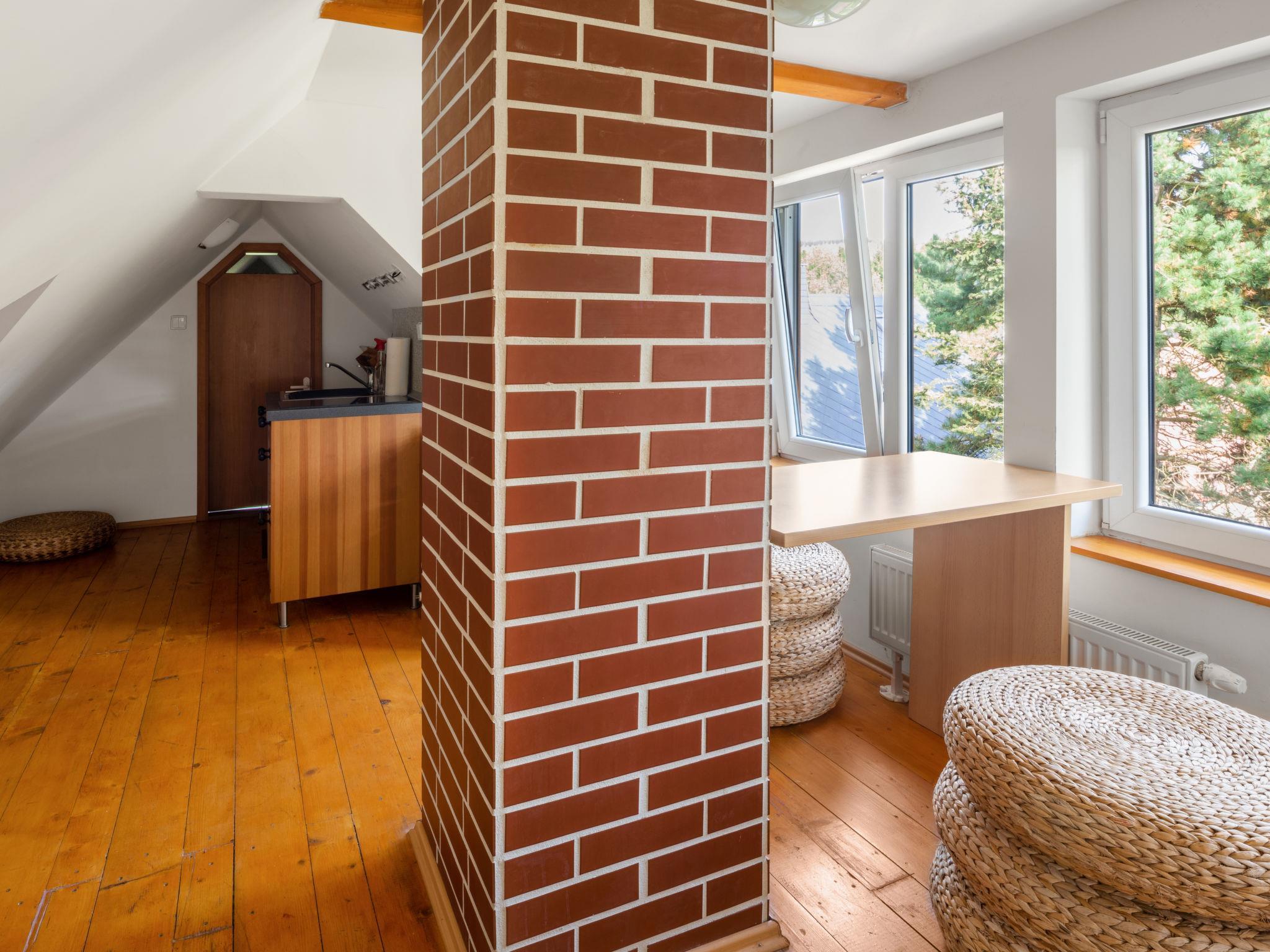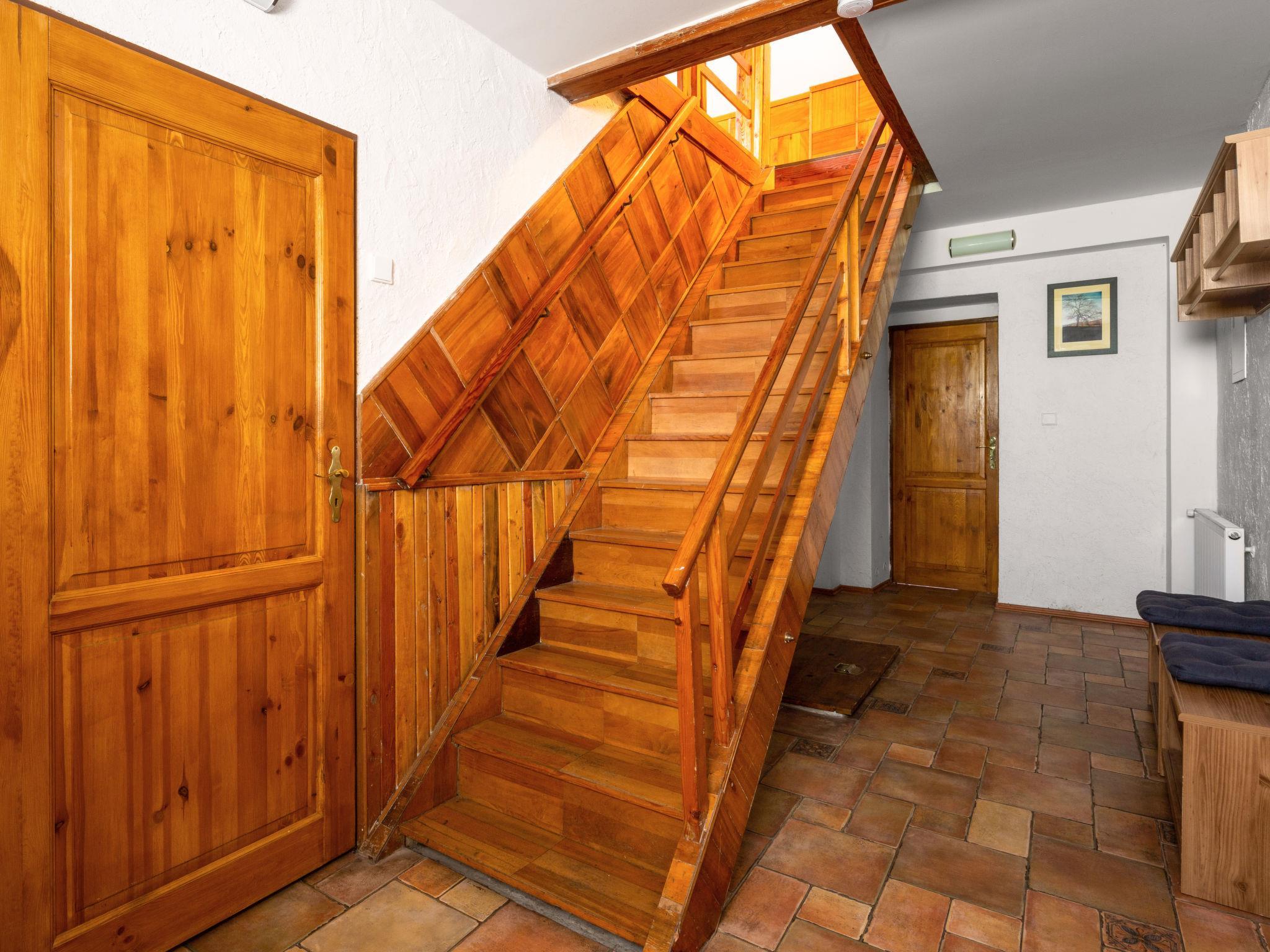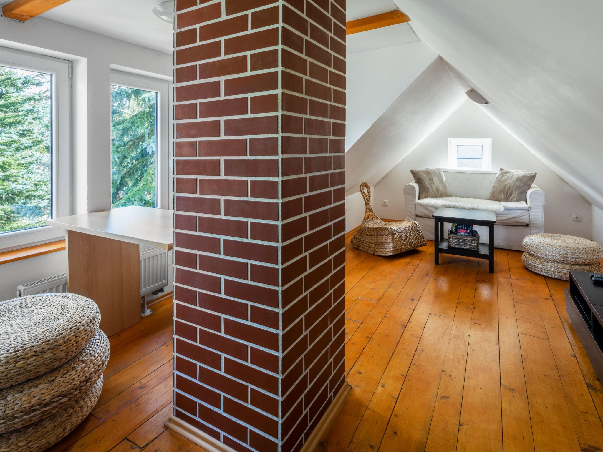 8-room chalet 200 m2 on 3 levels. Partly with sloping ceilings, practical and comfortable furnishings: entrance hall. Large living/dining room with open-hearth fireplace (only for decoration), dining table and satellite TV (flat screen), radio and DVD. Exit to the garden. Small lounge with open-hearth fireplace. Kitchen (oven, dishwasher, 4 ceramic glass hob hotplates, toaster, kettle, microwave, freezer, grill, electric coffee machine) with dining table. Shower/WC. Electric heating. Upper floor: (steep stair) interconnecting room with 1 double sofabed. 3 rooms with sloping ceilings, each room with 2 beds. 1 room with sloping ceilings with 3 beds. Top floor: (open staircase) living/sleeping room with sloping ceilings with 1 bed, 1 sofabed, dining table, kitchen corner, bath/WC and satellite TV (flat screen). Please note: suitable for families. Maximum 1 pet/ dog allowed. Smoke alarm, fire extinguisher.