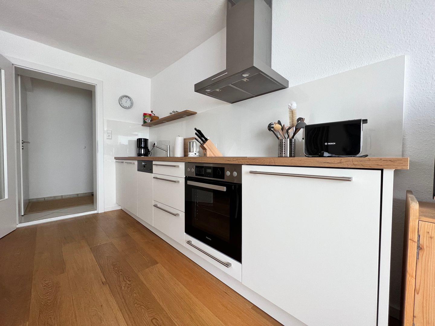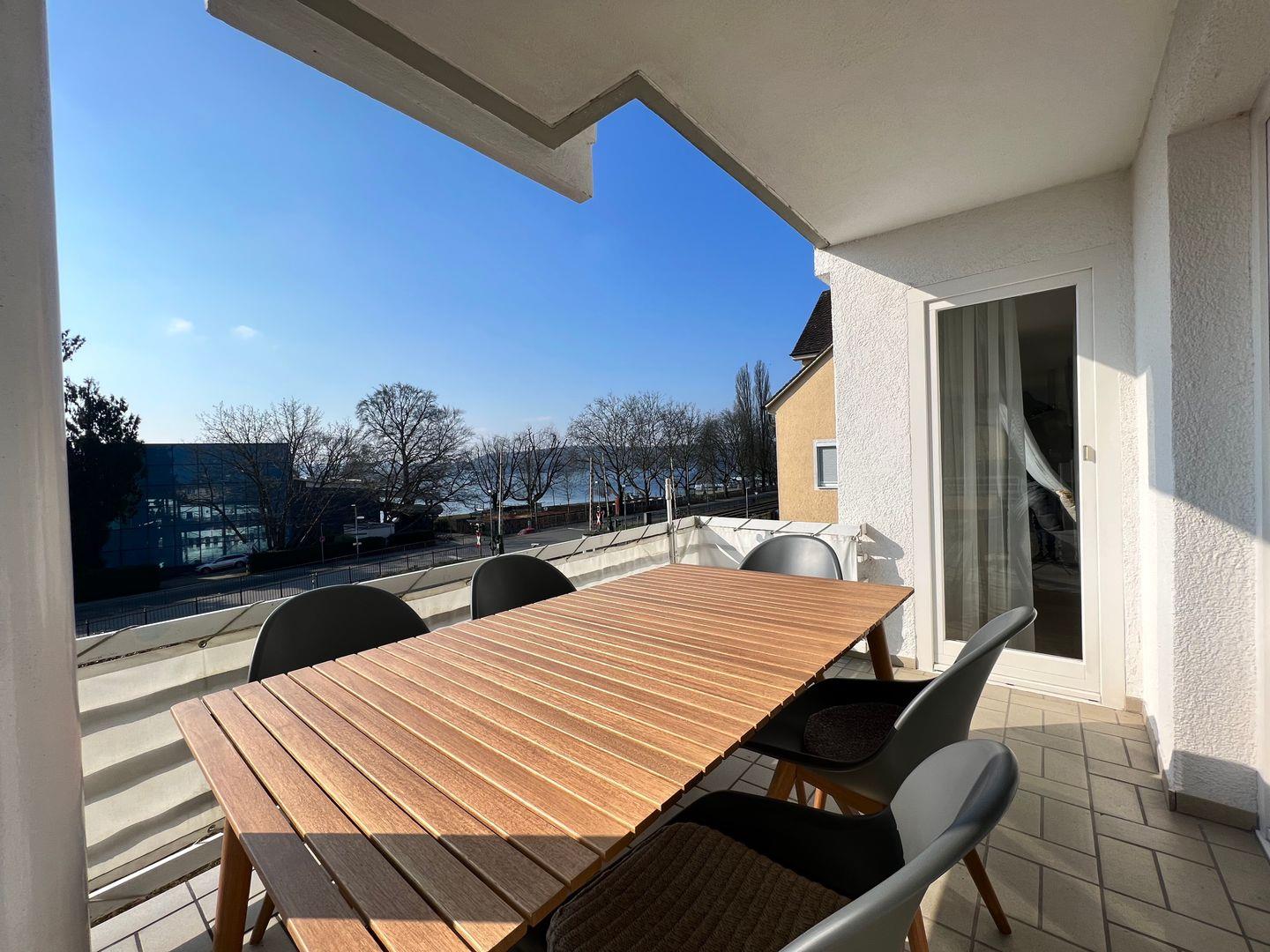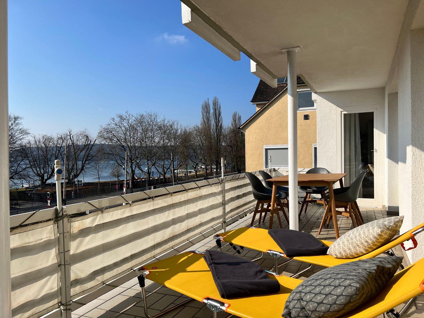 Das sonnendurchflutete Wohnzimmer bietet neben einer gemütlichen Wohnlandschaft und einem Fernseher einen separaten Essplatz. In der Küchenzeile erwartet Sie eine neue, hochwertig ausgestattete Einbauküche mit Geschirrspüler, Ceranfeld, Backofen, Kühlschrank mit Gefrierfach, Kaffeemaschine, Wasserkocher, ausreichend Geschirr, Besteck und Gläser sowie alle notwendigen Küchenutensilien. Die großzügige Terrasse bietet einen umfassenden Seeblick und kann von allen Räumen der Wohnung betreten werden. Die Ferienwohnung ist mit zwei Badezimmern, jeweils mit Dusche, Toilette und Waschbecken, ausgestattet. Eines der zwei Schlafzimmer verfügt zusätzlich über ein eigenes Waschbecken.