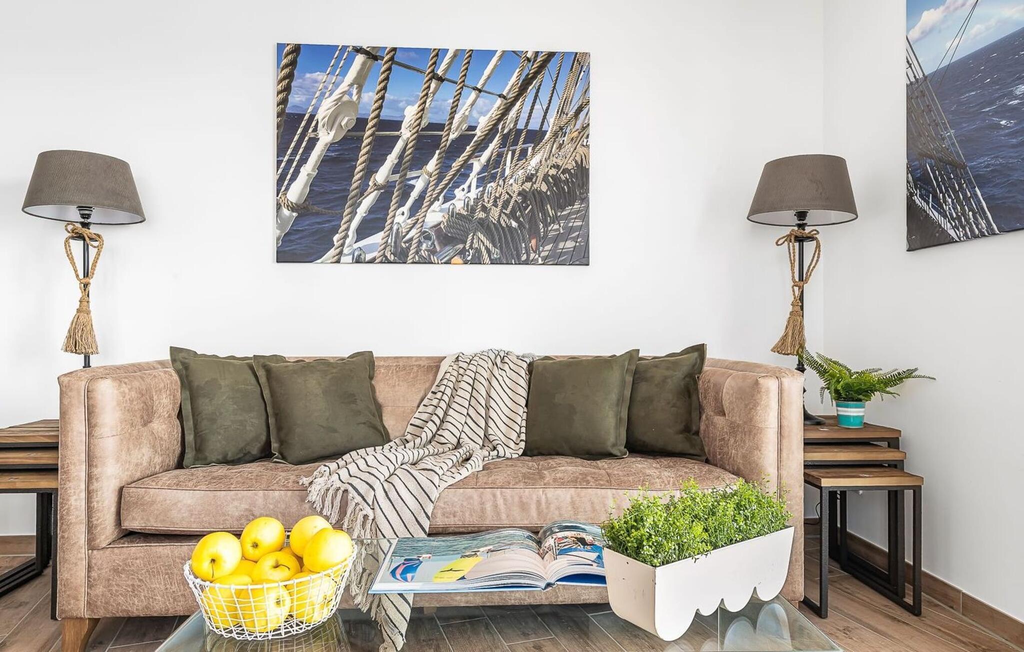 I vardagsrummet väntar en bekväm soffgrupp och snygga maritima dekorationer. Under regniga dagar kan ni läsa en god bok här eller titta på en film tillsammans.