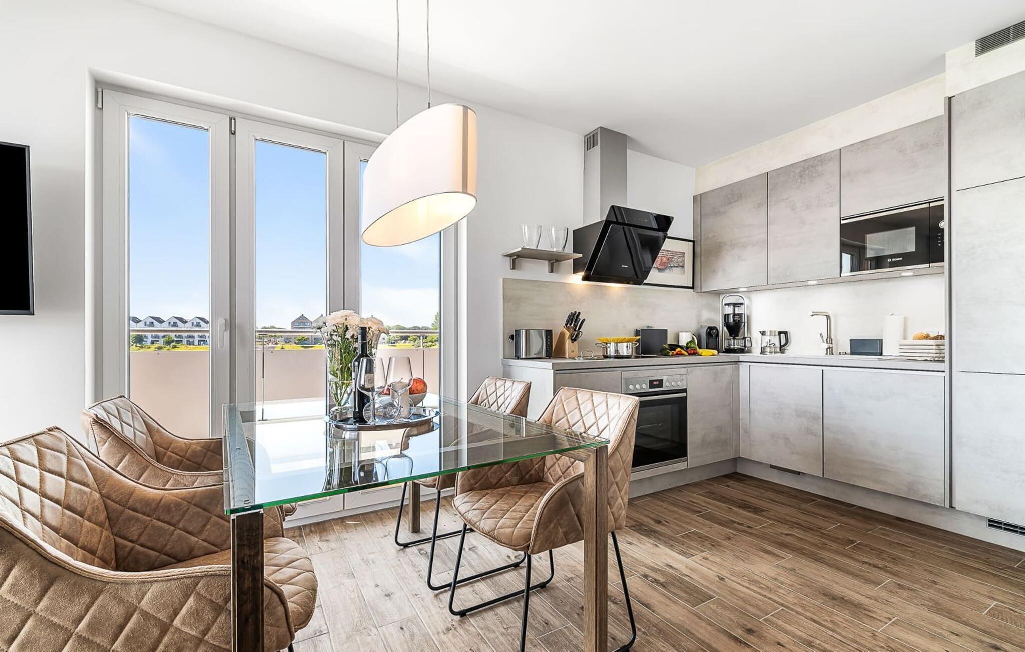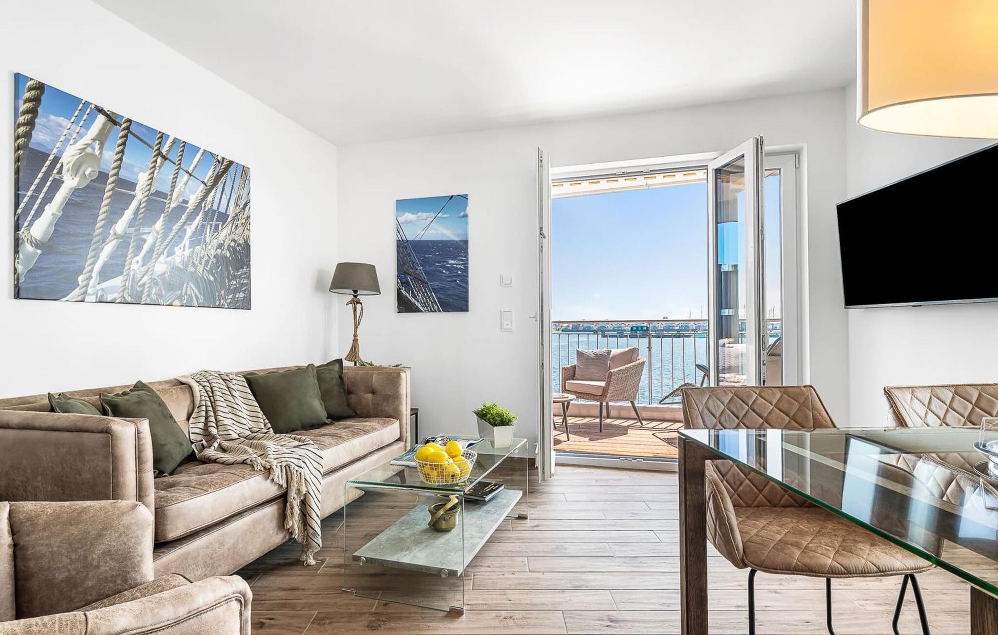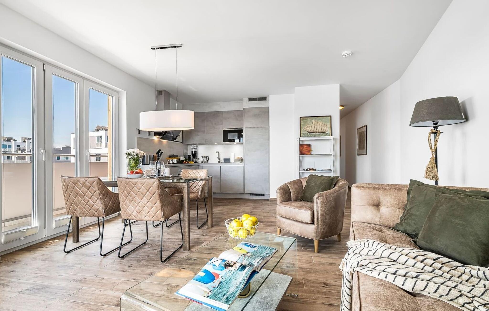 Den öppna planlösningen med vardagsrum och integrerat kök ger en rymlig boendekänsla. Från vardagsrummet har du tillgång till den stora terrassen med utsikt över hamnbassängen mot Östersjön. Njut av de spektakulära soluppgångarna här med ett morgonkaffe. Utsikten över hamnen, fartygen och det avlägsna Östersjön ger dig känslan av att vara en amiral på en lång resa för en stund.