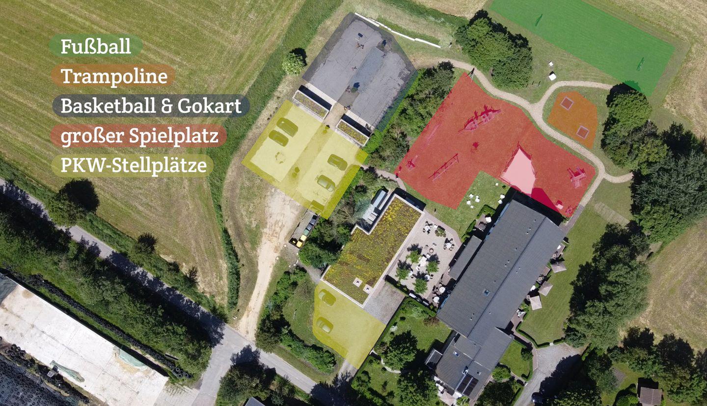 Der groß angelegte Spielplatz auf dem Grundstück ist eine Wohlfühloase für Ihre Kinder - von Seilbahn und Schaukel über ein Basketballfeld bis Trampolin gibt es viele Möglichkeiten zum Austoben. Der Spielplatz steht ausschließlich den Gästen der Ferienanlage Landliebe zur Verfügung. Bei schlechtem Wetter erheitern Tischtennis und Kicker sowie eine "Ecke" zum Spielen und Toben die Gemüter. In einem vom restlichen Garten abgetrennten Bereich lädt die Fass-Sauna mit Ruheraum und Außendusche zum Relaxen in Strand-Ambiente ein - Erholung pur! Der große Parkplatz mit E-Auto-Ladestation auf dem Grundstück rundet das Angebot ab.
