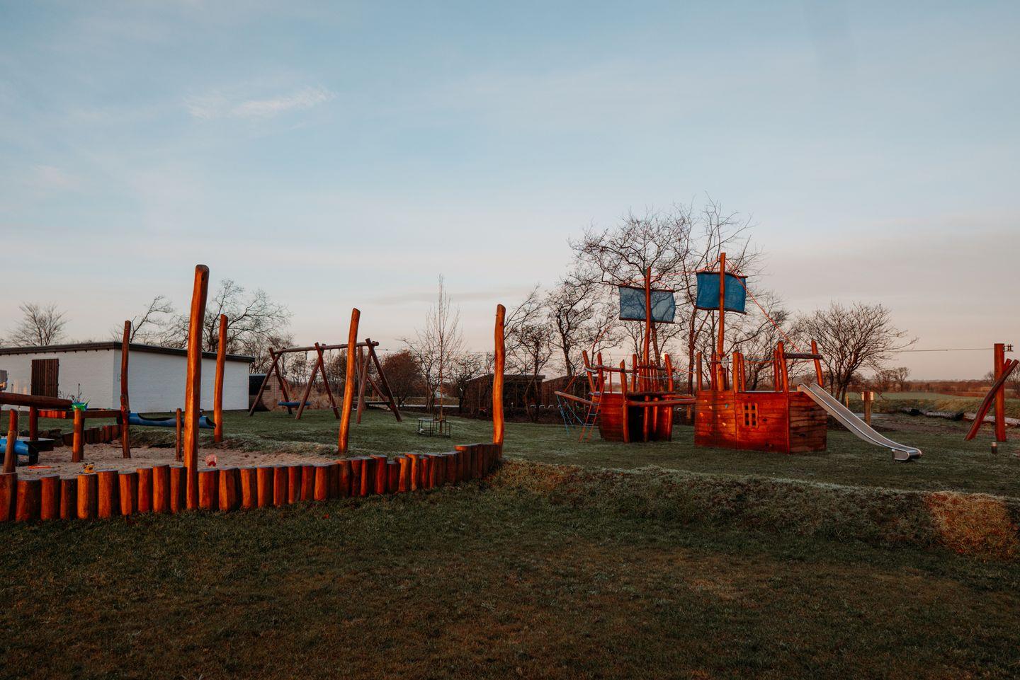 Der groß angelegte Spielplatz auf dem Grundstück ist eine Wohlfühloase für Ihre Kinder - von Seilbahn und Schaukel über ein Basketballfeld bis Trampolin gibt es viele Möglichkeiten zum Austoben. Der Spielplatz steht ausschließlich den Gästen der Ferienanlage Landliebe zur Verfügung. Bei schlechtem Wetter erheitern Tischtennis und Kicker sowie eine "Ecke" zum Spielen und Toben die Gemüter. In einem vom restlichen Garten abgetrennten Bereich lädt die Fass-Sauna mit Ruheraum und Außendusche zum Relaxen in Strand-Ambiente ein - Erholung pur! Der große Parkplatz mit E-Auto-Ladestation auf dem Grundstück rundet das Angebot ab.