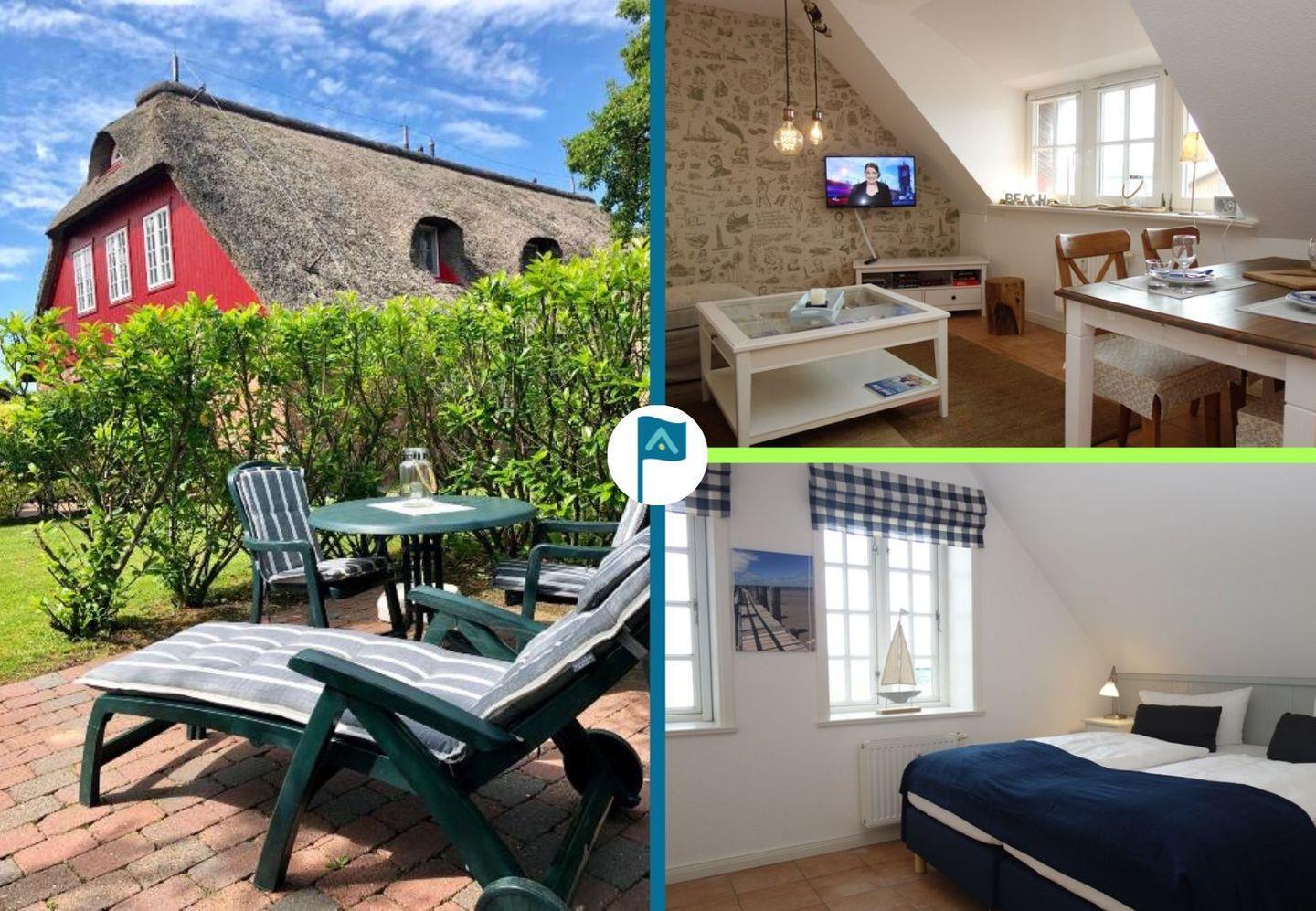 Das Hüs Dikstian in Alkersum bietet 5 Ferienwohnungen verschiedener Größe. Hier stellen wir Ihnen die Wohnung 5 im 1.OG vor. Kommen Sie herein in diese kuschelige Wohnung, die in weißen, sandfarben und Blautönen schon Urlaubsfeeling beim "herein kommen" ausstrahlt. Das Wohnzimmer mit Essplatz und offener Küche, das Schlafzimmer in blau-weiß und das Badezimmer, teilw. schon neu gestaltet, strahlen so viel Frische und Gemütlichkeit aus, wie man es nicht überall findet. Treten Sie ein und lassen sich gefangen nehmen.