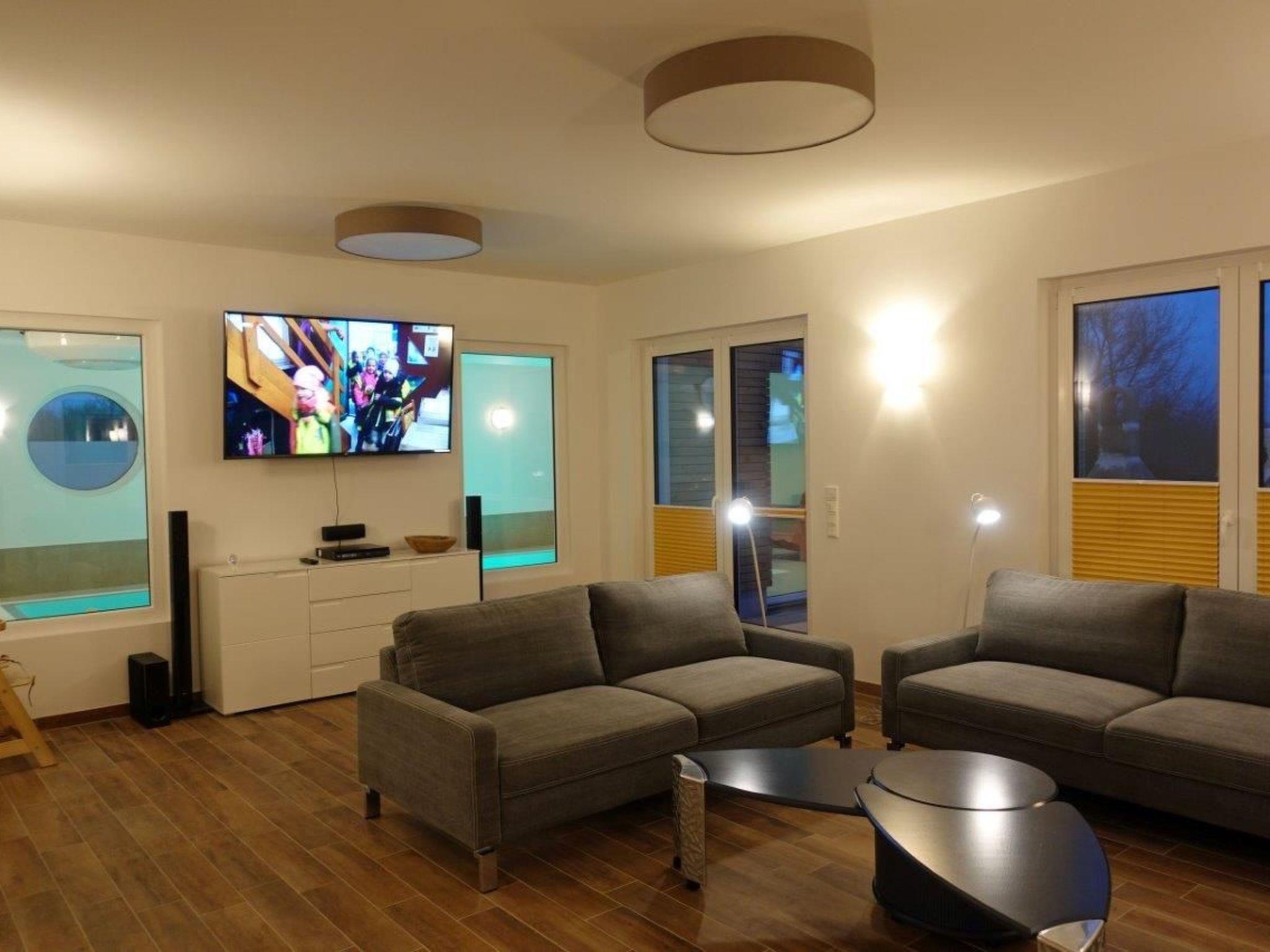 You can watch the children in the swimming pool through the panoramic window in the living room and watch TV at the same time. All bedrooms are equipped with TV. You can listen to music via the TV or via Bluetooth speakers. The seating areas inside and on the large terrace can accommodate up to 8 people. A large awning protects you from the sun and rain - the beach chairs and seats offer a holiday feeling outside.