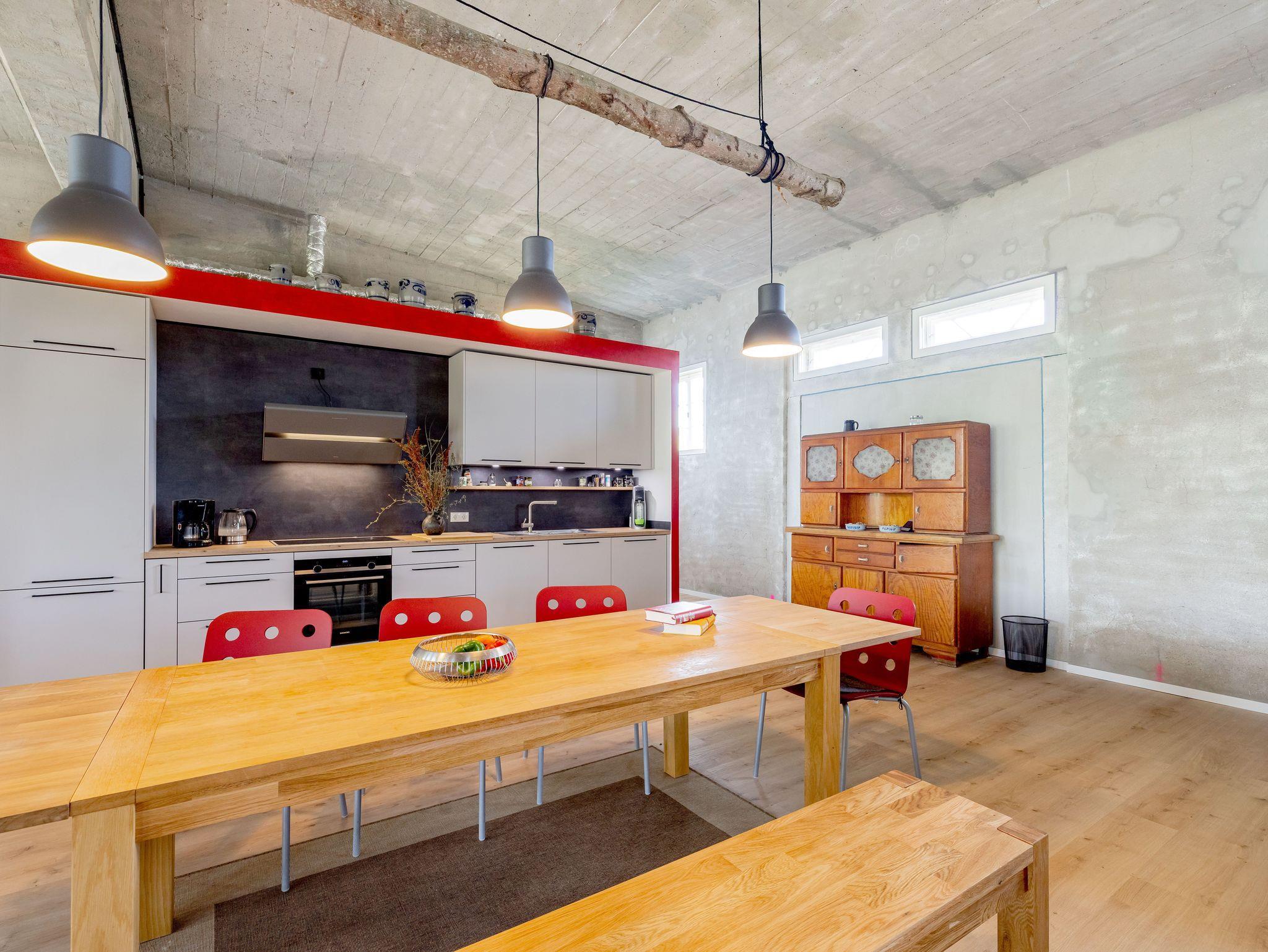 Der zentrale Treffpunkt im Gebäude ist der große Wohnbereich in den eine vollständige Küche mit Essbereich integriert ist. Vom Wohnbereich aus kommt man in die vier einzelnen Schlafzimmer, die alle mit Doppelbetten (bei Bedarf auch als Einzelbetten nutzbar) ausgestattet sind. Die 3 Bäder sind ebenso separat zugänglich, so dass auf Durchgangszimmer gänzlich verzichtet wird. Der gesamte Innenbereich ist durch eine zentral gesteuerte Fußbodenheizung beheizt.