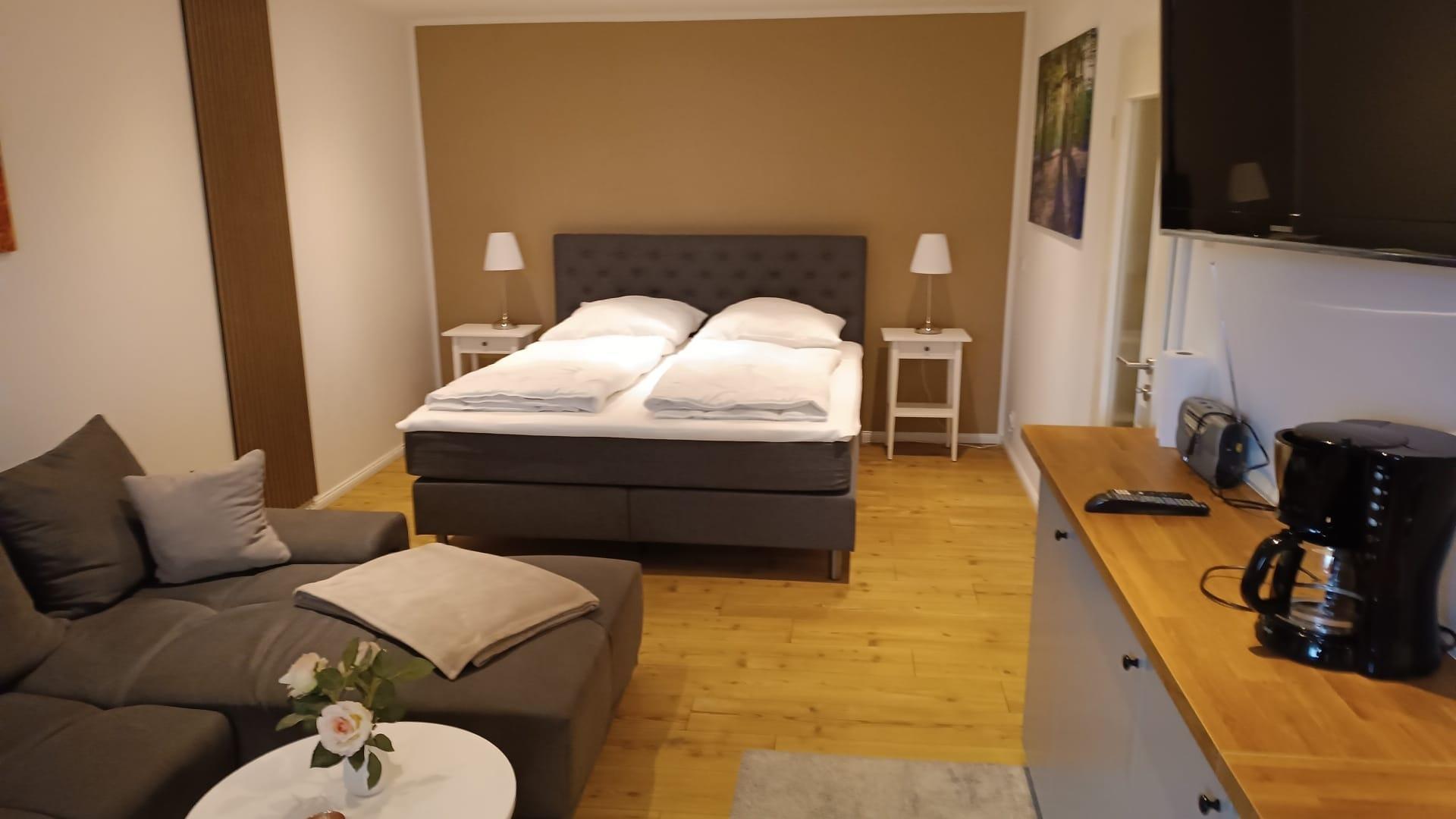 Die Wohnung wurde mit einem neuen Boxspringbett ausgestattet.
