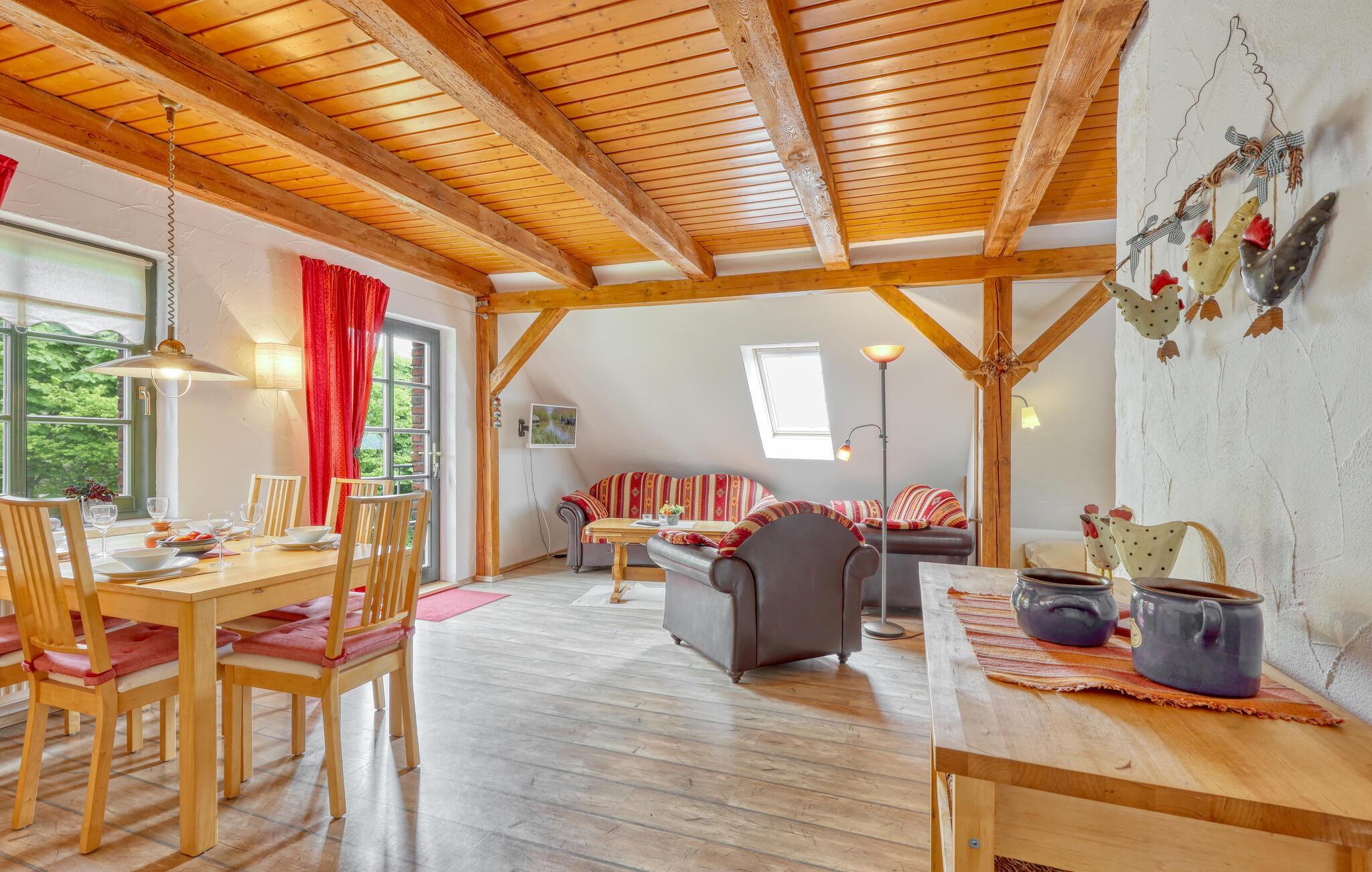 Semesterlägenheten med separat ingång ligger på översta våningen i ett bostadshus på en stor naturtomt. Fastigheten ligger i ett lugnt, avskilt läge i stadsdelen Gudderitz, ca 1 km från Altenkirchen. Östersjöstranden (Nonnevitz) ligger ca 3,5 km bort. Semesterlägenheten är utrustad med: Vardagsrum (stoppade möbler, TV, radio), kokvrå i öppen planlösning (elektrisk spis, kylskåp, mikrovågsugn, diverse köksutrustning, matvrå), sovalkov (dubbelsäng), låsbar sovalkov via brant trappa (2 sängar), dusch/toalett, centralvärme. Det finns en uteservering med grill och solplats, lekplats och parkeringsplats.