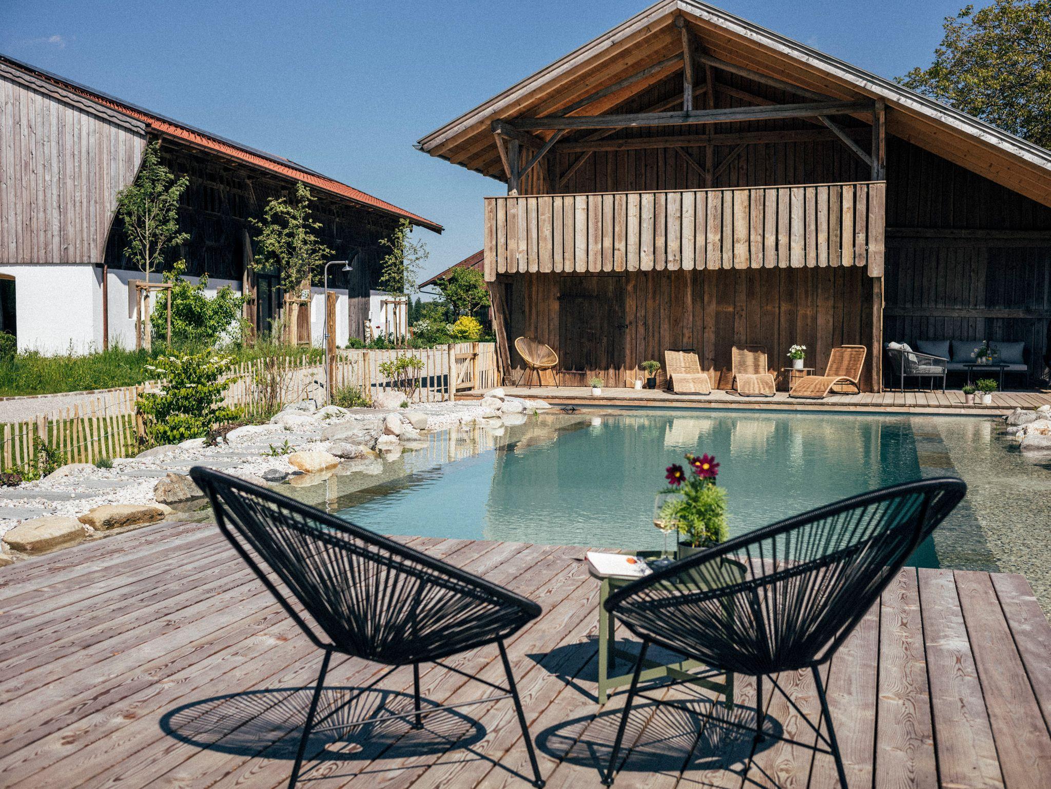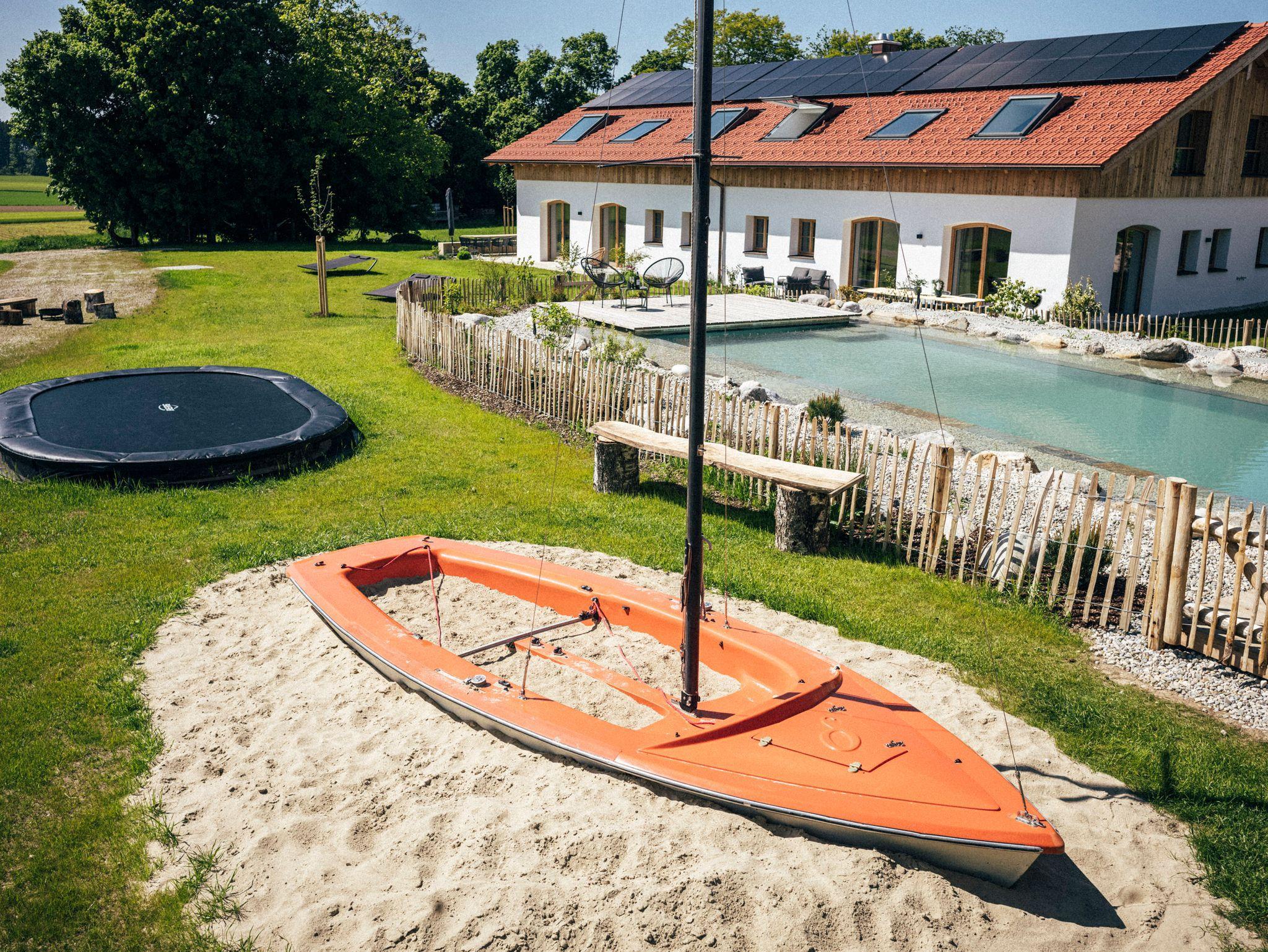 In unseren Grünflächen am Hof können groß und klein im schönen neuen Naturpool und den Wiesen rundherum Erholung finden, oder sich an Trampoin, Schaukel und Sandspielbereich austoben.
