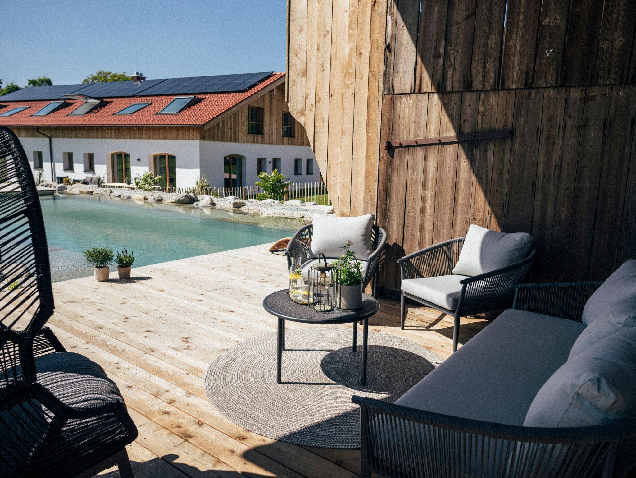 In unseren Grünflächen am Hof können groß und klein im schönen neuen Naturpool und den Wiesen rundherum Erholung finden, oder sich an Trampoin, Schaukel und Sandspielbereich austoben.