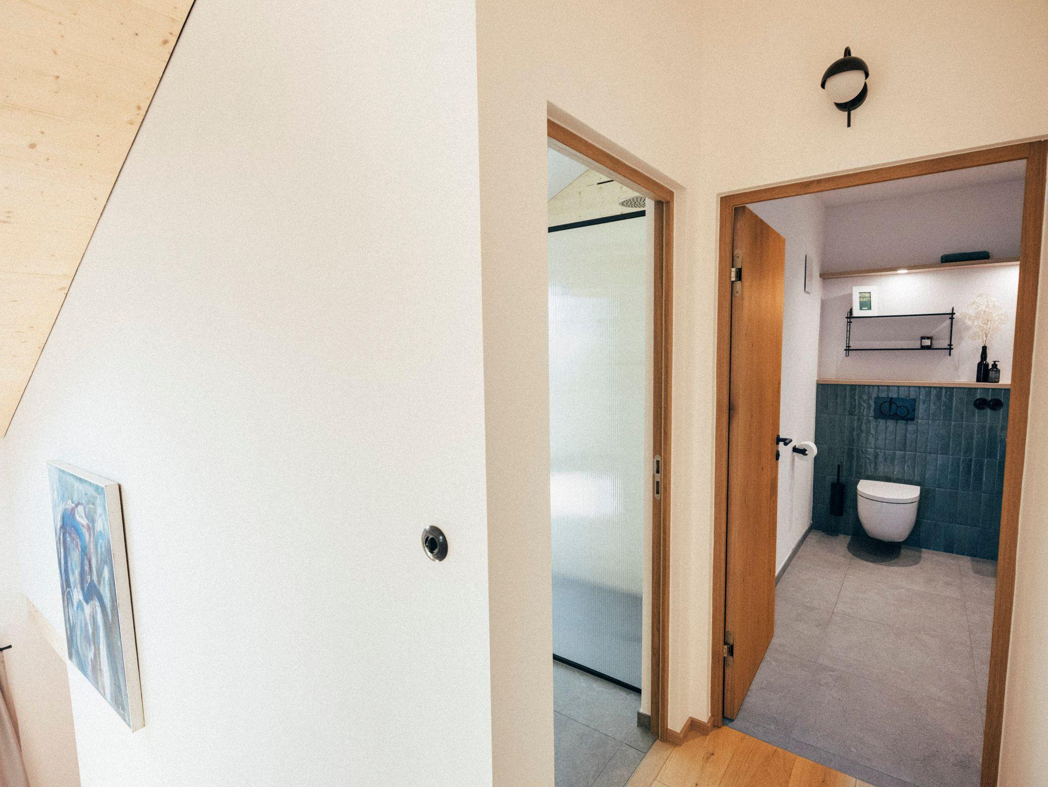Zwei der Schlafzimmer befinden sich im Erdgeschoss und sind mit einem Doppelbett ausgestattet. Ein Badezimmer befindet sich direkt daneben. Im Erdgeschoß liegt auch die große Wohnküche und der Wohnraum. Im Obergeschoss befinden sich drei Schlafzimmer. Eines davon mit Doppelbett, in einem der Zimmer kann man das Bett als Doppelbett, oder zwei Einzelbetten vorbereiten. Das dritte Zimmer im OG verfügt über zwei Einzelbetten. Zwei der Bäder sind im Obergeschoss, ebenso der Ruheraum mit Panoramasauna.
