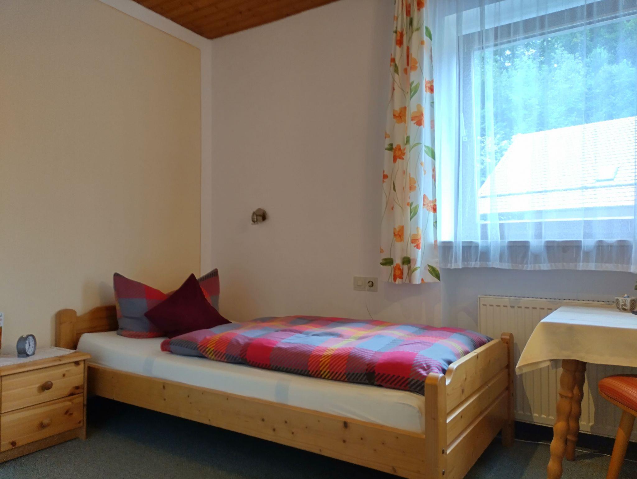 Unser helles Einzelzimmer bietet Ihnen eine angenehme Atmosphäre mit Teppichboden für ein wohnliches Ambiente. Ausgestattet mit einem Flat-TV mit Kabelfernsehen, kostenloses W-LAN und ein kleiner Tisch lädt zum Arbeiten oder Entspannen ein – ideal für eine ruhige Auszeit. Das private Badezimmer mit Dusche/WC und einem Fön, haben Sie alle Annehmlichkeiten für einen komfortablen Aufenthalt. Gerne dürfen Sie gegen Aufpreis einen Hund mitbringen.