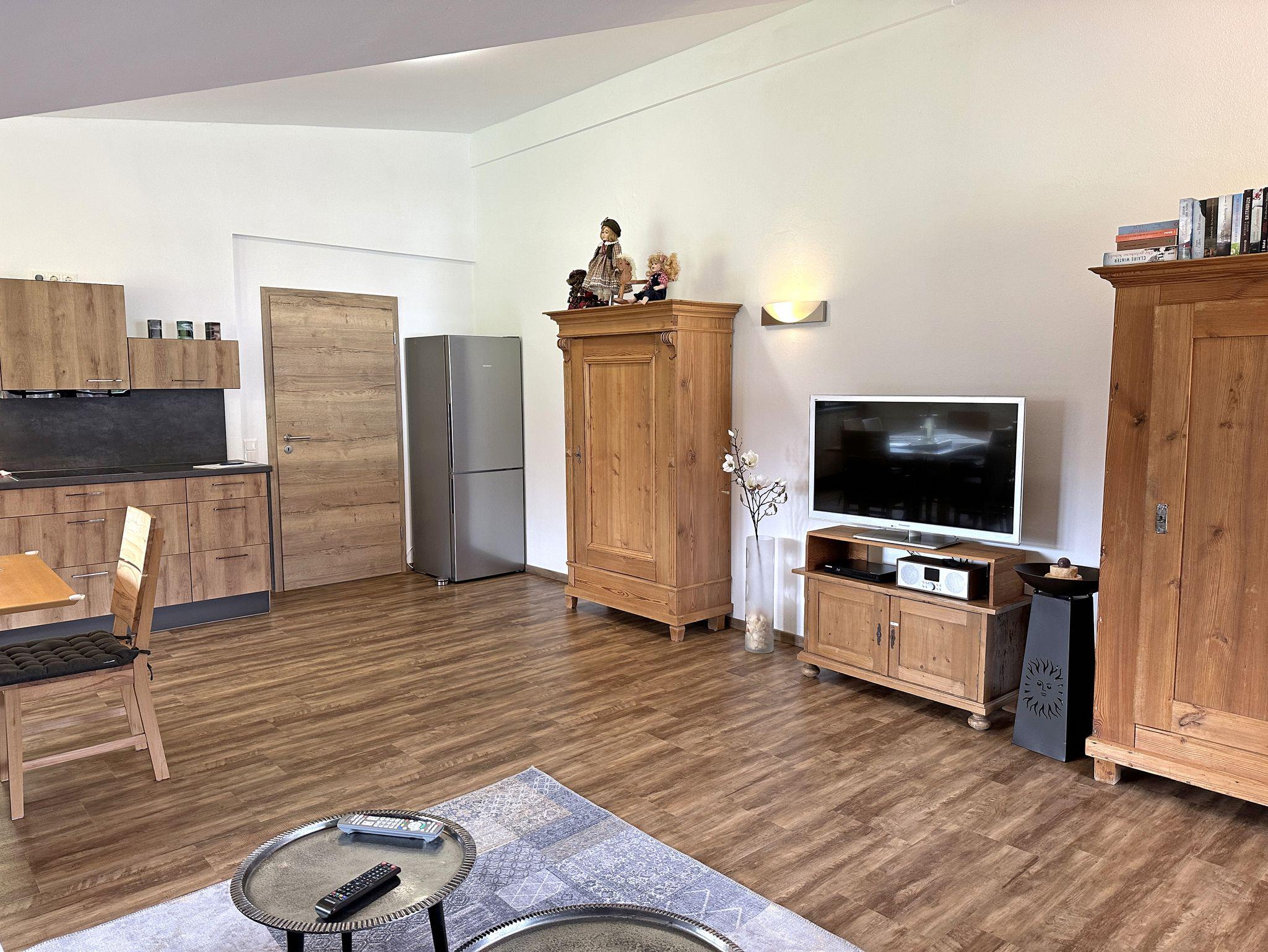 Sehr ruhig gelegene Ferienwohnung im 1. Stock, 73 qm mit teilweise leichter Mansarde und schönem Balkon mit Abendsonne. Die geräumige Wohnung verfügt über ein Schlafzimmer, ein Badezimmer mit Fenster, Dusche und Badewanne, Fön, sowie 2024 durch eine Gaube komplett neugestalteten, großen Wohnraum mit erweiterter Küche, Ess- und Wohnzimmer und neuem Vinylboden.