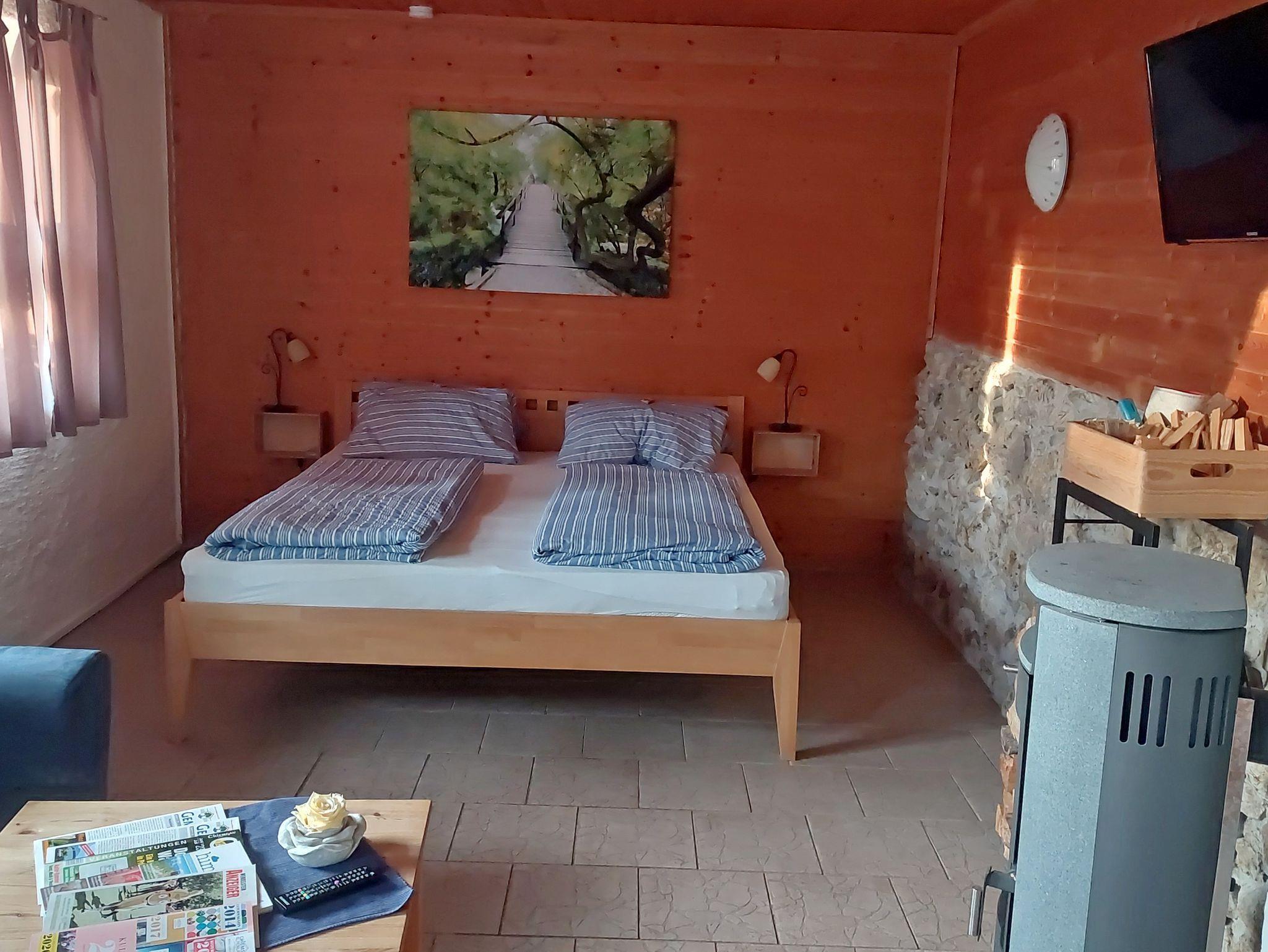 Liebevoll eingerichtete Nichtraucher-Ferienwohnung 46 qm mit Terrasse. Der offene Wohn-/Schlafraum mit Fußbodenheizung hat ein Doppelbett, eine Couch, eine Sitzecke, SAT-TV, kostenloses WLAN und einen Schwedenofen (1 x Holz zum Einheizen vorhanden). Die offene Küche ist vollausgestattet mit 2-Platten-Herd, Mikrowelle und Kühlschrank. Badezimmer mit Dusche/WC und Fön. Durch die Hanglage ist kein ebenerdiger Zugang zur Wohnung möglich, sie müssen ein kleines Stück über eine Stufe, bergab bis zum Eingang der Ferienwohnung. Unsere Ferienwohnung ist durch die Hanglage eine Souterrain-Wohnung und Sie haben eine Sonnenterrasse. Gerne darf auf der Terrasse geraucht werden.