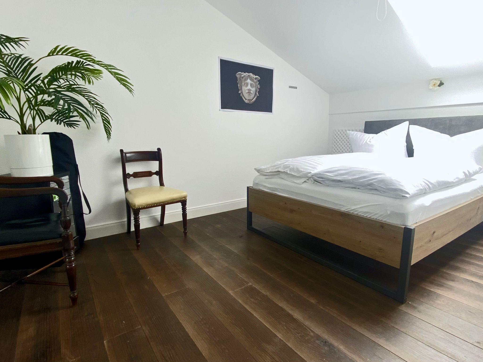 Ein moderner Wohnraum mit offener Küche und Holzboden lädt zum Wohlfühlen ein. Der Wohnraum ist großzügig gestaltet und bietet einen Esstisch, Couch und kostenloses WLAN. Die offene Küche ist mit einem Herd/Backofen, Geschirrspüler, Kühlschrank/Tiefkühlfach, Toaster und Wasserkocher sehr gut ausgestattet. Unser Bad ist ein mit Marmor gefliestes Badezimmer mit Fön, Dusch-/Badewanne und WC. Sie schlafen in einem separaten Schlafzimmer mit einem Doppelbett 1,80 m x 2 m.