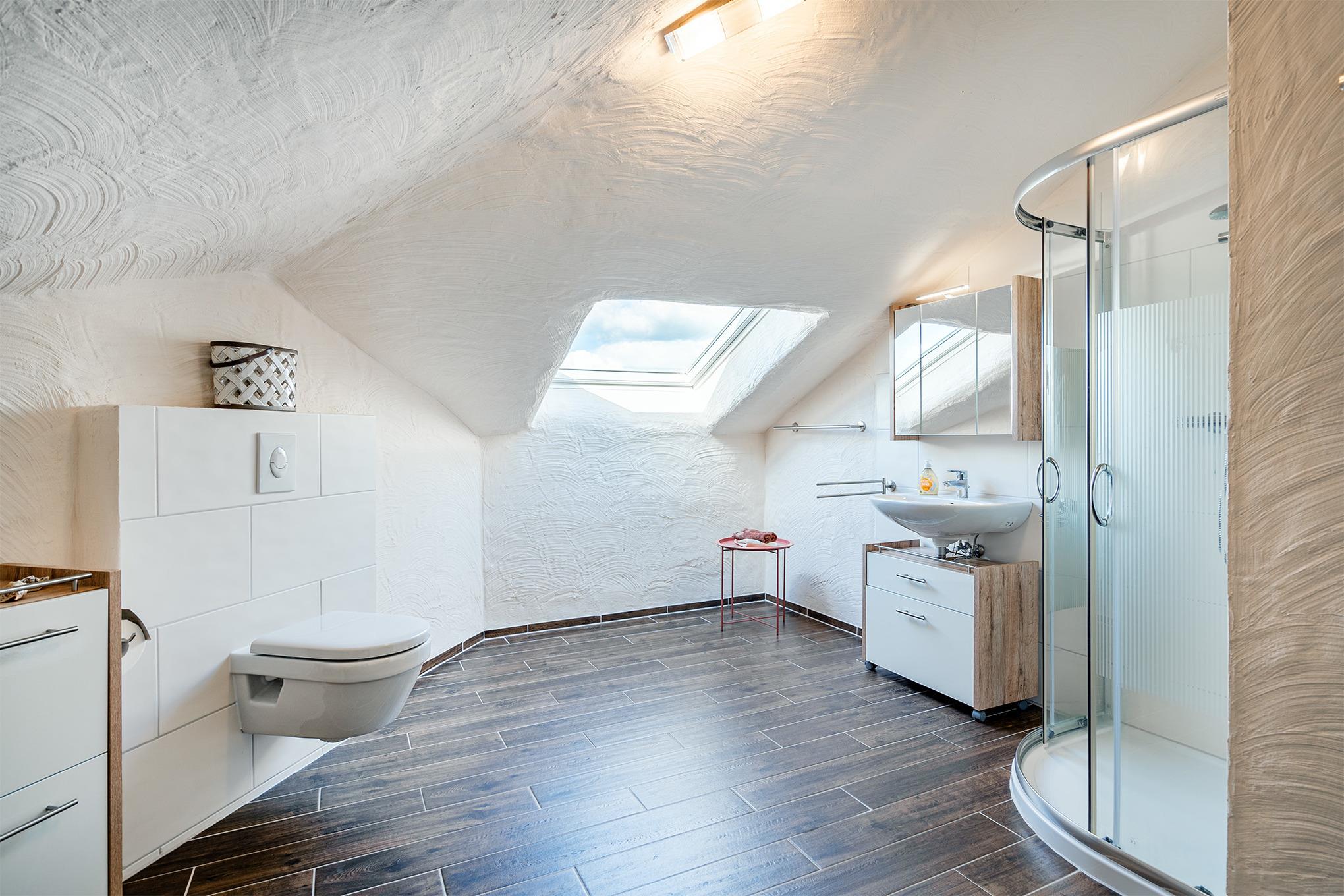 Badezimmer: Das Badezimmer ist geräumig und komfortabel mit WC und Dusche ausgestattet.