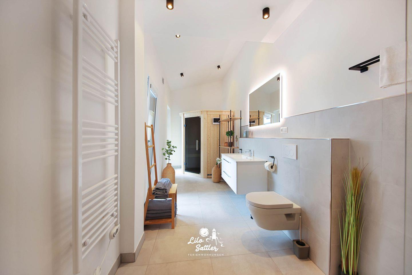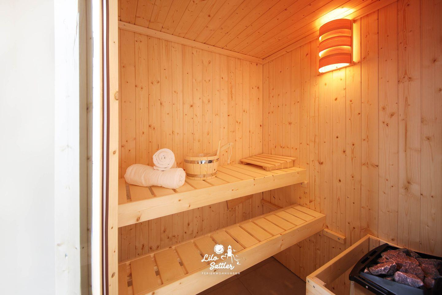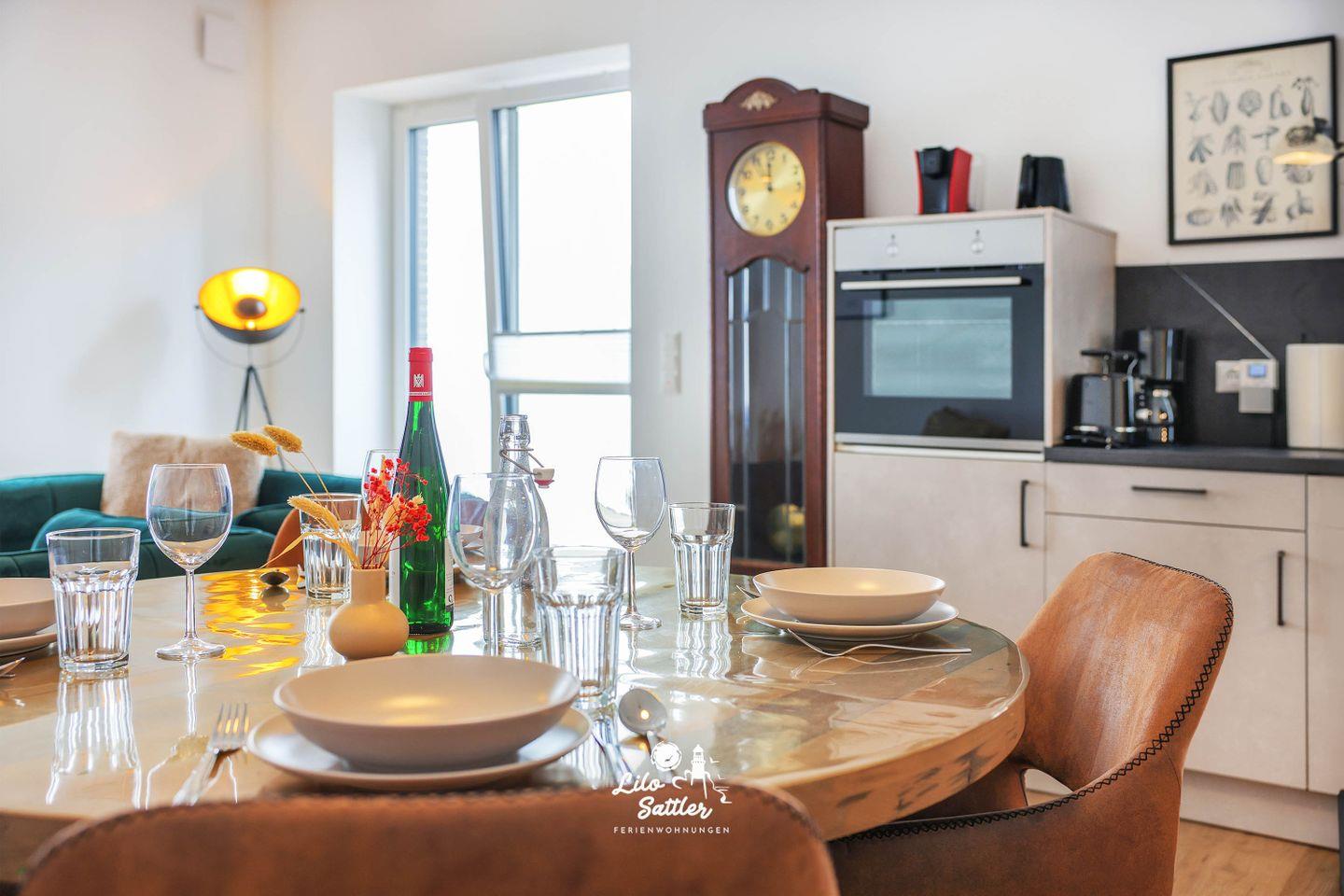 Zwei separate Schlafzimmer - jeweils mit Boxspringbetten - schaffen angenehme Rückzugsorte - ideal für Paare, Familie oder Freunde. Im Tageslichtbad sorgt eine bodengleiche Dusche für bequemen Komfort; zusätzlich steht ein separates Gäste-WC bereit. Ihr privates Wellness-Highlight ist die eigene Sauna – perfekt nach Wind und Wellen. Die voll ausgestattete Küche mit Ceran-Kochfeld, Backofen, Geschirrspüler, Kühlschrank mit Gefrierfach sowie Kaffeemaschine und Tassimo macht Selbstversorgung leicht, ob für das schnelle Frühstück oder den langen Kochabend.