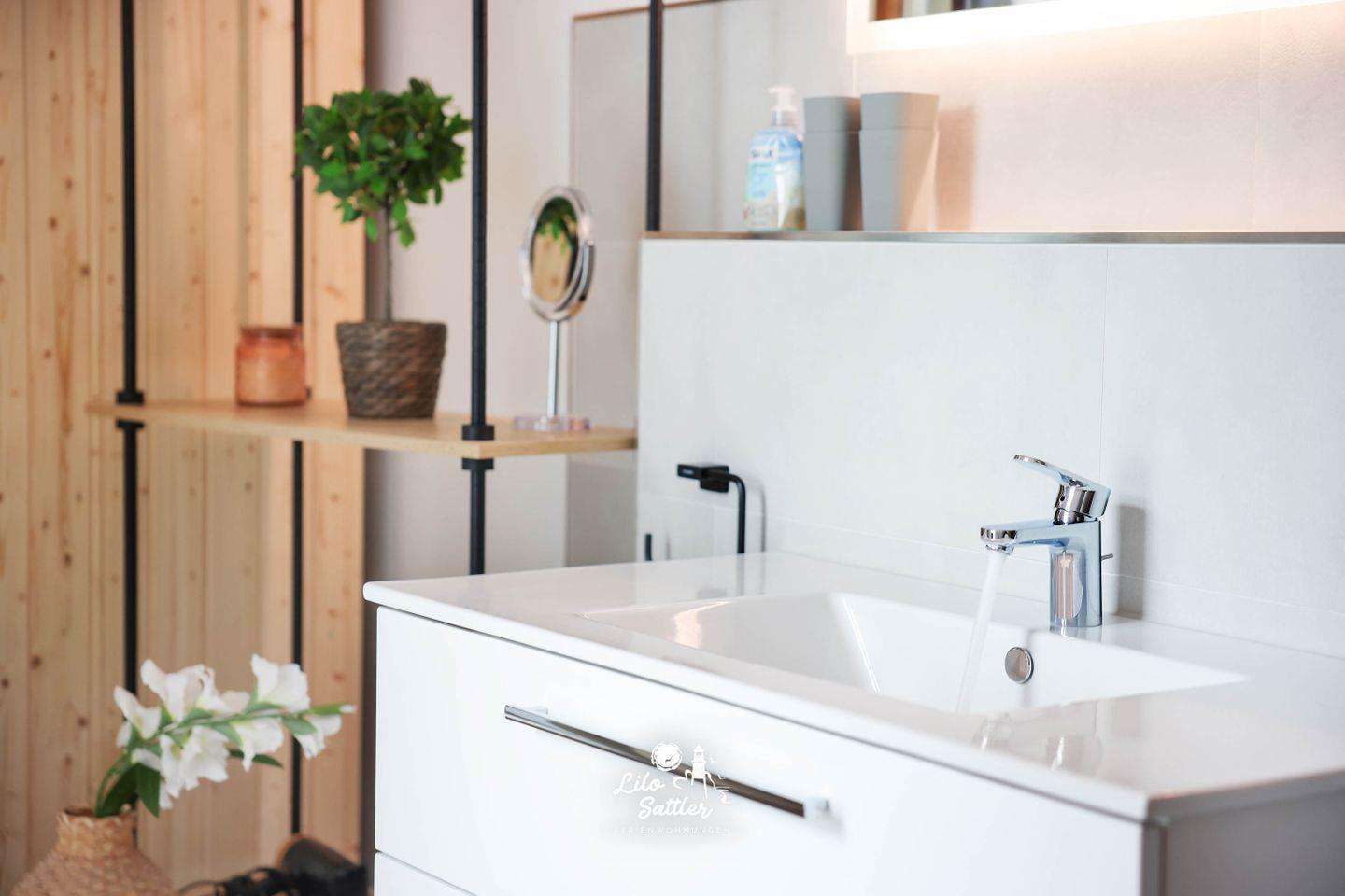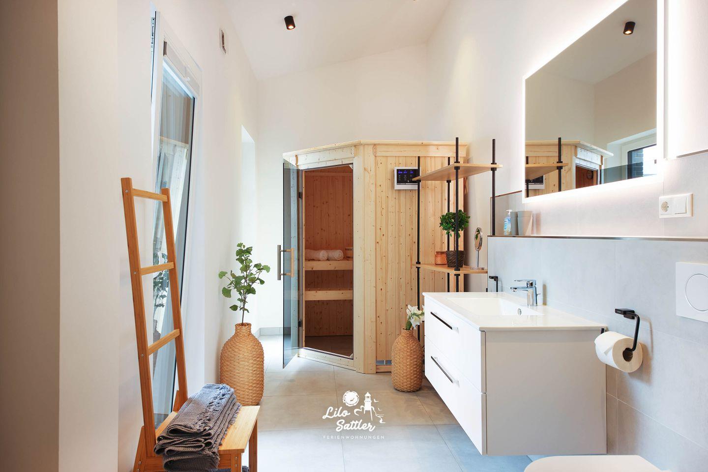 Bodentiefe Dusche, WC, Waschbecken mit Unterschrank, Spiegel, Fön, Fenster, Abluft, Holzofen-Sauna, Zugang zur Terrasse, Duschhocker