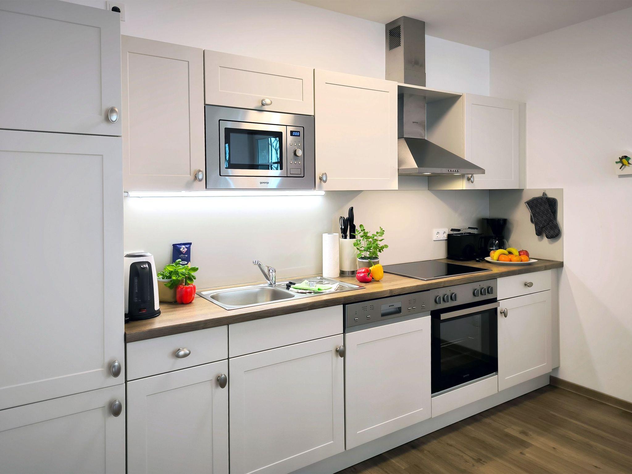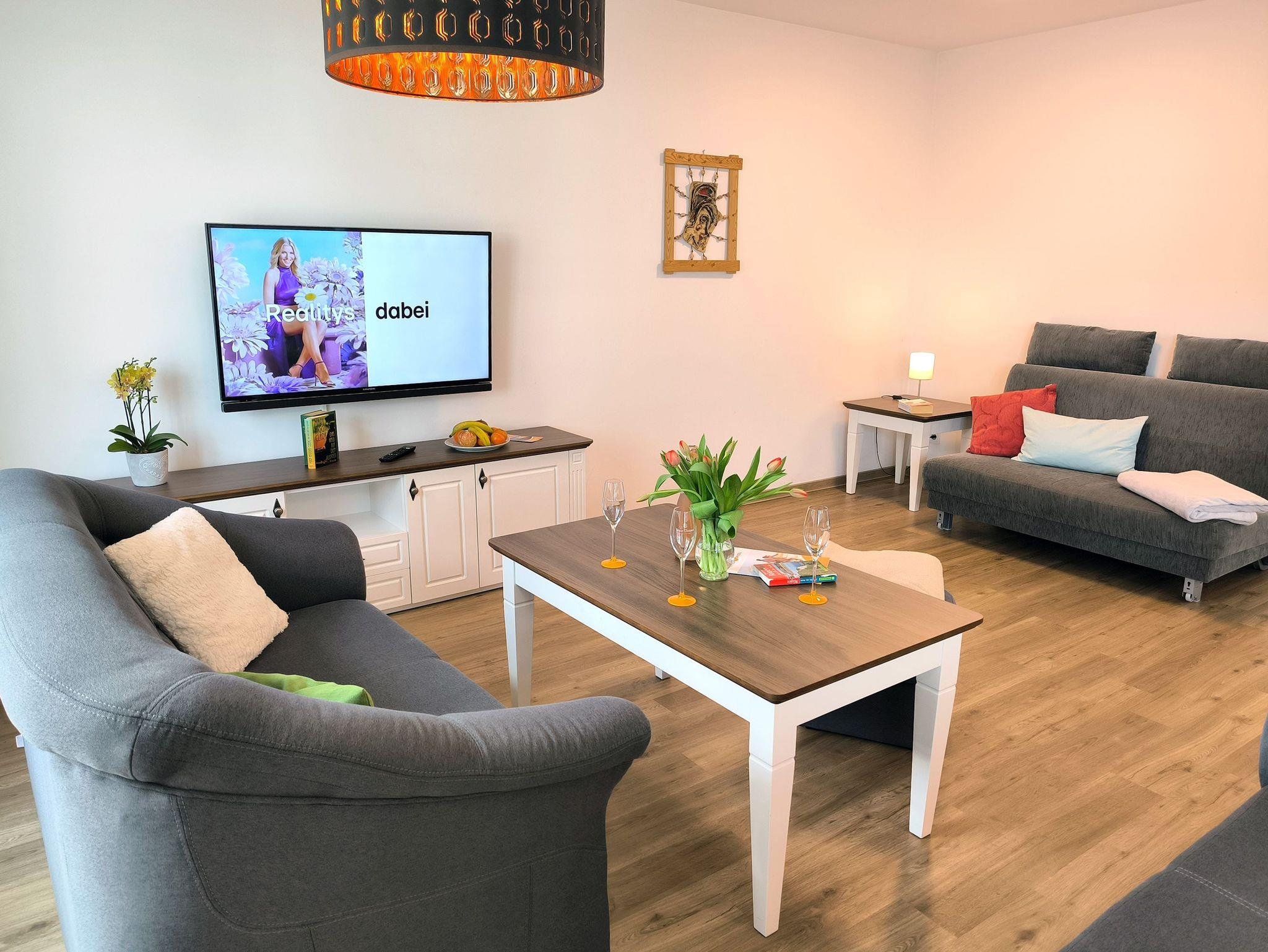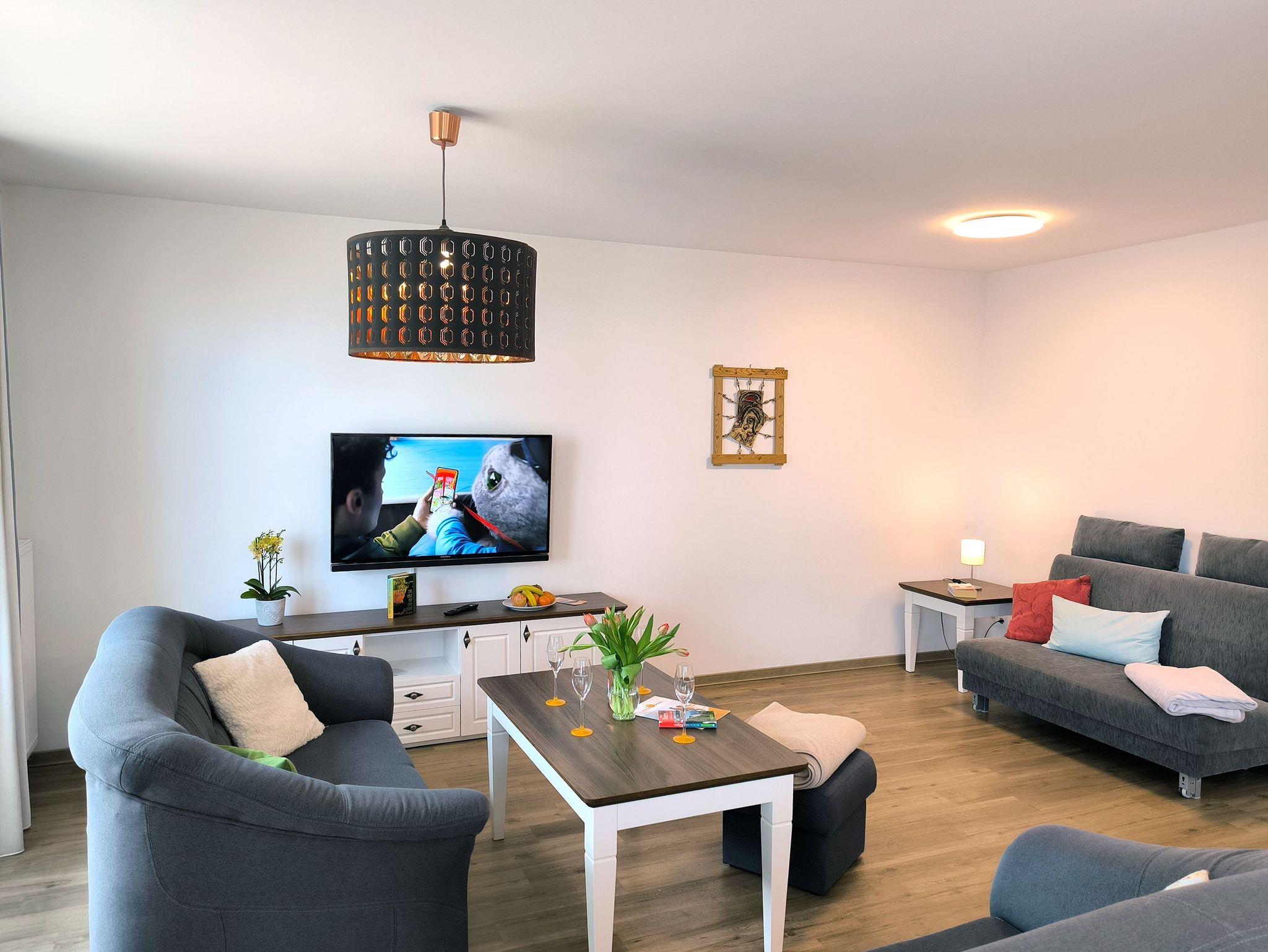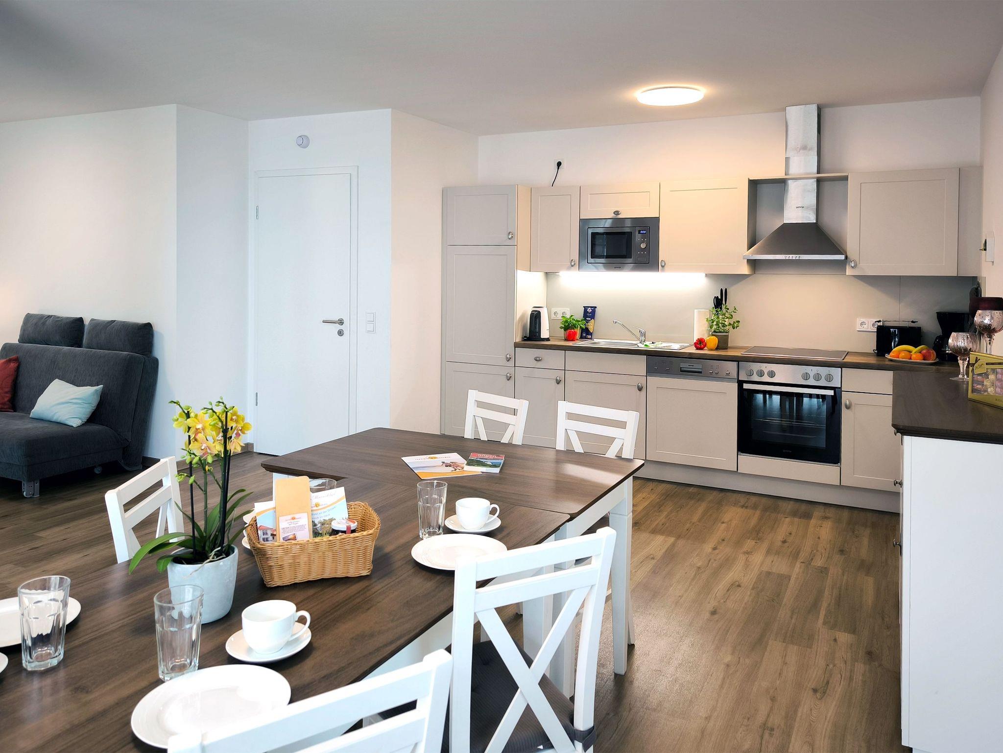 Es gibt 1 Doppelschlafzimmer und ein Zimmer mit 2 Einzelbetten und ein komfortables Schlafsofa im Wohnbereich und eine Küchenzeile mit Geschirrspülmaschine, Backofen, 4 Platten Ceranherd etc. Besonderer Komfort ist durch die 2 Bäder gegeben , eines mit Badewanne und eines mit Dusche. So können hier bequem bis zu 6 Personen übernachten.