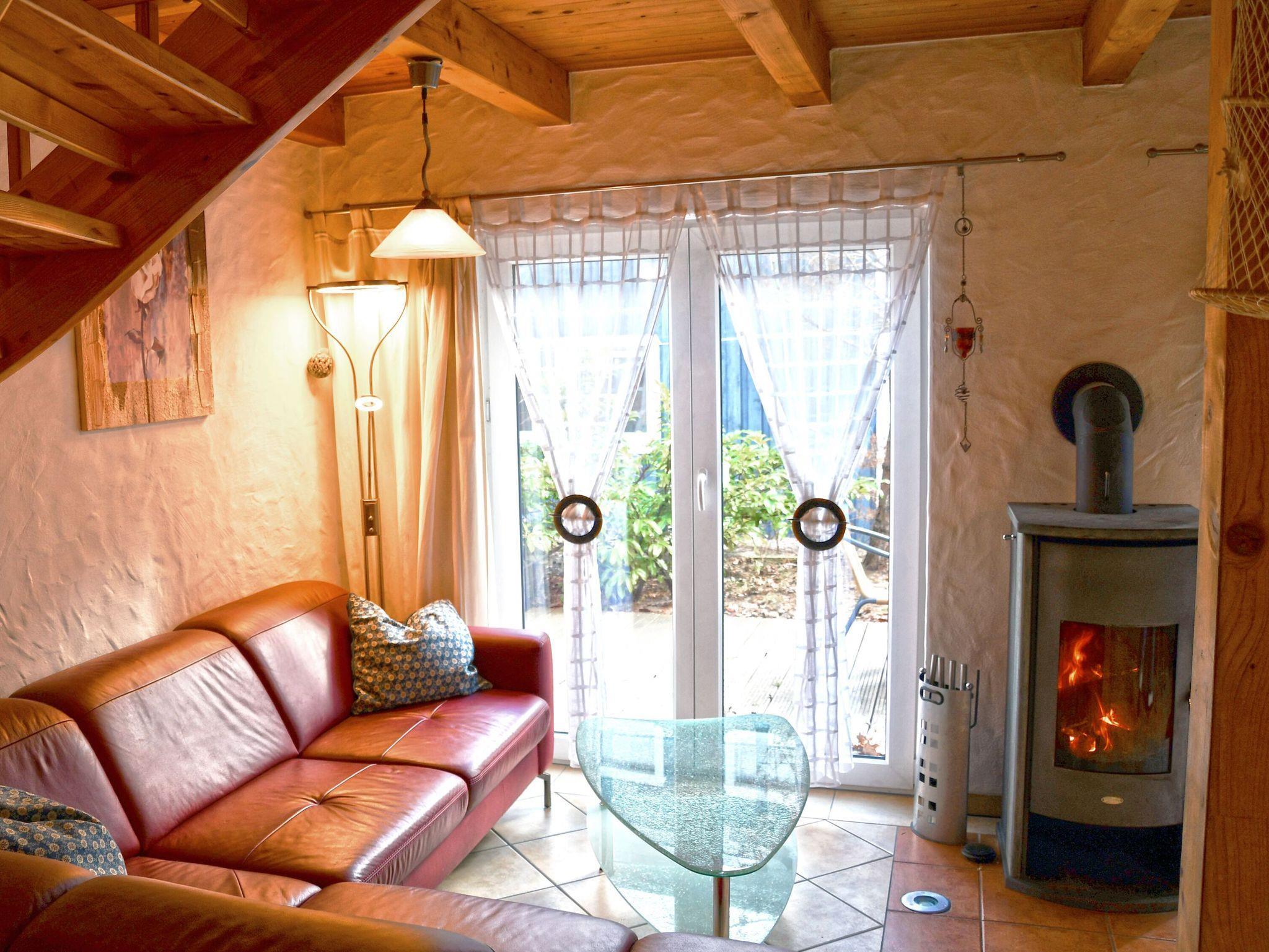 Im Erdgeschoss dominiert das geräumige Wohn- und Esszimmer mit integrierter Küchenzeile, Kaminofen und vorgelagerter Terrasse. Für mediale Unterhaltung sorgen ein großformatiger Flatscreen-TV und kostenfreies W-LAN, auch eine kleine Buch- und Spieleauswahl ist vorhanden.